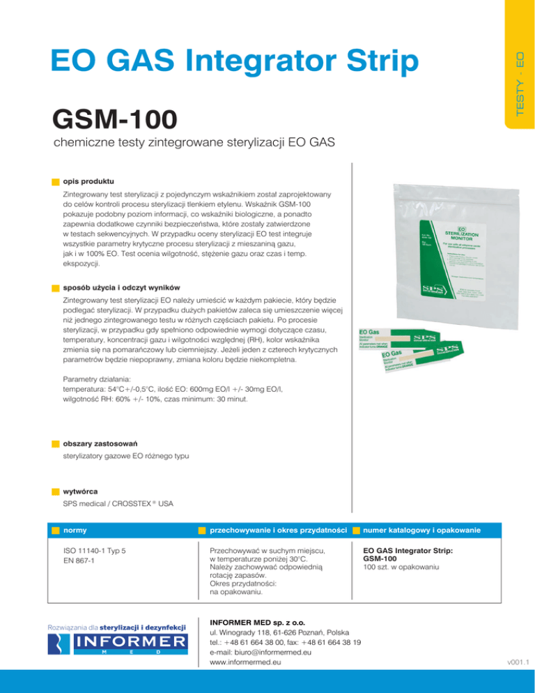 GSM-100 chemiczne testy zintegrowane sterylizacji EO GAS opis produktu Zintegrowany test sterylizacji z pojedynczym wskaźnikiem został zaprojektowany do celów kontroli procesu sterylizacji tlenkiem etylenu. Wskaźnik GSM-100 pokazuje podobny poziom informacji, co wskaźniki biologiczne, a ponadto zapewnia dodatkowe czynniki bezpieczeństwa, które zostały zatwierdzone w testach sekwencyjnych. W przypadku oceny sterylizacji EO test integruje wszystkie parametry krytyczne procesu sterylizacji z mieszaniną gazu, jak i w 100% EO. Test ocenia wilgotność, stężenie gazu oraz czas i temp. ekspozycji. sposób użycia i odczyt wyników Zintegrowany test sterylizacji EO należy umieścić w każdym pakiecie, który będzie podlegać sterylizacji. W przypadku dużych pakietów zaleca się umieszczenie więcej niż jednego zintegrowanego testu w różnych częściach pakietu. Po procesie sterylizacji, w przypadku gdy spełniono odpowiednie wymogi dotyczące czasu, temperatury, koncentracji gazu i wilgotności względnej (RH), kolor wskaźnika zmienia się na pomarańczowy lub ciemniejszy. Jeżeli jeden z czterech krytycznych parametrów będzie niepoprawny, zmiana koloru będzie niekompletna. Parametry działania: temperatura: 54°C+/-0,5°C, ilość EO: 600mg EO/l +/- 30mg EO/l, wilgotność RH: 60% +/- 10%, czas minimum: 30 minut. obszary zastosowań sterylizatory gazowe EO różnego typu wytwórca SPS medical / CROSSTEX ® USA normy przechowywanie i okres przydatności numer katalogowy i opakowanie ISO 11140-1 Typ 5 EN 867-1 Przechowywać w suchym miejscu, w temperaturze poniżej 30°C. Należy zachowywać odpowiednią rotację zapasów. Okres przydatności: na opakowaniu. EO GAS Integrator Strip: GSM-100 100 szt. w opakowaniu Rozwiązania dla sterylizacji i dezynfekcji INFORMER MED sp. z o.o. ul. Winogrady 118, 61-626 Poznań, Polska tel.: +48 61 664 38 00, fax: +48 61 664 38 19 e-mail: [email protected] www.informermed.eu v001.1