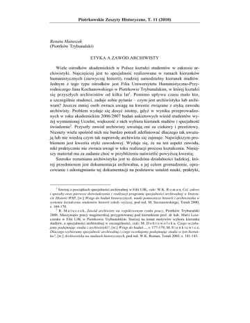 Piotrkowskie Zeszyty Historyczne, T. 11 (2010) Renata Matuszak (Piotrków Trybunalski) ETYKA A ZAWÓD ARCHIWISTY Wiele ośrodków akademickich w Polsce kształci studentów w zakresie archiwistyki. Najczęściej jest to specjalność realizowana w ramach kierunków humanistycznych (zazwyczaj historii), rzadziej samodzielny kierunek studiów. Jednym z tego typu ośrodków jest Filia Uniwersytetu Humanistyczno-Przyrodniczego Jana Kochanowskiego w Piotrkowie Trybunalskim, w której kształci się przyszłych archiwistów od kilku lat1. Pomimo upływu czasu mało kto, a szczególnie studenci, zadaje sobie pytanie – czym jest archiwistyka lub archiwum? Jeszcze mniej osób zwraca uwagę na kwestie związane z etyką zawodu archiwisty. Problem wydaje się dosyć istotny, gdyż w wyniku przeprowadzonych w roku akademickim 2006/2007 badań ankietowych wśród studentów wyżej wymienionej Uczelni, większość z nich wybiera kierunek studiów i specjalność świadomie2. Przyszły zawód archiwisty uważają oni za ciekawy i prestiżowy. Niestety wielu spośród nich nie bardzo potrafi zdefiniować dlaczego tak uważają lub nie wiedzą czym tak naprawdę archiwista się zajmuje. Największym problemem jest kwestia etyki zawodowej. Wydaje się, że na ten aspekt zawodu, nikt praktycznie nie zwraca uwagi w toku realizacji procesu kształcenia. Niniejszy materiał ma za zadanie choć w przybliżeniu naświetlić powyższą kwestię. Szeroko rozumiana archiwistyka jest to dziedzina działalności ludzkiej, której przedmiotem jest dokumentacja archiwalna, a jej celem gromadzenie, opracowanie i udostępnianie tej dokumentacji na podstawie ustaleń nauki, praktyki, 1 Szerzej o początkach specjalności archiwalnej w Filii UJK, vide: W.K. R o m a n, Cel, zakres i sposoby oraz pierwsze doświadczenia z realizacji programu specjalności archiwalnej w Instytucie Historii WSP, [w:] Wstęp do badań historycznych, nauki pomocnicze historii i archiwistyka w systemie kształcenia studentów historii szkoły wyższej, pod red. M. Szczurowskiego, Toruń 2000, s. 164-170. 2 R. M a t u s z a k, Zawód archiwisty na współczesnym rynku pracy, Piotrków Trybunalski 2008. Maszynopis pracy magisterskiej przygotowanej pod kierunkiem prof. dr hab. Marii Leszczenko w Filii UJK w Piotrkowie Trybunalskim. Szerzej na temat motywów wyboru kierunku studiów, a specjalności archiwalnej w szczególności, vide: M. D o b r o w o l s k a, Czego oczekujemy podejmując studia z archiwistyki?, [w:] Wstęp do badań…, s. 177-179; M. S i e n k i e w i c z, Dlaczego wybieramy specjalność archiwalną i czego oczekujemy podejmując studia w tym kierunku?, [w:] Archiwistyka na studiach historycznych, pod red. W.K. Roman, Toruń 2003, s. 141-143. R. M a t u s z a k organizacji oraz zarządzania3. Inaczej można również powiedzieć, że archiwistyka to całokształt działalności, której przedmiotem są archiwa oraz materiały archiwalne. Archiwistyka to także obecnie samodzielna dyscyplina naukowa, której przedmiotem są archiwa oraz materiały archiwalne rozpatrywane z punktu widzenia zachodzących pomiędzy nimi związków, powstających w trakcie procesów archiwotwórczych4. Archiwistyka jako nauka ma oczywiście swój przedmiot i zakres badań5. W ramach tej definicji należy zwrócić szczególną uwagę na definicję archiwum, gdyż z tym terminem jest związana bezpośrednio etyka grupy zawodowej, jaką stanowią archiwiści. Wobec powyższego, czym jest więc archiwum? Archiwum jest terminem wieloznacznym, w zależności pod jakim kątem będzie rozpatrywane. Sam termin wywodzi się z języka greckiego archeion, którym oznaczano budynek będący siedzibą władzy. W średniowieczu nazwą tą określano skrzynię lub inne zabezpieczone miejsce (np. skarbiec, ratusz), w którym składano i przechowywano akta publiczne6. Obecnie jest to przede wszystkim instytucja o charakterze urzędu administracyjnego, inaczej urzędu wiary publicznej oraz placówki naukowej powołanej do kształtowania, zabezpieczania, gromadzenia, opracowywania oraz trwałego przechowywania i udostępniania materiałów archiwalnych. Jest to instytucja uprawniona do wydawania na podstawie zgromadzonych dokumentów uwierzytelnionych odpisów, wypisów, wyciągów i kopii, a także do publikowania źródeł i pomocy archiwalnych oraz prowadzenia badań w dziedzinie archiwistyki7. Archiwum, to także komórka organizacyjna instytucji powołana do przejmowania, przechowywania, porządkowania i zabezpieczania materiałów archiwalnych tej instytucji. Komórka organizacyjna, jaką obok wielu innych jest archiwum zakładowe, również nazywane jest archiwum przejściowym, archiwum wielozakładowym lub wyodrębnionym o powierzonym zasobie archiwalnym. Archiwum to także, po prostu gmach lub lokal stanowiący pomieszczenie archiwum oraz zespół, grupa zespołów lub zbiór archiwalny powstały na skutek działalności urzędu, instytucji, organizacji 3 Archiwistyka praktyczna dla archiwistów zakładowych, pod red. S. Kłysa, Poznań 1986, s. 19. 4 Polski słownik archiwalny, pod red. W. Maciejewskiej, Warszawa 1974, s. 19. B. R y s z e w s k i, Archiwistyka. Przedmiot, zakres, podział (Studia nad problemem), Warszawa-Poznań 1972; Idem, problemy i metody badawcze archiwistyki, Toruń 1985. Zob. również przewodniki metodyczne, np.: A. T o m c z a k, Rozwój form kancelaryjnych i współczesne rodzaje materiałów archiwalnych. Przewodnik metodyczny, Poznań 1978; B. R y s z e w s k i, Archiwistyka. Przewodnik metodyczny, Poznań 1979. 6 Archiwistyka praktyczna…, s. 18. 7 Polski słownik…, s. 19. Por.: Cz. K o l a r z, Archiwa zakładowe i składnice akt. Poradnik, Bydgoszcz 2002, s. 12. 5 208 Etyka a zawód archiwisty a zwłaszcza rodu, rodziny lub osoby fizycznej (zob.: archiwum podworskie, prywatne lub spuścizna)8. Mówiąc o archiwach, mamy najczęściej na myśli archiwa państwowe, które wypełniają zadania zdefiniowane powyżej i tworzą 