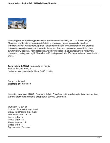 Domy Kalisz okolice Ref : 3392WD Nowe Skalmier Do wynajęcia nowy dom typu bliźniak o powierzchni użytkowej ok. 140 m2 w Nowych Skalmierzycach. Nieruchomość mieści się w spokojnej części, na osiedlu domków jednorodzinnych. Układ domu: parter - przestronny salon, aneks kuchenny, wc, pralnia z kotłownią, wiatrołap; piętro: trzy pokoje, łazienka. Budynek ogrzewany centralnie - piec dwufunkcyjny gazowy. Pomieszczenia w pełni wyposażone, zaaranżowane z niebywałą dbałością o każdy szczegół. Nieruchomość dostępna od ręki. Zachęcam do zapoznania się z ofertą. Cena najmu 2.800 zł plus opłaty za media Kaucja zwrotna 5.000 zł Jednorazowa prowizja dla biura 2.800 zł netto Gorąco polecam! Dagmara 501 68 48 17 Licencja zawodowa 17060 - Dagmara Jeżyk. Powyższy opis ma charakter informacyjny i nie stanowi oferty w rozumieniu przepisów Kodeksu Cywilnego. Wynajem : 2 800 zł Czynsz : Skonsultuj się z nami Opłaty : Skonsultuj się z nami Pow. użytkowa : 140 m² Liczba pokoi : 4 Liczba pięter : 2 Liczba łazienek : 1 Liczba toalet : 1 Ogrzewanie : Gazowe 1/2 Domy Kalisz okolice Ref : 3392WD Nowe Skalmier Adres : Nowe Skalmierzyce, KALISZ OKOLICE http://www.destino.org.pl/index.php?view=properties&id=3353%3Adom-typu-bliniak-do-wynajcia -nowe-skalmierzyce-2800-z&option=com_jea&Itemid=6 2/2