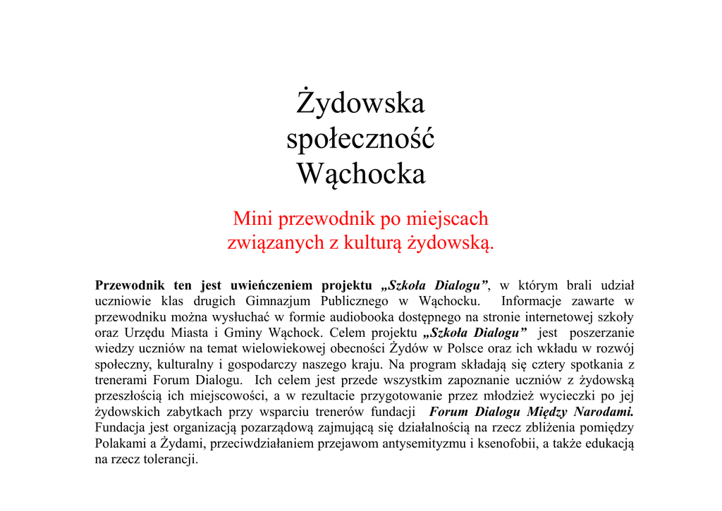 Żydowska społeczność Wąchocka Mini przewodnik po miejscach związanych z kulturą żydowską. Przewodnik ten jest uwieńczeniem projektu „Szkoła Dialogu”, w którym brali udział uczniowie klas drugich Gimnazjum Publicznego w Wąchocku. Informacje zawarte w przewodniku można wysłuchać w formie audiobooka dostępnego na stronie internetowej szkoły oraz Urzędu Miasta i Gminy Wąchock. Celem projektu „Szkoła Dialogu” jest poszerzanie wiedzy uczniów na temat wielowiekowej obecności Żydów w Polsce oraz ich wkładu w rozwój społeczny, kulturalny i gospodarczy naszego kraju. Na program składają się cztery spotkania z trenerami Forum Dialogu. Ich celem jest przede wszystkim zapoznanie uczniów z żydowską przeszłością ich miejscowości, a w rezultacie przygotowanie przez młodzież wycieczki po jej żydowskich zabytkach przy wsparciu trenerów fundacji Forum Dialogu Między Narodami. Fundacja jest organizacją pozarządową zajmującą się działalnością na rzecz zbliżenia pomiędzy Polakami a Żydami, przeciwdziałaniem przejawom antysemityzmu i ksenofobii, a także edukacją na rzecz tolerancji. INFORMACJE O PRZEDWOJENNEJ SPOLECZNOŚCI ŻYDOWSKIEJ WĄCHOCKA W końcu XVIII wieku w Wąchocku zaczęła osiedlać się ludność żydowska. W okresie Królestwa Polskiego ludność żydowska żyła pod presją wysiedlenia. W 1827 roku mieszkało w Wąchocku 63 Żydów, co stanowiło 6,3% mieszkańców. Żydzi wąchoccy kilkakrotnie czynili próby utworzenia swojej gminy wyznaniowej. Dopiero 12 sierpnia 1911 roku formalnie rozpoczęła działalność w Wąchocku żydowska gmina, utworzona z części iłżeckiego okręgu bóźniczego. W 1921 roku w Wąchocku było 468 Żydów, co stanowiło 19,6% mieszkańców. Wąchocka gmina wyznaniowa nie przetrwała zbyt długo. Wskutek nacisków administracyjnych w roku 1929 Żydzi wąchoccy zdecydowali, aby włączyć ich do gminy w Wierzbniku. W okresie międzywojennym do ludności żydowskiej w Wąchocku należał również plac z murowaną bóżnicą i mykwa (łaźnia rytualna). We wrześniu 1939 roku w Wąchocku było 450 Żydów. W październiku 1942 i roku wzrosła ich liczba do ponad 500, głównie wskutek przesiedleń z innych miejscowości. 22 października tego roku Żydów wąchockich wypędzono do Starachowic, skąd wywieziono ich koleją na zagładę do Treblinki. Z obiektów należących do społeczności żydowskiej w Wąchocku zachowały się resztki bóżnicy przy ulicy Kolejowej i cmentarz. Miał on w okresie międzywojennym powierzchnię 2500 m2 i był ogrodzony kamiennym murem, którego zachowały się do naszych czasów jedynie fragmenty. 1. Przedwojenna szkoła w Wąchocku - na jej miejscu znajduje się obecna szkoła podstawowa, obok gimnazjum przy ulicy Kościelnej. Do tej szkoły przed wojną uczęszczali zarówno Żydzi jak i Polacy. Z relacji starszych mieszkańców Wąchocka wynika, że klasy liczyły około 15 uczniów, a wśród nich było 5 Żydów. W tej szkole wszystkie dzieci uczyły się języka polskiego. Języki jidisz i hebrajski dzieci żydowskie poznawały w świątyniach. 2. Kolejnym punktem jest Rynek w Wąchocku, na którym znajdowały się liczne sklepy żydowskie. Oprócz swoich sklepów dookoła rynku, Żydzi mieli stoiska na targowisku. Handel odbywał się tam prawie we wszystkie dni tygodnia. Sprzedawały zarówno kobiety jak i mężczyźni. Mieli oni wrodzony talent do handlu. Według wspomnień pani Natalii- mieszkanki Węglowa - które udało nam się zdobyć. Żydzi rozkładali swoje stragany i reklamowali je. Sprzedawali np. igły, nici, agrafki – targując się przy tym. W zimę, podczas mrozów, grzali sobie ręce przy rozżarzonych węgielkach włożonych w saganki. W rynku i przylegających do niego uliczkach stało wiele żydowskich domów. Wśród mieszkańców byli: krawiec, szewc, fryzjer… Żydzi wędrowali po okolicznych wsiach, kupując od rolników cielęta, drób, masło i warzywa aby sprzedać je z dobrym zyskiem. Na rynku znajdowała się również jatka - sklep mięsny z koszernym mięsem, a zarazem dom rzezaka, czyli osoby wyznaczonej do zabijania zwierząt na posiłek. Kierował się on zasadą koszerności. 3. Największe skupiska domów żydowskich znajdowały się na ulicy Wielkowiejskiej. Tam Żydzi zamieszkiwali swe kwatery do najazdu Niemców w 1939 roku. Wtedy żydzi zostali wywiezieni do getta w Starachowicach. Mieszkała tam Kapeluśniczka czyli pani, która miała duży kapelusz i duży kosz na ręce. Sprzedawała obarzanki i tabakę. Frojen był żydowskim krawcem. Gdy wybuchła wojna przebywał na Węglowie. Szył on potajemnie ubrania dla mieszkańców, płaszcze dla kobiet, dzieci, mężczyzn z koców oraz płaszczy wojennych. Na ulicy Wielkowiejskiej mieszkali również Mordek, który był właścicielem i sprzedawcą w sklepie mięsnym. Hajusia sprzedawała piękne tkaniny na sukienki, a Mendlówka prowadziła sklep spożywczy oraz rozdawała dzieciom słodycze. Właścicielką piekarni na ulicy Kolejowej była Tajwa. 4. Synagoga to żydowski dom modlitwy a także miejsce zebrań społecznych gminy żydowskiej. Synagoga w Wąchocku mieściła się przy ulicy Kolejowej. Była podzielona na dwie części: parter dla mężczyzn, piętro dla kobiet czyli babiniec. Było to osobne pomieszczenie dla kobiet przylegające do głównej sali i oddzielone od niej ścianą nazywaną mechica, lub w większych bożnicach umieszczone w galerii na piętrze, z którego kobiety mogły obserwować całe wnętrze. Na ścianach nie było żadnych ozdób. Był to punkt codziennych odwiedzin Żydów. Najważniejszym elementem synagogi są zwoje Tory - pergamin z zapisanymi pierwszymi pięcioma księgami Biblii. Synagoga w Wąchocku w czasie II Wojny Światowej została zniszczona. Obecnie Synagoga jest ruiną. Mykwa została całkowicie zburzona. 5. Cmentarz Żydowski czyli Kirkut znajduje się przy ulicy Krzemienica, przy torach kolejowych. Obiekt został zni
