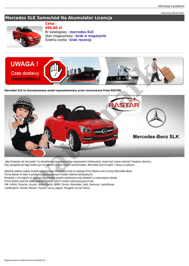 Informacje o produkcie Utworzono 06-03-2017 Mercedes SLK Samochód Na Akumulator Licencja Cena : 696,80 zł er m ar k Nr katalogowy : mercedes.SLK Stan magazynowy : brak w magazynie Średnia ocena : brak recenzji at Mercedes SLK to licencjonowany model wyprodukowany przez renomowaną firmę RASTAR. „Bez Gwiazdy nie ma jazdy” to określenie znane wszystkim pasjonatom motoryzacji, może być znane również Twojemu dziecku. Gdy zasiądzie do tego autka już nie będzie chciało innych samochodów. Mercedes SLK to sport i luksus w jednym. w Idealnie oddany każdy kształt prawdziwego Mercedesa SLK to zasługa firmy Rastar oraz licencji Mercedes-Benz. Firma Rastar to lider w produkcji ekskluzywnych modeli zdalnie sterowanych. Produkty z ich logiem to gwarancja wysokiej jakości wykonania oraz dbałości o najmniejsze detale. Firma Rastar wiernie odwzorowuje modele takich marek motoryzacyjnych jak: VW, Infiniti, Porsche, Lincoln, Aston Martin, BMW, Ferrari, Mercedes, Audi, Hummer, Land-Rover, Lamborghini, Honda, Nissan, Toyota, Lexus, Jaguar, Peugeot czy też Volvo. Wygenerowano w programie www.oscGold.com er m ar k Aby zagwarantować bezpieczeństwo podczas jazdy, Mercedes został wyposażony w pasy bezpieczeństwa, światła aby dziecko było widoczne przez innych użytkowników dróg i chodników, stabilne zawieszenie i solidną karoserię oraz napęd skonstruowany w taki sposób, aby samochód hamował już po zdjęciu nogi z gazu. Wygodę zapewni wyprofilowany fotel oraz gumowe koła tłumiące wstrząsy. Dla bezpieczeństwa Twojego malucha samochodem sterować możesz również zdalnie - do zestawu dołączony jest pilot. w at Specyfikacja pojazdu: - od 1 do 1,5h to czas jazdy tej super fury - żelowy akumulator 6V - waga ok. 16kg (można wziąć pod pachę) - prędkość ok. 3-4km/h - odpowiedni dla dzieci powyżej 3 roku życia - zawiera wejście MP3, efekty dźwiękowe - wygodne, wyprofilowane siedzenie z pasami bezpieczeństwa - oświetlenie - światła świecą podczas jazdy - koła z gumowym bieżnikiem, dzięki czemu jazda jest wygodna i komfortowa na każdym podłożu. - kluczyk do stacyjki, po jego przekręceniu usłyszymy ryk silnika - kierownica z klaksonem oraz efektami dźwiękowymi - włącznik umieszczony w stacyjce - wykonany w skali: 1:4 - akumulator należy ładować od 8 do 15 godzin (ważne aby nie ładować akumulatora powyżej 16 godzin) Zestaw zawiera: - samochód elektryczny - pilot zdalnego sterowania - akumulator - ładowarkę - oryginalne opakowanie er m ar k Informacje o produkcie w at Wymiary samochodu: 112,5 x 56,5 x 33 cm Samochód dostępny w kolorze białym, czarnym i czerwonym. Wygenerowano w programie www.oscGold.com