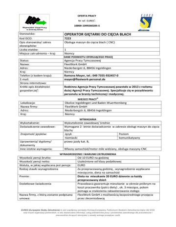 OFERTA PRACY i Nr ref. EURES : 10000-1099260205-S Stanowisko: OPERATOR GIĘTARKI DO CIĘCIA BLACH Kod ISCO: Opis stanowiska/ zakres obowiązków: Liczba etatów: Miejsce zatrudnienia – kraj: 7223 Obsługa maszyn do cięcia blach ( CNC) 1 Niemcy DANE PODMIOTU OFERUJĄCEGO PRACĘ Status: Nazwa: Adres: Kraj: Telefon (z kodem kraju): E-mail: Strona internetowa: Krótki opis działalności gospodarczejii: Agencja Pracy Tymczasowej FlexiWork GmbH Niederbergstr.6, 88456 Ingoldingen Niemcy Ramona Mayer, tel.: 049 7355-932457-0 [email protected] Rodzinna Agencja Pracy Tymczasowej powstała w 2013 z rozłamu dużej Agencji Pracy Tymczasowej. Specjalizuje się w pozyskiwaniu personelu w branży technicznej i medycznej. MIEJSCE PRACY iii Lokalizacja: Nazwa firmy: Adres: Kraj: Okolice Ingoldingen und Baden-Wuerttemberg FlexiWork GmbH Niederbergstr.6, 88456 Ingoldingen Niemcy Wykształcenie: Doświadczenie zawodowe: Wykształcenie zawodowe/ średnie Wymagane 2- letnie doświadczenie w zakresie obsługi maszyn do cięcia blachy Język Poziom niemiecki komunikatywny prawo jazdy kat. B, WYMAGANIA Znajomość języków: Uprawnienia/ dyplomy/ dokumenty Inne istotne wymagania: Własny samochód/motor mile widziany, obsługa maszyny CNC WYNAGRODZENIE I WARUNKI ZATRUDNIENIA Wysokość pensji brutto: Wysokość pensji netto: Waluta, w jakiej wypłacana jest pensja: Rodzaj stawki wynagrodzenia Premie: Dodatkowe świadczenia Nazwa firmy, z którą zostanie podpisana umowa: Od 10 EURO na godzinę Uzależnione od klasy podatkowej EURO Za przepracowaną godzinę , wynagrodzenie wypłacane miesięcznie, dieta na samochód Dieta na mieszkanie 20 EURO dziennie za każdy przepracowany dzień Pracodawca gwarantuje mieszkanie w okresie próbnym na koszt pracownika (patrz diety) , ok. 3 miesiące, potem pomaga w znalezieniu zakwaterowania stałego FlexiWork GmbH z możliwością bezpośredniego przejęcia przez zleceniodawcę EURES (Europejskie Służby Zatrudnienia) to sieć współpracy pomiędzy Komisją Europejską, Publicznymi Służbami Zatrudnienia krajów UE/ EOG oraz innych organizacji partnerskich, w celu dostarczania informacji, usług pośrednictwa pracy i poradnictwa zawodowego dla pracodawców i pracowników chcących skorzystać z zasady wolnego przepływu osób Rodzaj umowy: Wymiar czasu pracy Czas trwania umowy: Liczba godzin tygodniowo: Zmiany i praca w dni wolne: Data rozpoczęcia: Umowa o pracę na czas nieokreślony Praca na pełen etat, praca na zmiany nieokreślony 40h tygodniowo Do uzgodnienia z pracodawcą Jak najszybciej SPOSÓB SKŁADANIA WNIOSKU Wymagane dokumenty Język, w którym muszą być sporządzone przedkładane dokumenty: Do kogo należy wysłać dokumenty: CV w języku niemieckim Niemiecki Gdzie należy wysłać dokumenty: Dane teleadresowe doradcy EURES lub przedstawiciela pracodawcy: [email protected] Data publikacji: Termin przedkładania podań o pracę / zakończenia ważności oferty: Bezpośrednio do Doradcy EURES na wskazany adres email ze wskazaniem stanowiska pracy Agata Bajon – [email protected] Tel.: 68 456 77 07 Wojewódzki Urząd Pracy w Zielonej Górze Ul. Wyspiańskiego 15 Zielona Góra WAŻNOŚĆ 22.05.2013 Do odwołania Uprzejmie informujemy, że Agencja Pracy Tymczasowej FlexiWork GmbH oświadczyła, że działa zgodnie przepisami prawa obowiązującymi na terenie Niemiec. Uprzejmie informujemy, że skontaktujemy się wyłącznie z wybranymi kandydatami. UWAGA: Umowa z zagranicznym pracodawcą zostanie zawarta zgodnie z prawem kraju zatrudnienia. Oznacza to, że wszystkie roszczenia odnośnie do warunków, które obejmuje umowa, można kierować wyłącznie do odpowiedniego sądu w kraju zatrudnienia. Publiczne służby zatrudnienia (EURES) nie mogą pośredniczyć ani reprezentować pracownika w sądzie kraju zatrudnienia w przypadku sporu z pracodawcą. Publiczne służby zatrudnienia (EURES) dokładają wszelkich starań, aby zapewnić rzetelność i wiarygodność ofert pracy zgłoszonych w lokalnym urzędzie pracy. Należy wyjaśnić, że oferta pracy została zgłoszona przez stronę trzecią i EURES nie odpowiada za ewentualne rozbieżności między warunkami pracy określonymi w ofercie pracy i warunkami oferowanymi przez potencjalnego pracodawcę. Publiczne służby zatrudnienia (EURES) informują, że będą zbierać, przetwarzać i przekazywać potencjalnym pracodawcom zgodnie z przepisami dotyczącymi ochrony danych osobowych wszystkie dane osobowe dostarczone przez osoby poszukujące pracy. i Nr ref. na portalu EURES www.eures.europa.eu . Dotyczy ofert pracy publicznych służb zatrudnienia, których bazy danych ofert pracy nie są połączone z portalem EURES. ii Informacje o firmie, takie jak: status prawny, sektor, typ działalności, rodzaj produktów lub świadczonych usług, data rozpoczęcia działalności gospodarczej, liczba pracowników itp. iii Miejsce, w którym będzie wykonywana praca. Należy wypełnić w przypadku gdy: 1) miejsce wykonywania pracy jest inne niż siedziba podmiotu oferującego pracę, 2) pracę oferuje agencja pośrednictwa pracy/ agencja pracy tymczasowej. EURES (Europejskie Służby Zatrudnienia) to sieć współpracy pomiędzy Komisją Europejską, Publicznymi Służbami Zatrudnienia krajów UE/ EOG oraz innych organizacji partnerskich, w celu dostarczania informacji, usług pośrednictwa pracy i poradnictwa zawodowego dla pracodawców i pracowników chcących skorzystać z zasady wolnego przepływu osób