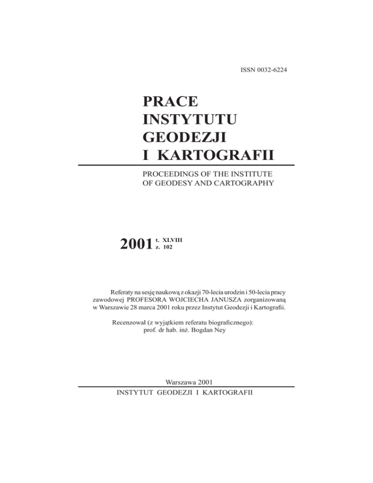 ISSN 0032-6224 PRACE INSTYTUTU GEODEZJI I KARTOGRAFII PROCEEDINGS OF THE INSTITUTE OF GEODESY AND CARTOGRAPHY 2001 t. XLVIII z. 102 Referaty na sesję naukową z okazji 70-lecia urodzin i 50-lecia pracy zawodowej PROFESORA WOJCIECHA JANUSZA zorganizowaną w Warszawie 28 marca 2001 roku przez Instytut Geodezji i Kartografii. Recenzował (z wyjątkiem referatu biograficznego): prof. dr hab. inż. Bogdan Ney Warszawa 2001 INSTYTUT GEODEZJI I KARTOGRAFII Rada Wydawnicza przy Instytucie Geodezji i Kartografii Editorial Council at the Institute of Geodesy and Cartography Adam Linsenbarth (przewodniczący, chairman), Andrzej Ciołkosz (zastępca przewodniczącego, deputy chairman), Teresa Baranowska, Wojciech Janusz, Andrzej Sas-Uhrynowski, Marcin Sękowski, Barbara Smyl, Karol Szeliga, Hanna Ciołkosz (sekretarz, secretary) Redaktor naukowy wydawnictwa "Prace Instytutu Geodezji i Kartografii" Scientific Editor of the Proceedings of the Institute of Geodesy and Cartography Adam Linsenbarth Zastępca redaktora naukowego wydawnictwa "Prace Instytutu Geodezji I Kartografii" Deputy Scientific Editor of the Proceedings of the Institute of Geodesy and Cartography Andrzej Ciołkosz Zespół redakcyjny Editorial Staff Wojciech Janusz, Karol Szeliga Andrzej Sas-Uhrynowski, Elżbieta Linowska-Zalewska Adres Redakcji Instytut Geodezji i Kartografii 00-950 Warszawa, ul. Jasna 2/4 Address of the Editorial Board: Institute of Geodesy and Cartography 00-950 Warsaw, Jasna 2/4 Str. Poland e-mail:[email protected] Copyright by Instytut Geodezji i Kartografii ISSN 0032-6224 Indeks 37357 IGiK, Warszawa 2001 r. Skład komputerowy i druk: IGiK PRACE INSTYTUTU GEODEZJI I KARTOGRAFII 2001, tom XLVIII, zeszyt 102 SPIS TREŚCI: BOGDAN NEY Profesor Wojciech Janusz – Inżynier Geodeta, Wybitny Uczony, Uznany Innowator. ............................................................................... 9 ROMAN CIESIELSKI O zmianach stanu konstrukcji inżynierskich, ich przyczynach 19 i sprawdzeniach pomiarowych.................................................................. WITOLD PRÓSZYŃSKI O wkładzie Profesora Wojciecha Janusza w doskonalenie metodyki opracowania wyników pomiarów i analiz w geodezji inżynieryjnej.......39 STEFAN PRZEWŁOCKI Geodezja inżynieryjna – bliżej do geodezji i kartografii czy 49 do inżynierii lądowej i wodnej.................................................................. LUBOMIR W. BARAN Geodezyjny System Stacji Permanentnych GPS w Polsce................... 55 ALOJZY WASILEWSKI ZOFIA RZEPECKA 71 Zastosowanie GPS w geodezji inżynieryjnej............................................ JAN GOCAŁ Wybrane technologie pomiarów inżynierskich oparte na wykorzystaniu instrumentów elektronicznych.........................................87 ADAM ŻUROWSKI 107 Geodezyjne pomiary kontrolne budowli morskich................................... JERZY BERNASIK 119 Realia i perspektywy pomiarów odkształceń............................................ STEFAN CACOŃ Problem wiarygodności geodezyjnych pomiarów deformacji obiektów inżynierskich w relacji obiekt-górotwór..................................131 PROCEEDINGS OF INSTITUTE OF GEODESY AND CARTOGRAPHY 2001, vol. XLVIII, NO. 102 CONTENTS BOGDAN NEY Prof. Wojciech Janusz – Engineer - Geodesist, Outstanding Scientist, Known Innovator............................................... 9 ROMAN CIESIELSKI Changes of state of engineering constructions, their reasons and control measurements...................................................................... 19 WITOLD PRÓSZYŃSKI Contribution of Prof. Wojciech Janusz to improvement of methods of handling measurement results and analyses in engineering geodesy..................................................................................................... 39 STEFAN PRZEWŁOCKI Engineering geodesy – closer to geodesy and cartography or to civil and water engineering............................................................................ 49 LUBOMIR W. BARAN Geodetic System of Permanent GPS Stations in Poland........................... 55 ALOJZY WASILEWSKI ZOFIA RZEPECKA Application of GPS in engineering geodesy........................................... 71 JAN GOCAŁ The selected technologies of engineering measurements based on use of electronic instruments.......................................................................... 87 ADAM ŻUROWSKI Geodetic control measurements of sea constructions................................107 JERZY BERNASIK Present situation and perspectives of measurements of deformations........................................................................................ 119 STEFAN CACOŃ Problem of reliability of geodetic measurements of deformations of engineering objects in relation object – rock mass...............................131 ТРУДЫ ИНСТИТУТА ГЕОДЕЗИИ И КАРТОГРАФИИ 2001, том XLVIII, тетрадь 102 СОДЕРЖАНИЕ БОГДАН НЕЙ Профессор Войцех Януш – инженер геодезист, выдающийся учёный, признанный новатор.............................................................. 9 РОМАН ЦЕСЕЛЬСКИ Об изменениях состояния инженерных конструкций, их причинах и контрольных измерениях............................................... 19 ВИТОЛЬД ПРУШИНЬСКИ О вкладе Профессора Войцеха Януша в совершенствование методики обработки результатов измерений и анализ ов в инженерной геодезии..................................................................... 39 СТЕФАН ПШЕВЛОЦКИ Инженерная геодезия – ближе к геодезии и картографии или же к наземной и гидроинжен