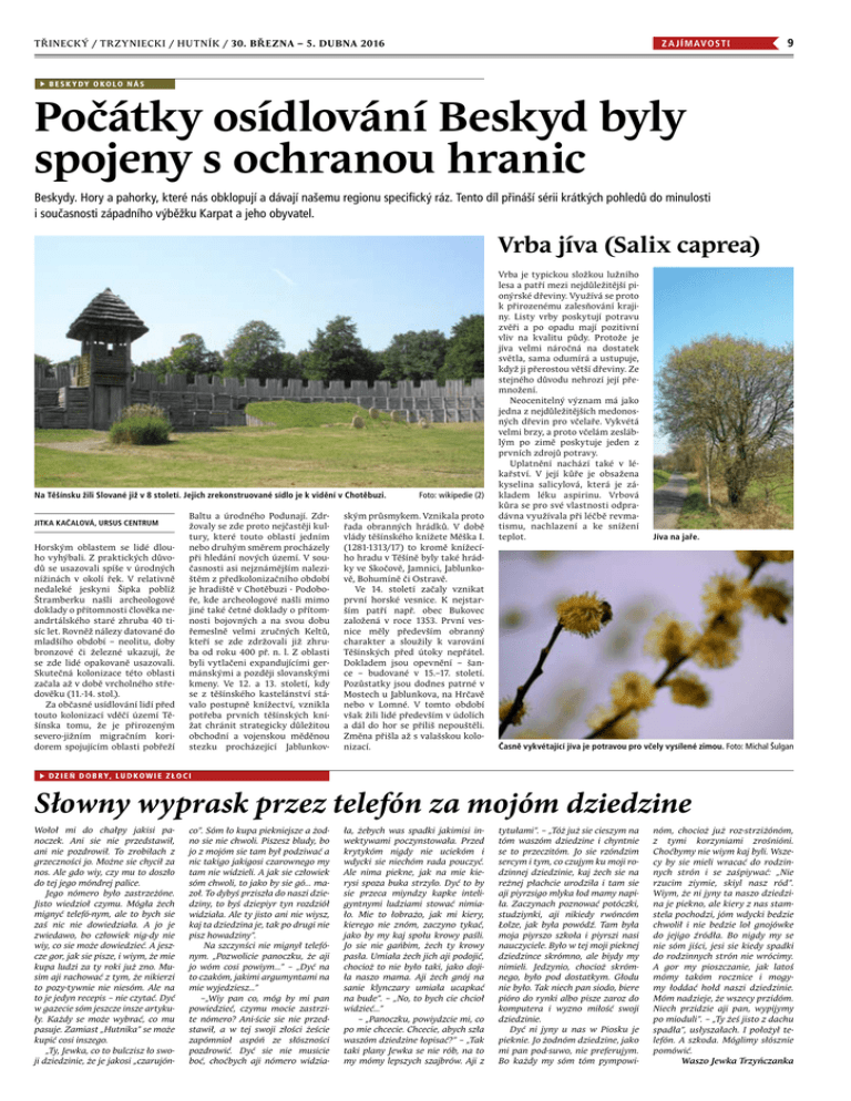 Třineck ý / Tr z yniecki / Hutník / 30. března – 5. dubna 2016 Z a j í m avo s t i 9 B e sk y dy o ko lo n á s Počátky osídlování Beskyd byly spojeny s ochranou hranic Beskydy. Hory a pahorky, které nás obklopují a dávají našemu regionu specifický ráz. Tento díl přináší sérii krátkých pohledů do minulosti i současnosti západního výběžku Karpat a jeho obyvatel. Vrba jíva (Salix caprea) Na Těšínsku žili Slované již v 8 století. Jejich zrekonstruované sídlo je k vidění v Chotěbuzi. Jitka Kačalová, URSUS centrum Horským oblastem se lidé dlouho vyhýbali. Z praktických důvodů se usazovali spíše v úrodných nížinách v okolí řek. V relativně nedaleké jeskyni Šipka poblíž Štramberku našli archeologové doklady o přítomnosti člověka neandrtálského staré zhruba 40 tisíc let. Rovněž nálezy datované do mladšího období – neolitu, doby bronzové či železné ukazují, že se zde lidé opakovaně usazovali. Skutečná kolonizace této oblasti začala až v době vrcholného středověku (11.-14. stol.). Za občasné usídlování lidí před touto kolonizací vděčí území Těšínska tomu, že je přirozeným severo-jižním migračním koridorem spojujícím oblasti pobřeží Baltu a úrodného Podunají. Zdržovaly se zde proto nejčastěji kultury, které touto oblastí jedním nebo druhým směrem procházely při hledání nových území. V současnosti asi nejznámějším nalezištěm z předkolonizačního období je hradiště v Chotěbuzi - Podoboře, kde archeologové našli mimo jiné také četné doklady o přítomnosti bojovných a na svou dobu řemeslně velmi zručných Keltů, kteří se zde zdržovali již zhruba od roku 400 př. n. l. Z oblasti byli vytlačeni expandujícími germánskými a později slovanskými kmeny. Ve 12. a 13. století, kdy se z těšínského kastelánství stávalo postupně knížectví, vznikla potřeba prvních těšínských knížat chránit strategicky důležitou obchodní a vojenskou měděnou stezku procházející Jablunkov- Foto: wikipedie (2) ským průsmykem. Vznikala proto řada obranných hrádků. V době vlády těšínského knížete Měška I. (1281-1313/17) to kromě knížecího hradu v Těšíně byly také hrádky ve Skočově, Jamnici, Jablunkově, Bohumíně či Ostravě. Ve 14. století začaly vznikat první horské vesnice. K nejstarším patří např. obec Bukovec založená v roce 1353. První vesnice měly především obranný charakter a sloužily k varování Těšínských před útoky nepřátel. Dokladem jsou opevnění – šance – budované v 15.–17. století. Pozůstatky jsou dodnes patrné v Mostech u Jablunkova, na Hrčavě nebo v Lomné. V tomto období však žili lidé především v údolích a dál do hor se příliš nepouštěli. Změna přišla až s valašskou kolonizací. Vrba je typickou složkou lužního lesa a patří mezi nejdůležitější pionýrské dřeviny. Využívá se proto k přirozenému zalesňování krajiny. Listy vrby poskytují potravu zvěři a po opadu mají pozitivní vliv na kvalitu půdy. Protože je jíva velmi náročná na dostatek světla, sama odumírá a ustupuje, když ji přerostou větší dřeviny. Ze stejného důvodu nehrozí její přemnožení. Neocenitelný význam má jako jedna z nejdůležitějších medonosných dřevin pro včelaře. Vykvétá velmi brzy, a proto včelám zesláblým po zimě poskytuje jeden z prvních zdrojů potravy. Uplatnění nachází také v lékařství. V její kůře je obsažena kyselina salicylová, která je základem léku aspirinu. Vrbová kůra se pro své vlastnosti odpradávna využívala při léčbě revmatismu, nachlazení a ke snížení teplot. Jíva na jaře. Časně vykvétající jíva je potravou pro včely vysílené zimou.Foto: Michal Šulgan D z i e ń d o b r y, l u d k o w i e z ł o c i Słowny wyprask przez telefón za mojóm dziedzine Wołoł mi do chałpy jakisi panoczek. Ani sie nie przedstawił, ani nie pozdrowił. To zrobiłach z grzeczności jo. Możne sie chycił za nos. Ale gdo wiy, czy mu to doszło do tej jego móndrej palice. Jego nómero było zastrzeżóne. Jisto wiedzioł czymu. Mógła żech mignyć telefó-nym, ale to bych sie zaś nic nie dowiedziała. A jo je zwiedawo, bo człowiek nig-dy nie wiy, co sie może dowiedzieć. A jeszcze gor, jak sie pisze, i wiym, że mie kupa ludzi za ty roki już zno. Musim aji rachować z tym, że nikierzi to pozy-tywnie nie niesóm. Ale na to je jedyn recepis – nie czytać. Dyć w gazecie sóm jeszcze insze artykuły. Każdy se może wybrać, co mu pasuje. Zamiast „Hutnika” se może kupić cosi inszego. „Ty, Jewka, co to bulczisz ło swoji dziedzinie, że je jakosi „czarujón- co”. Sóm ło kupa piekniejsze a żodno sie nie chwoli. Piszesz bludy, bo jo z mojóm sie tam był podziwać a nic takigo jakigosi czarownego my tam nie widzieli. A jak sie człowiek sóm chwoli, to jako by sie gó... mazoł. To dybyś prziszła do naszi dziedziny, to byś dziepiyr tyn rozdziół widziała. Ale ty jisto ani nie wiysz, kaj ta dziedzina je, tak po drugi nie pisz howadziny”. Na szczynści nie mignył telefónym. „Pozwolicie panoczku, że aji jo wóm cosi powiym...” – „Dyć na to czakóm, jakimi argumyntami na mie wyjedziesz...” –„Wiy pan co, móg by mi pan powiedzieć, czymu mocie zastrzite nómero? Ani-ście sie nie przedstawił, a w tej swoji złości żeście zapómnioł aspóń ze słószności pozdrowić. Dyć sie nie musicie boć, choćbych aji nómero widzia- ła, żebych was spadki jakimisi inwektywami poczynstowała. Przed krytykóm nigdy nie uciekóm i wdycki sie niechóm rada pouczyć. Ale nima piekne, jak na mie kierysi spoza buka strzylo. Dyć to by sie przeca miyndzy kapke inteligyntnymi ludziami stować nimiało. Mie to łobrażo, jak mi kiery, kierego nie znóm, zaczyno tykać, jako by my kaj społu krowy paśli. Jo sie nie gańbim,