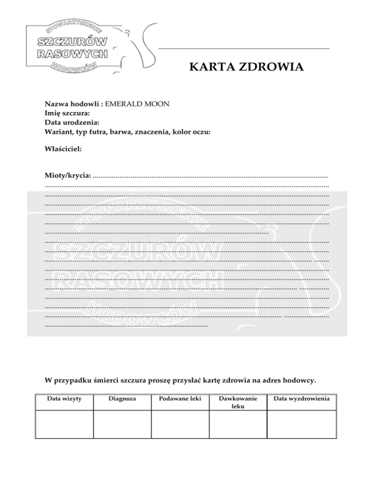 KARTA ZDROWIA Nazwa hodowli : EMERALD MOON Imię szczura: Data urodzenia: Wariant, typ futra, barwa, znaczenia, kolor oczu: Właściciel: Mioty/krycia: ............................................................................................................................. ....................................................................................................................................................... ....................................................................................................................................................... ....................................................................................................................................................... ....................................................................................................................................................... ....................................................................................................................................................... ....................................................................................................................... ....................................................................................................................................................... ....................................................................................................................................................... .............................................................................................................................................. ........ ....................................................................................................................................................... ....................................................................................................................................................... ...................................................................................................................................... ................ ....................................................................................................................................................... ....................................................................................................................................................... .............................................................................................................................. ........................ ....................................................................................... W przypadku śmierci szczura proszę przysłać kartę zdrowia na adres hodowcy. Data wizyty Diagnoza Podawane leki Dawkowanie leku Data wyzdrowienia