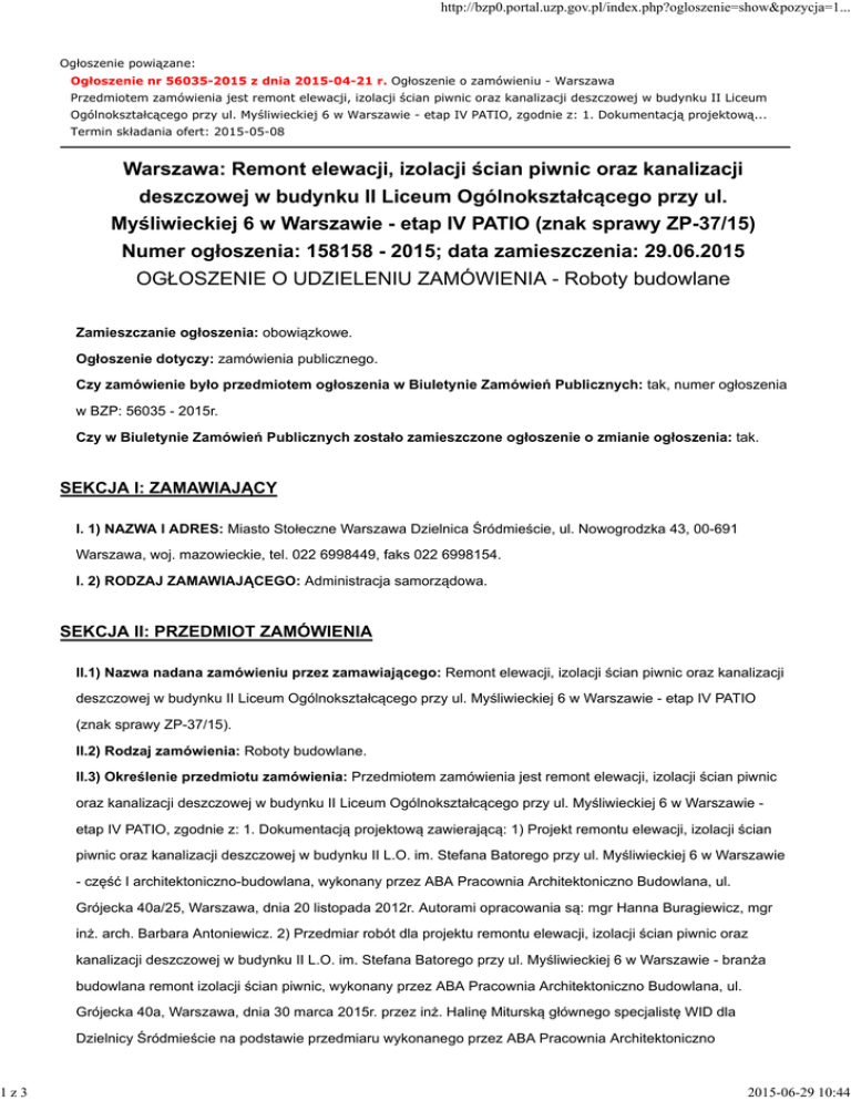 http://bzp0.portal.uzp.gov.pl/index.php?ogloszenie=show&pozycja=1... Ogłoszenie powiązane: Ogłoszenie nr 56035-2015 z dnia 2015-04-21 r. Ogłoszenie o zamówieniu - Warszawa Przedmiotem zamówienia jest remont elewacji, izolacji ścian piwnic oraz kanalizacji deszczowej w budynku II Liceum Ogólnokształcącego przy ul. Myśliwieckiej 6 w Warszawie - etap IV PATIO, zgodnie z: 1. Dokumentacją projektową... Termin składania ofert: 2015-05-08 Warszawa: Remont elewacji, izolacji ścian piwnic oraz kanalizacji deszczowej w budynku II Liceum Ogólnokształcącego przy ul. Myśliwieckiej 6 w Warszawie - etap IV PATIO (znak sprawy ZP-37/15) Numer ogłoszenia: 158158 - 2015; data zamieszczenia: 29.06.2015 OGŁOSZENIE O UDZIELENIU ZAMÓWIENIA - Roboty budowlane Zamieszczanie ogłoszenia: obowiązkowe. Ogłoszenie dotyczy: zamówienia publicznego. Czy zamówienie było przedmiotem ogłoszenia w Biuletynie Zamówień Publicznych: tak, numer ogłoszenia w BZP: 56035 - 2015r. Czy w Biuletynie Zamówień Publicznych zostało zamieszczone ogłoszenie o zmianie ogłoszenia: tak. SEKCJA I: ZAMAWIAJĄCY I. 1) NAZWA I ADRES: Miasto Stołeczne Warszawa Dzielnica Śródmieście, ul. Nowogrodzka 43, 00-691 Warszawa, woj. mazowieckie, tel. 022 6998449, faks 022 6998154. I. 2) RODZAJ ZAMAWIAJĄCEGO: Administracja samorządowa. SEKCJA II: PRZEDMIOT ZAMÓWIENIA II.1) Nazwa nadana zamówieniu przez zamawiającego: Remont elewacji, izolacji ścian piwnic oraz kanalizacji deszczowej w budynku II Liceum Ogólnokształcącego przy ul. Myśliwieckiej 6 w Warszawie - etap IV PATIO (znak sprawy ZP-37/15). II.2) Rodzaj zamówienia: Roboty budowlane. II.3) Określenie przedmiotu zamówienia: Przedmiotem zamówienia jest remont elewacji, izolacji ścian piwnic oraz kanalizacji deszczowej w budynku II Liceum Ogólnokształcącego przy ul. Myśliwieckiej 6 w Warszawie etap IV PATIO, zgodnie z: 1. Dokumentacją projektową zawierającą: 1) Projekt remontu elewacji, izolacji ścian piwnic oraz kanalizacji deszczowej w budynku II L.O. im. Stefana Batorego przy ul. Myśliwieckiej 6 w Warszawie - część I architektoniczno-budowlana, wykonany przez ABA Pracownia Architektoniczno Budowlana, ul. Grójecka 40a/25, Warszawa, dnia 20 listopada 2012r. Autorami opracowania są: mgr Hanna Buragiewicz, mgr inż. arch. Barbara Antoniewicz. 2) Przedmiar robót dla projektu remontu elewacji, izolacji ścian piwnic oraz kanalizacji deszczowej w budynku II L.O. im. Stefana Batorego przy ul. Myśliwieckiej 6 w Warszawie - branża budowlana remont izolacji ścian piwnic, wykonany przez ABA Pracownia Architektoniczno Budowlana, ul. Grójecka 40a, Warszawa, dnia 30 marca 2015r. przez inż. Halinę Miturską głównego specjalistę WID dla Dzielnicy Śródmieście na podstawie przedmiaru wykonanego przez ABA Pracownia Architektoniczno 1z3 2015-06-29 10:44 http://bzp0.portal.uzp.gov.pl/index.php?ogloszenie=show&pozycja=1... Budowlana. 3) Przedmiar robót remontu elewacji od strony dziedzińca w budynku II L.O. im. Stefana Batorego przy ul. Myśliwieckiej 6 w Warszawie - branża budowlana remont elewacji od strony Patio i prześwitu, wykonany przez ABA Pracownia Architektoniczno Budowlana, ul. Grójecka 40a, Warszawa, dnia 30 marca 2015r. przez inż. Halinę Miturską głównego specjalistę WID dla Dzielnicy Śródmieście na podstawie przedmiaru wykonanego przez ABA Pracownia Architektoniczno Budowlana. 2. Szczegółowe specyfikacje techniczne wykonania i odbioru robót budowlanych remontu elewacji, izolacji ścian piwnic oraz kanalizacji deszczowej w budynku II L.O. im. Stefana Batorego przy ul. Myśliwieckiej 6 w Warszawie, wykonane przez ABA Pracownia Architektoniczno Budowlana, ul. Grójecka 40a/25, Warszawa, dnia 20 listopada 2012r. Autorami opracowania są: mgr Hanna Buragiewicz, mgr inż. arch. Barbara Antoniewicz, mgr inż. Elżbieta Kozińska. Ww. opracowania stanowią załącznik nr 7 do SIWZ. Zamawiający dopuszcza rozwiązania równoważne opisanym w dokumentacji projektowej oraz specyfikacji technicznej wykonania i odbioru robót. Wykonawca, który powołuje się na rozwiązania równoważne do opisanych przez Zamawiającego jest obowiązany wykazać, że oferowane przez niego produkty, urządzenia i technologie spełniają wymagania określone przez Zamawiającego. W zakres zamówienia wchodzi wykonanie m.in.: 1. Zakres robót remontowych: - wykonanie remontu izolacji fundamentów budynku od strony dziedzińca z wymianą otoku instalacji odgromowej, wymianą uszkodzonej instalacji kanalizacji deszczowej; - wykonanie remontu elewacji ścian budynku od strony dziedzińca - patio 2. Zakres prac obrazują rys: 2, 7, 8, 10, 11, 12, 25, 31, 32 oraz rysunki detali. 3. Kolorystykę oraz wykonanie boni należy dostosować do elewacji już odnowionych i uzgodnionych z Biurem Stołecznego Konserwatora Zabytków. UWAGA: 1. Przed rozpoczęciem robót należy przedłożyć inspektorowi nadzoru, pisemną opinię ornitologiczną dotyczącą ochrony ptaków w trakcie prowadzonych robót. 2. Należy wykonać tablicę informacyjną o dofinansowaniu remontu ze środków Ministra Kultury i Dziedzictwa Narodowego zgodnie z wzorem i kolorystyką określoną na stronie internetowej MKiDN pod adresem: 3. http://www.mkidn.gov.pl/media/_img/content2011 /nowe_logo_en/MKiDN_ksiega_nowe_logo_en.pdf . Wykonanie i usytuowanie tablicy wymaga dokonania uzgodnień ze Stołecznym Konserwatorem Zabytków. 4. Należy uzyskać wszystkie uzgodnienia potrzebne do zrealizowania zamówienia w tym ze Stołecznym Konserwatorem Zabytków. 5. Wykonawca zobowiązany jest do przedkładania Zamawiającemu zamiennego kosztorysu ofertowego, przy każdorazowej zmianie in plus/in minus ilości wykonanych robót, w terminie 3 dni od zaistnienia takiej zmiany. Szczegółowy opis przedmiotu zamówienia zawarty jest w projekcie umowy (załącznik nr 6 do SIWZ). Wymagany termin wykonania zamówienia: rozpoczęcie wykonania przedmiotu umowy nastąpi do 30 dni od daty zawarcia umowy; - za