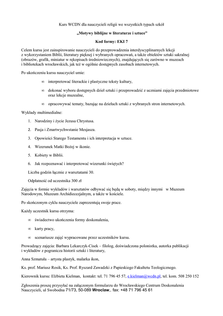 Kurs WCDN dla nauczycieli religii we wszystkich typach szkół „Motywy biblijne w literaturze i sztuce” Kod formy: EKI 7 Celem kursu jest zainspirowanie nauczycieli do przeprowadzenia interdyscyplinarnych lekcji z wykorzystaniem Biblii, literatury pięknej i wybranych opracowań, a także obiektów sztuki sakralnej (obrazów, grafik, miniatur w rękopisach średniowiecznych), znajdujących się zarówno w muzeach i bibliotekach wrocławskich, jak też w ogólnie dostępnych zasobach internetowych. Po ukończeniu kursu nauczyciel umie: • interpretować literackie i plastyczne teksty kultury, • dokonać wyboru dostępnych dzieł sztuki i przeprowadzić z uczniami zajęcia przedmiotowe oraz lekcje muzealne, • opracowywać tematy, bazując na dziełach sztuki z wybranych stron internetowych. Wykłady multimedialne: 1. Narodziny i życie Jezusa Chrystusa. 2. Pasja i Zmartwychwstanie Mesjasza. 3. Opowieści Starego Testamentu i ich interpretacja w sztuce. 4. Wizerunek Matki Bożej w ikonie. 5. Kobiety w Biblii. 6. Jak rozpoznawać i interpretować wizerunki świętych? Liczba godzin łącznie z warsztatami 30. Odpłatność od uczestnika 300 zł Zajęcia w formie wykładów i warsztatów odbywać się będą w soboty, między innymi w Muzeum Narodowym, Muzeum Archidiecezjalnym, a także w kościele. Po skończonym cyklu nauczyciele zaprezentują swoje prace. Każdy uczestnik kursu otrzyma: • świadectwo ukończenia formy doskonalenia, • karty pracy, • scenariusze zajęć wypracowane przez uczestników kursu. Prowadzący zajęcia: Barbara Lekarczyk-Cisek – filolog, doświadczona polonistka, autorka publikacji i wykładów z pogranicza historii sztuki i literatury, Anna Szmatuła – artysta plastyk, malarka ikon, Ks. prof. Mariusz Rosik, Ks. Prof. Ryszard Zawadzki z Papieskiego Fakultetu Teologicznego. Kierownik kursu: Elżbieta Kielman, kontakt: tel. 71 796 45 57, [email protected], tel. kom. 508 250 152 Zgłoszenia proszę przysyłać na załączonym formularzu do Wrocławskiego Centrum Doskonalenia Nauczycieli, ul Swobodna 71/73, 50-089 Wroclaw,. fax: +48 71 796 45 61