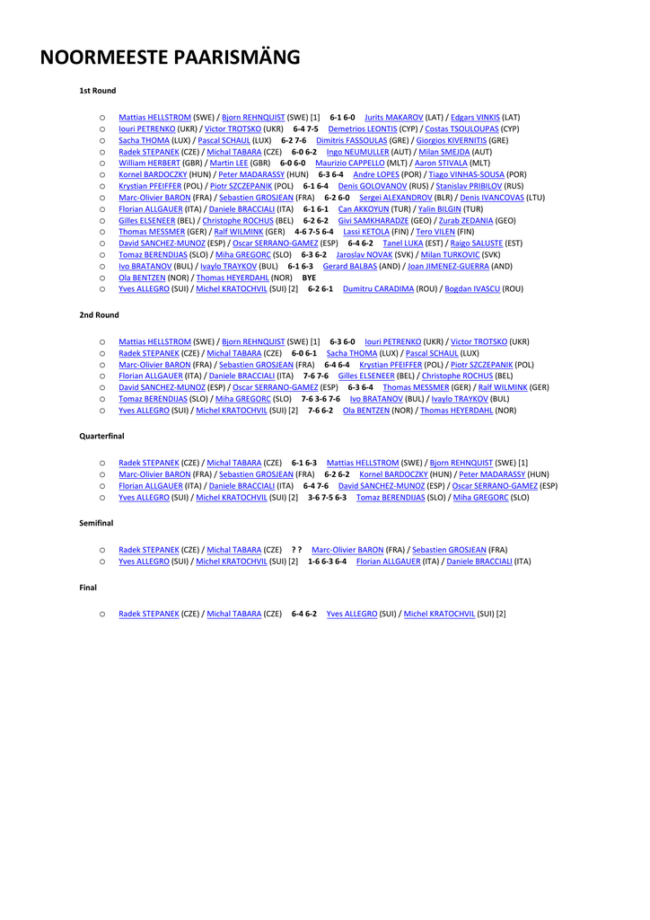 NOORMEESTE PAARISMÄNG 1st Round o o o o o o o o o o o o o o o o Mattias HELLSTROM (SWE) / Bjorn REHNQUIST (SWE) [1] 6-1 6-0 Jurits MAKAROV (LAT) / Edgars VINKIS (LAT) Iouri PETRENKO (UKR) / Victor TROTSKO (UKR) 6-4 7-5 Demetrios LEONTIS (CYP) / Costas TSOULOUPAS (CYP) Sacha THOMA (LUX) / Pascal SCHAUL (LUX) 6-2 7-6 Dimitris FASSOULAS (GRE) / Giorgios KIVERNITIS (GRE) Radek STEPANEK (CZE) / Michal TABARA (CZE) 6-0 6-2 Ingo NEUMULLER (AUT) / Milan SMEJDA (AUT) William HERBERT (GBR) / Martin LEE (GBR) 6-0 6-0 Maurizio CAPPELLO (MLT) / Aaron STIVALA (MLT) Kornel BARDOCZKY (HUN) / Peter MADARASSY (HUN) 6-3 6-4 Andre LOPES (POR) / Tiago VINHAS-SOUSA (POR) Krystian PFEIFFER (POL) / Piotr SZCZEPANIK (POL) 6-1 6-4 Denis GOLOVANOV (RUS) / Stanislav PRIBILOV (RUS) Marc-Olivier BARON (FRA) / Sebastien GROSJEAN (FRA) 6-2 6-0 Sergei ALEXANDROV (BLR) / Denis IVANCOVAS (LTU) Florian ALLGAUER (ITA) / Daniele BRACCIALI (ITA) 6-1 6-1 Can AKKOYUN (TUR) / Yalin BILGIN (TUR) Gilles ELSENEER (BEL) / Christophe ROCHUS (BEL) 6-2 6-2 Givi SAMKHARADZE (GEO) / Zurab ZEDANIA (GEO) Thomas MESSMER (GER) / Ralf WILMINK (GER) 4-6 7-5 6-4 Lassi KETOLA (FIN) / Tero VILEN (FIN) David SANCHEZ-MUNOZ (ESP) / Oscar SERRANO-GAMEZ (ESP) 6-4 6-2 Tanel LUKA (EST) / Raigo SALUSTE (EST) Tomaz BERENDIJAS (SLO) / Miha GREGORC (SLO) 6-3 6-2 Jaroslav NOVAK (SVK) / Milan TURKOVIC (SVK) Ivo BRATANOV (BUL) / Ivaylo TRAYKOV (BUL) 6-1 6-3 Gerard BALBAS (AND) / Joan JIMENEZ-GUERRA (AND) Ola BENTZEN (NOR) / Thomas HEYERDAHL (NOR) BYE Yves ALLEGRO (SUI) / Michel KRATOCHVIL (SUI) [2] 6-2 6-1 Dumitru CARADIMA (ROU) / Bogdan IVASCU (ROU) 2nd Round o o o o o o o Mattias HELLSTROM (SWE) / Bjorn REHNQUIST (SWE) [1] 6-3 6-0 Iouri PETRENKO (UKR) / Victor TROTSKO (UKR) Radek STEPANEK (CZE) / Michal TABARA (CZE) 6-0 6-1 Sacha THOMA (LUX) / Pascal SCHAUL (LUX) Marc-Olivier BARON (FRA) / Sebastien GROSJEAN (FRA) 6-4 6-4 Krystian PFEIFFER (POL) / Piotr SZCZEPANIK (POL) Florian ALLGAUER (ITA) / Daniele BRACCIALI (ITA) 7-6 7-6 Gilles ELSENEER (BEL) / Christophe ROCHUS (BEL) David SANCHEZ-MUNOZ (ESP) / Oscar SERRANO-GAMEZ (ESP) 6-3 6-4 Thomas MESSMER (GER) / Ralf WILMINK (GER) Tomaz BERENDIJAS (SLO) / Miha GREGORC (SLO) 7-6 3-6 7-6 Ivo BRATANOV (BUL) / Ivaylo TRAYKOV (BUL) Yves ALLEGRO (SUI) / Michel KRATOCHVIL (SUI) [2] 7-6 6-2 Ola BENTZEN (NOR) / Thomas HEYERDAHL (NOR) Quarterfinal o o o o Radek STEPANEK (CZE) / Michal TABARA (CZE) 6-1 6-3 Mattias HELLSTROM (SWE) / Bjorn REHNQUIST (SWE) [1] Marc-Olivier BARON (FRA) / Sebastien GROSJEAN (FRA) 6-2 6-2 Kornel BARDOCZKY (HUN) / Peter MADARASSY (HUN) Florian ALLGAUER (ITA) / Daniele BRACCIALI (ITA) 6-4 7-6 David SANCHEZ-MUNOZ (ESP) / Oscar SERRANO-GAMEZ (ESP) Yves ALLEGRO (SUI) / Michel KRATOCHVIL (SUI) [2] 3-6 7-5 6-3 Tomaz BERENDIJAS (SLO) / Miha GREGORC (SLO) Semifinal o o Radek STEPANEK (CZE) / Michal TABARA (CZE) ? ? Marc-Olivier BARON (FRA) / Sebastien GROSJEAN (FRA) Yves ALLEGRO (SUI) / Michel KRATOCHVIL (SUI) [2] 1-6 6-3 6-4 Florian ALLGAUER (ITA) / Daniele BRACCIALI (ITA) o Radek STEPANEK (CZE) / Michal TABARA (CZE) Final 6-4 6-2 Yves ALLEGRO (SUI) / Michel KRATOCHVIL (SUI) [2]