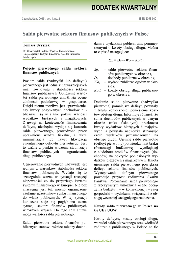 DODATEK KWARTALNY Czerwiec/June 2015 ● vol. II, no. 2 ISSN 2353-5601 Saldo pierwotne sektora finansów publicznych w Polsce Tomasz Uryszek Dr, Uniwersytet Łódzki, Wydział Ekonomiczno-Socjologiczny, Instytut Finansów, Katedra Finansów Publicznych Pojęcie pierwotnego salda sektora finansów publicznych Poziom salda (nadwyżki lub deficytu) pierwotnego jest jedną z najważniejszych miar równowagi i stabilności sektora finansów publicznych. Obliczenie wartości salda pierwotnego umożliwia ocenę zdolności podatkowej w gospodarce. Dzięki niemu możliwe jest sprawdzenie, czy kwoty pozyskanych dochodów publicznych są w stanie pokryć wartości wydatków bieżących i majątkowych. Z uwagi na konieczność finansowania deficytu, niezbędna wydaje się kontrola salda pierwotnego, prowadzona przez uprawnione władze fiskalne, a także minimalizacja lub nawet likwidacja ewentualnego deficytu pierwotnego. Jest to ważne z punktu widzenia stabilizacji finansów publicznych i ograniczania długu publicznego. Generowanie pierwotnych nadwyżek jest jednym z warunków stabilności sektora finansów publicznych. Wydaje się to szczególnie ważne w sytuacji rosnącej niepewności co do przyszłego kształtu systemu finansowego w Europie. Nie bez znaczenia jest też mocno ograniczone zaufanie uczestników rynku finansowego do władz publicznych. W tej sytuacji konieczna staje się pogłębiona ocena sytuacji sektora finansów publicznych w różnych krajach. Do tego celu służyć mogą wartości salda pierwotnego. Saldo pierwotne sektora finansów publicznych stanowi różnicę między dochodami dami a wydatkami publicznymi, pomniejszonymi o koszty obsługi długu. Można to zapisać następująco: Spt = Dt – (Wot – Kodt) – saldo pierwotne sektora finansów publicznych w okresie t, Dt – dochody publiczne w okresie t, Wot – wydatki publiczne ogółem w okresie t, Kodt – koszty obsługi długu publicznego w okresie t. Spt Dodatnie saldo pierwotne (nadwyżka pierwotna) pomniejsza deficyt, powstały z tytułu konieczności poniesienia kosztów obsługi długu. Informuje również, że suma dochodów publicznych w danym okresie (roku fiskalnym) przekracza kwoty wydatków bieżących i majątkowych, a powstała nadwyżka sfinansuje cześć wydatków przeznaczonych na obsługę długu. Ujemne saldo pierwotne (deficyt pierwotny) potwierdza fakt braku równowagi budżetowej, wynikającej z niedoboru środków finansowych (dochodów) na pokrycie poniesionych wydatków bieżących i majątkowych. Kwota ujemnego salda pierwotnego powiększa deficyt sektora finansów publicznych. Występowanie deficytu pierwotnego powoduje przyrost zadłużenia Skarbu Państwa. Porównanie salda pierwotnego z rzeczywistym umożliwia ocenę obciążenia budżetu i – w konsekwencji – całej gospodarki – wydatkami związanymi z obsługą wcześniej zaciągniętego zadłużenia. Kwoty salda pierwotnego w Polsce na tle UE i UGW Kwoty deficytu, koszty obsługi długu, wartości salda pierwotnego oraz wielkość zadłużenia publicznego w Polsce na tle Unii www.finanseiprawofinansowe.uni.lodz.pl 87 DODATEK KWARTALNY Czerwiec/June 2015 ● vol. II, no. 2 ISSN 2353-5601 Unii Europejskiej oraz Unii Gospodarczej i Walutowej zaprezentowano w tabeli 1. ow Dane przedstawione w tabeli 1 wyraźnie wskazują, że w Polsce realizowane są głównie deficyty pierwotne. W ciągu ostatnich 15 lat (w okresie 2000–2014) saldo pierwotne było dodatnie zaledwie jednokrotnie (w 2007 r.). Ponadto w 2000 r. sektor finansów publicznych był zrównoważony na poziome pierwotnym. W pozostałych okresach realizowane były deficyty pierwotne.okim Porównanie z wartościami dla UE i EMU wskazuje, że Polska generowała deficyty pierwotne na poziomie wyższym, niż przeciętnie w Unii oraz w strefie euro. Różnica nie wynikała z wyższych kosztów obsługi długu. Przeciwnie – te były niższe w Polsce (w odniesieniu do PKB) niż w UE i UGW. Wynika to z faktu, że poziom zadłużenia publicznego w Polsce jest znacząco niższy niż przeciętnie w UE i UGW, a poziom oprocentowania zobowiązań w coraz większym stopniu jest porównywalny z innymi krajami Unii, w tym – krajami strefy euro. Podsumowanie 50 W Polsce w ciągu ostatnich 15 lat generowane były relatywnie wysokie deficyty sektora finansów publicznych na poziomie pierwotnym. Oznacza to, że – nawet w hipotetycznej sytuacji, w której nie trzeba byłoby ponosić kosztów obsługi zadłużenia publicznego – w Polsce występowałby deficyt. Jest to niebezpieczna i niepożądana sytuacja z punktu widzenia stabilności systemu finansów publicznych. Powoduje ona bowiem konieczność permanentnego zwiększania kwot długu publicznego. Porównania tego zjawiska z wartościami dla UE oraz UGW wypadają niekorzystnie dla Polski. W celu zmiany tej sytuacji konieczne są reformy systemu finansów publicznych, zmierzające do zrównoważenia sektora finansów publicznych co najmniej na poziomie salda pierwotnego. Niezbędne jest doprowadzenie do sytuacji, w której dochody publiczne będą w stanie pokryć kwoty wydatków bieżących i majątkowych. Umożliwi to zmniejszenie tempa przyrostu zobowiązań publicznych i przyczyni się do zwiększenia stabilności polskiego sektora finansów publicznych. Tabela 1. Kwoty deficytu, koszty obsługi długu, wartości salda pierwotnego oraz wielkość zadłużenia publicznego w Polsce na tle Unii Europejskiej oraz Unii Gospodarczej i Walutowej (w % PKB) 2000 2001 2002 2003 2004 2005 2006 2007 2008 2009 2010 2011 2012 2013 2014 A : : : : : : : : : : : –4,5 –4,2 –3,2 –2,9 Unia Europejska B C : : : : : : : : : : : : : : : : : : : : : : 2,9 –1,6 2,9 –1,3 2,7 –0,5 2,5 –0,4 D : : : : : : : : : : : 80,9 83,7 85,5 86,8 A : : : : : : : : : : : –4,1 –3,6 –2,9 –2,4 Strefa euro B C : : : : : : : : : : : : : : : : : : : : : : 3,0 –1,1 3,0 –0,6 2,8 –0,1 2,6 0,2 D : : : : : : : : : : : 85,8 89,1 90,9 91,9 A –3,0 –