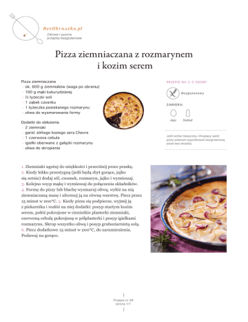 Pizza ziemniaczana ·· ok. 600 g ziemniaków (waga po obraniu) ·· 100 g mąki kukurydzianej ·· ½ łyżeczki soli ·· 1 ząbek czosnku ·· 1 łyżeczka posiekanego rozmarynu ·· oliwa do wysmarowania formy PR ZEPIS NA 2–3 OSOBY Bezglutenow y Z AWIER A: Jaja Dodatki do obłożenia ·· 2 ziemniaki ·· garść żółtego koziego sera Chevre ·· 1 czerwona cebula ·· igiełki oberwane z gałązki rozmarynu ·· oliwa do skropienia Nabiał Jeśli wolisz klasyczny, chrupiący spód pizzy polecam wypróbować bezglutenową pizze bez drożdży. 1. Ziemniaki ugotuj do miękkości i przeciśnij przez praskę. 2. Kiedy lekko przestygną (jeśli będą zbyt gorące, jajko się zetnie) dodaj sól, czosnek, rozmaryn, jajko i wymieszaj. 3. Kolejno wsyp mąkę i wymieszaj do połączenia składników. 4. Formę do pizzy lub blachę wysmaruj oliwą, wyłóż na nią ziemniaczaną masę i uformuj ją na równą warstwę. Piecz przez 15 minut w 200°C. 5. Kiedy pizza się podpiecze, wyjmij ją z piekarnika i rozłóż na niej dodatki: posyp startym kozim serem, połóż pokrojone w cieniutkie plasterki ziemniaki, czerwoną cebulę pokrojoną w półplasterki i posyp igiełkami rozmarynu. Skrop wszystko oliwą i posyp gruboziarnistą solą. 6. Piecz dodatkowe 15 minut w 200°C, do zarumienienia. Podawaj na gorąco. Przepis nr 58 strona 1/1