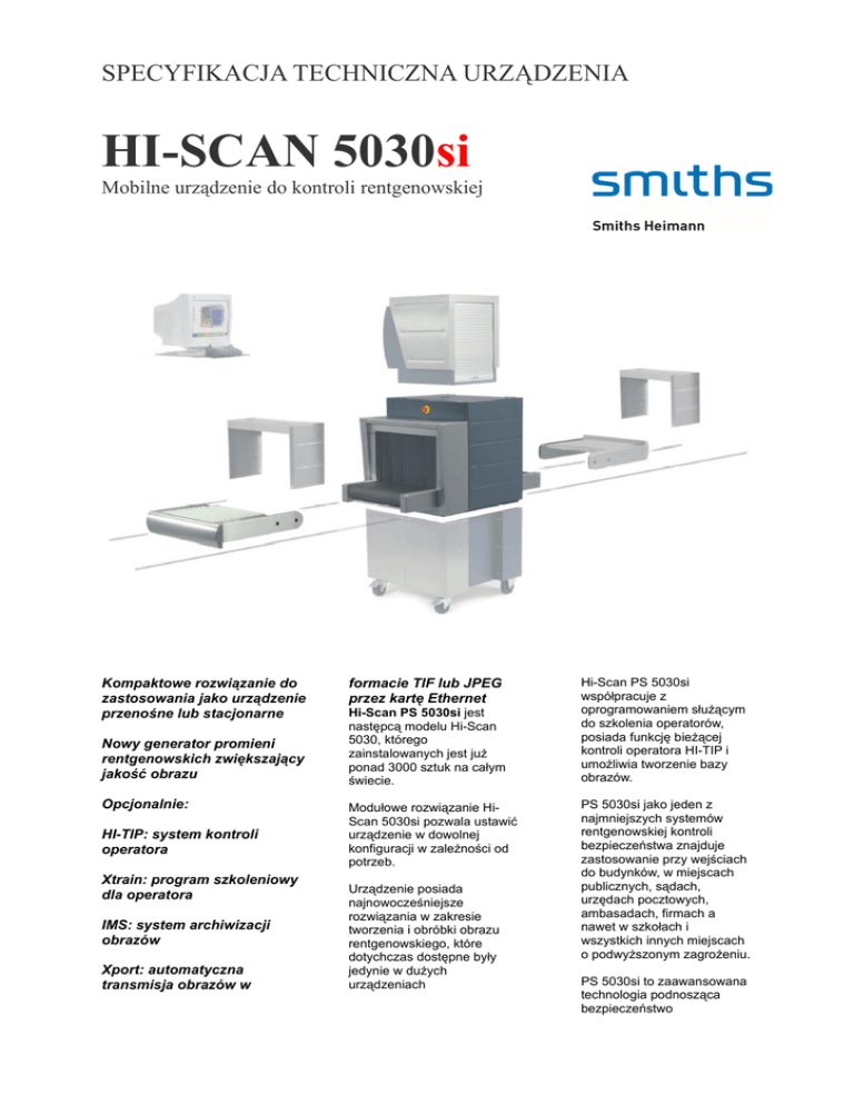 SPECYFIKACJA TECHNICZNA URZĄDZENIA HI-SCAN 5030si Mobilne urządzenie do kontroli rentgenowskiej Kompaktowe rozwiązanie do zastosowania jako urządzenie przenośne lub stacjonarne Nowy generator promieni rentgenowskich zwiększający jakość obrazu Opcjonalnie: HI-TIP: system kontroli operatora Xtrain: program szkoleniowy dla operatora IMS: system archiwizacji obrazów Xport: automatyczna transmisja obrazów w formacie TIF lub JPEG przez kartę Ethernet Hi-Scan PS 5030si jest następcą modelu Hi-Scan 5030, którego zainstalowanych jest już ponad 3000 sztuk na całym świecie. Modułowe rozwiązanie HiScan 5030si pozwala ustawić urządzenie w dowolnej konfiguracji w zależności od potrzeb. Urządzenie posiada najnowocześniejsze rozwiązania w zakresie tworzenia i obróbki obrazu rentgenowskiego, które dotychczas dostępne były jedynie w dużych urządzeniach Hi-Scan PS 5030si współpracuje z oprogramowaniem służącym do szkolenia operatorów, posiada funkcję bieżącej kontroli operatora HI-TIP i umożliwia tworzenie bazy obrazów. PS 5030si jako jeden z najmniejszych systemów rentgenowskiej kontroli bezpieczeństwa znajduje zastosowanie przy wejściach do budynków, w miejscach publicznych, sądach, urzędach pocztowych, ambasadach, firmach a nawet w szkołach i wszystkich innych miejscach o podwyższonym zagrożeniu. PS 5030si to zaawansowana technologia podnosząca bezpieczeństwo DANE TECHNICZNE: Ogólne dane: rozmiary tunelu maks. wielkość obiektu wysokość taśmociągu Szybkość taśmociągu maks. obciążenie taśmociągu rozdzielczość liniowa penetracja stali natężenie promieni rentgenowskich bezpieczeństwo filmów fotograficznych cykl pracy 532mm szer./330mm wys. 530mm szer./320mm wys. ok. 190mm ok. 0,18-0,22m/s 60kg standard 38AWG (0,13mm); maks. 39AWG (0,1mm) standard 10mm; maks. 12mm standard: 1,6 µSv (0,16mrem) gwarantowane do ISO 1600 (33DIN) 100%, bez nagrzewania Generator promieni rentgenowskich: Napięcie anodowe, chłodzenie Kierunek padania promieni 100kV cp diagonalnie System kreowania obrazu: Przetwornik rentgenowski Liczba odcieni szarości Rozdzielczość obrazu Kolor obrazu Funkcje obróbki obrazu Monitor Dodatkowe funkcje: W standardzie Opcjonalnie Dane dotyczące instalacji Emisja promieni rentgenowskich Znakowanie CE Poziom hałasu Zakres temperatur pracy Dopuszczalna wilgotność Zasilanie Pobór mocy Wymiary i waga Konstrukcja listwy detektorów, kształt litery L o wysokiej rozdzielczości 4096 1280x1024/24bit czarno-biały, kolor B/W, HIGH, LO, NEG, HI-MAT, VARI-MAT, O2, OS, płynny ZOOM cyfrowy 17” kolorowy monitor, standardy MPR II i TCO99 inne monitory na zamówienie wyświetlanie daty i czasu, licznik bagażu, akustyczny system oznaczania bagażu, funkcja REVIEW - cofanie do poprzedniego obrazu, podgląd funkcji zoom, programowalne przyciski. HI-TIP, HI-SPOT, SEN, Xport, IMS (program do zarządzania bazą obrazów) urządzenie spełnia wszystkie międzynarodowe standardy 98/37/EWG, 72/23/EWG, 89/336/EWG <56dB pracy 0oC - +40oC, składowania -20oC - +60oC 10%-90% bez kondensacji 230V (AC) ok. 0,3kVA 1200dł./705szer./726wys. [mm], 160kg stalowa konstrukcja / ciemny szary (RAL 7016)
