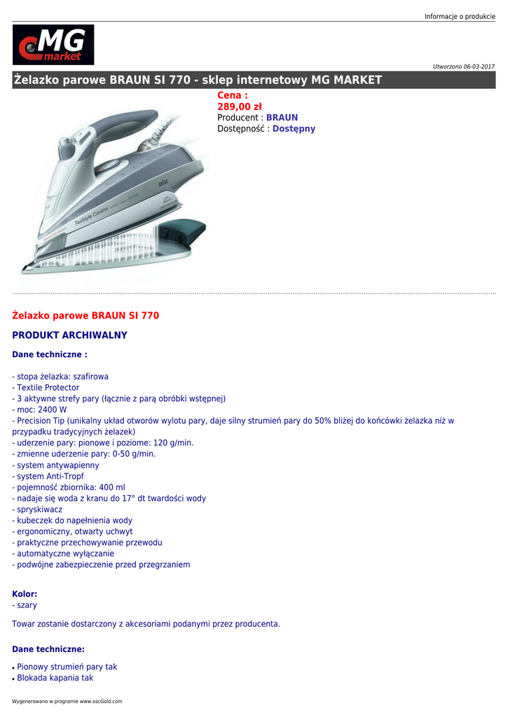 Informacje o produkcie Utworzono 06-03-2017 Żelazko parowe BRAUN SI 770 - sklep internetowy MG MARKET Cena : 289,00 zł Producent : BRAUN Dostępność : Dostępny Żelazko parowe BRAUN SI 770 PRODUKT ARCHIWALNY Dane techniczne : - stopa żelazka: szafirowa - Textile Protector - 3 aktywne strefy pary (łącznie z parą obróbki wstępnej) - moc: 2400 W - Precision Tip (unikalny układ otworów wylotu pary, daje silny strumień pary do 50% bliżej do końcówki żelazka niż w przypadku tradycyjnych żelazek) - uderzenie pary: pionowe i poziome: 120 g/min. - zmienne uderzenie pary: 0-50 g/min. - system antywapienny - system Anti-Tropf - pojemność zbiornika: 400 ml - nadaje się woda z kranu do 17° dt twardości wody - spryskiwacz - kubeczek do napełnienia wody - ergonomiczny, otwarty uchwyt - praktyczne przechowywanie przewodu - automatyczne wyłączanie - podwójne zabezpieczenie przed przegrzaniem Kolor: - szary Towar zostanie dostarczony z akcesoriami podanymi przez producenta. Dane techniczne: ● ● Pionowy strumień pary tak Blokada kapania tak Wygenerowano w programie www.oscGold.com ● ● ● ● Tworzywo wykonania podstawy - stopa żelazka z powłoką Regulacja funkcji pary wodnej silne uderzenie parowy + spray System antywapienny - tak Automatyczny wyłącznik - tak