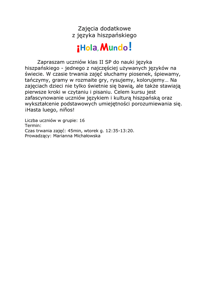 Zajęcia dodatkowe z języka hiszpańskiego ¡Hola, Mundo! Zapraszam uczniów klas II SP do nauki języka hiszpańskiego - jednego z najczęściej używanych języków na świecie. W czasie trwania zajęć słuchamy piosenek, śpiewamy, tańczymy, gramy w rozmaite gry, rysujemy, kolorujemy… Na zajęciach dzieci nie tylko świetnie się bawią, ale także stawiają pierwsze kroki w czytaniu i pisaniu. Celem kursu jest zafascynowanie uczniów językiem i kulturą hiszpańską oraz wykształcenie podstawowych umiejętności porozumiewania się. ¡Hasta luego, niños! Liczba uczniów w grupie: 16 Termin: Czas trwania zajęć: 45min, wtorek g. 12:35-13:20. Prowadzący: Marianna Michałowska