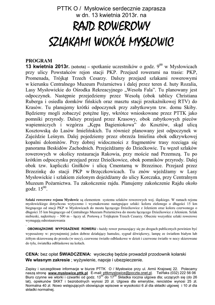 PTTK O / Mysłowice serdecznie zaprasza w dn. 13 kwietnia 2013r. na RAJD ROWEROWY SZLAKAMI SZLAKAMI WOKÓŁ WOKÓŁ MYSŁOWIC PROGRAM 13 kwietnia 2013r. (sobota) – spotkanie uczestników o godz. 900 w Mysłowicach przy ulicy Powstańców rejon stacji PKP. Przejazd rowerami na trasie: PKP, Promenada, Trójkąt Trzech Cesarzy. Dalszy przejazd szlakami rowerowymi w kierunku Centralnego Muzeum Pożarnictwa i dalej przez teren d. huty Rozalia, Lasy Mysłowickie do Ośrodka Rekreacyjnego „Wesoła Fala”. Tu planowany jest odpoczynek. Następnie przejedziemy przez Wesołą (obok tablicy Christiana Ruberga i osiedla domków fińskich oraz masztu stacji przekaźnikowej RTV) do Krasów. Tu planujemy krótki odpoczynek przy zabytkowym tzw. domu Skiby. Będziemy mogli zobaczyć potężne lipy, wkrótce wnioskowane przez PTTK jako pomniki przyrody. Dalszy przejazd przez Krasowy, obok zabytkowych pieców wapienniczych i wzgórza „Kępa Bagieniokowa” do Kosztów, skąd ulicą Kosztowską do Lasów Imielińskich. Tu również planowany jest odpoczynek w Zajeździe Leśnym. Dalej pojedziemy przez obrzeża Imielina obok odkrywkowej kopalni dolomitów. Przy dobrej widoczności z fragmentów trasy rozciąga się panorama Beskidów Zachodnich. Przejeżdżamy do Dziećkowic. Tu węzeł szlaków rowerowych w okolicy restauracja Rakowia, przy moście nad Przemszą. Tu po krótkim odpoczynku przejazd przez Dziećkowice, obok pomników przyrody. Dalej obok tzw. kapliczki Gniłków i ulicą Cmentarną w Brzezince. Przejazd przez Brzezinkę do stacji PKP w Brzęczkowicach. Tu znów wjeżdżamy w Lasy Mysłowickie i szlakiem zielonym dojeżdżamy do ulicy Korczaka, przy Centralnym Muzeum Pożarnictwa. Tu zakończenie rajdu. Planujemy zakończenie Rajdu około godz. 1500. Szlaki rowerowe rejonu Mysłowic są elementem systemu szlaków rowerowych woj. śląskiego. W ramach rejonu mysłowickiego dotychczas wytyczono i wyznakowano następujące szlaki: koloru zielonego o długości 15 km biegnącego od stacji PKP w Mysłowicach do mostu łączącego Dziećkowice z Jeleniem oraz koloru czerwonego o długości 35 km biegnącego od Centralnego Muzeum Pożarnictwa do mostu łączącego Dziećkowice z Jeleniem. Szlak niebieski, najkrótszy – 500 m – łączy ul. Portową z Trójkątem Trzech Cesarzy. Obecnie wszystkie szlaki rowerowe wymagają odrestaurowania . OBOWIĄZKOWE WYPOSAŻENIE ROWERU - każdy rower poruszający się po drogach publicznych powinien być wyposażony w: przynajmniej jeden dobrze działający hamulec, sygnał dźwiękowy, lampę ze światłem białym lub żółtym skierowaną do przodu (w nocy), czerwone światło odblaskowe w dzień i czerwone światło w nocy skierowane do tyłu, światełka odblaskowe na kołach. CENA: bez opłat ŚWIADCZENIA: wycieczkę będzie prowadził przodownik kolarski We własnym zakresie ; wyżywienie, napoje i ubezpieczenie. Zapisy i szczegółowe informacje w biurze PTTK O / Mysłowice przy ul. Armii Krajowej 22. Polecamy naszą stronę www.myslowice.pttk.pl E-mail: [email protected]. Tel/faks (032) 222 56 06 00 00 Biuro czynne we wtorki i czwartki od godz. 13 do 17 Składka roczna ulgowa dla; uczących się (do 26 lat), opiekunów SKKT i bezrobotnych wynosi 20 zł. Ulgowa dla emerytów, rencistów wynosi 25 zł. Normalna 40 zł. Nowo wstępujących obowiązuje wpisowe w wysokości 6 zł dla składki ulgowej i 10 zł dla składki normalnej.