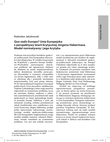 MYŚL POLITYCZNA Radosław Jakubowski Quo vadis Europo? Unia Europejska z perspektywy teorii krytycznej Jürgena Habermasa. Model normatywny i jego krytyka Dyskusja nad przyszłym kształtem społeczno-politycznym Unii Europejskiej wkroczyła w decydującą fazę. W wyniku rozszerzenia się Wspólnoty o państwa Europy Środkowo-Wschodniej nierozwiązane dotychczas problemy, jak ograniczona zdolność do działania na arenie międzynarodowej, deficyt demokracji, niewielka partycypacja obywatelska w wymiarze europejskim czy kryzys legitymizacji, dały o sobie znać ze zdwojoną siłą i postawiły mechanizm instytucjonalny Unii pod presją reformy. W tle wprowadzanych stopniowo rozwiązań politycznych (trwa procedura ratyfikacyjna Traktatu Lizbońskiego), które mają stanowić odpowiedź na wymienione problemy, toczy się ożywiony dyskurs naukowy z udziałem najwybitniejszych przedstawicieli nauk społecznych na temat optymalnego kształtu przyszłej Europy. Niektórzy z nich, jak niemiecki socjolog, wybitny przedstawiciel szkoły frankfurckiej oraz współtwórca tzw. teorii krytycznej, Jürgen Habermas, podjęli próbę opracowania całościowego, normatywnego modelu społeczno-politycznego dla Unii Europejskiej. Implementacja owego modelu miałaby stanowić, zdaniem Habermasa, swoiste remedium na wymienione problemy. Czy jest nim jednak rzeczywi- ście i czy zaproponowany przez Habermasa model normatywny jest możliwy do implementacji w obecnych warunkach społeczno-politycznych jednoczącej się Europy? Udzielenie odpowiedzi na te dwa zasadnicze pytania jest celem niniejszego artykułu. Uzyskanie ich powinno umożliwić nam dyskursywne zestawienie wizji Habermasa z krytycznymi argumentami wysuwanymi wobec jego koncepcji przez takie autorytety w dziedzinie nauk społecznych, jak m.in. Jürgen Gerhards, Peter Graf Kielmansegg, Wolfgang Merkel czy Fritz Scharpf. Artykuł ten rozpocznę od krótkiego zaprezentowania perspektywy poznawczej, na której opiera się teoria krytyczna. Z jej pozycji postaram się przedstawić za Habermasem diagnozę istniejącego status quo w wymiarze społeczno-politycznym w Unii Europejskiej. Następnie zrekonstruuję postulowane przez niemieckiego socjologa kierunki reform, którymi podążyć powinna Wspólnota Europejska. W konsekwencji wyłonią nam się zręby modelu normatywnego, zaproponowanego przez Habermasa. Model ów poddany zostanie krytyce ze strony innych naukowców biorących udział w debacie nad kształtem Unii Europejskiej. WROCŁAWSKIE STUDIA POLITOLOGICZNE 10/2009 Wrocławskie Studia Politologiczne 10, 2009 © for this edition by CNS III_kor_WSP_10.indd 15 2009-10-09 11:24:09 16 MYŚL POLITYCZNA Perspektywa poznawcza Aspiracją teorii krytycznej jest holistyczne przedstawienie rzeczywistości społeczno-politycznej (w kategoriach racjonalnych), ukierunkowane interesem poznawczym emancypującego się podmiotu. Teoria krytyczna, analizująca dialektyczne zależności determinujące kształt rzeczywistości społeczno-politycznej, oprócz krytycznej diagnozy istniejącego stanu rzeczy ma też na celu jego przeformułowanie, co znakomicie wpisuje się w „europejski” kontekst niniejszej pracy. Praca naukowa, która rości sobie pretensje do dialogicznego zestawienia różnych koncepcji teoretycznych, musi się starać ów cel zrealizować. Opowiedzenie się po którejś stronie determinuje sam temat pracy. Będzie to zatem, parafrazując słowa Maxa Horkheimera, stanowisko w pewien sposób opozycyjne i zarazem polemiczne w stosunku do rzeczywistości. „Osiągnięcie bowiem celu pożądanego z punktu widzenia opozycji wobec status quo nie jest możliwe bez jasnego rozeznania w sytuacji, tj. bez uświadomienia sobie zarówno tkwiących w niej zagrożeń, jak i warunków przezwyciężenia zgubnej tendencji”1. Do dziś wydaje się aktualny postulat będący jednym z głównych zadań teorii krytycznej, a mianowicie emancypacja człowieka ze zniewalających go stosunków – rozumna organizacja ludzkiego życia. Aspekt ten szczególnie widoczny stanie się przy zagadnieniu tzw. świadomości technokratycznej, będącej zdaniem Habermasa współczesną formą quasi-ideologii („panującej” także w UE), legitymizującą stosunki panowania. Habermas upatruje w przeniknięciu zafałszowań „świadomości technokratycznej”, której źródło tkwi w samowiedzy i metodologii nauk, podstawowe zadanie krytycznej teorii społecznej2. Na tym postulacie opiera się krytyczna diagnoza procesu integracji europejskiej przeprowadzona przez niemieckiego socjologa. Zadaniem teoretyka poddającego analizie stosunki społeczne jest więc nie tylko opis określonych prawidłowości i procesów, lecz przede wszystkim dokonanie świadomego wyboru o charakterze normatywnym ze względu na stosunek do praktycznej potrzeby w danym momencie rozwoju historycznego. Decydujący będzie dla nas walor prawdziwości teorii krytycznej, która demaskując sprzeczności rodzące kryzys, wskazuje zarazem perspektywę ich przezwyciężenia i działa w ten sposób na rzecz lepszego porządku. Prawda poznania, zgodnie z dialektyczną koncepcją teorii krytycznej, nie jest izolowanym sądem, lecz całością poznania, które nie może być określone raz na zawsze, lecz przeobraża się wraz z jej elementami. Trud ustalenia owej prawdy w danym momencie rozwoju historycznego podejmuje niniejszy artykuł. Będzie to więc niejako metakrytyka, gdyż krytycznej analizie poddany zostanie model, który został opracowany na podstawie teorii krytycznej. Jednak idąc za Habermasem: prawdy nie można traktować jako idealnej możności stwierdzenia, której miarą jest konsens osiągnięty w warunkach idealnych3; urzeczywistnienie „prawdy” nie jest bowiem możliwe, możliwe jest jedynie dochodzenie do prawdy – proces, niekończący się dyskurs, a owa prawda musi być traktowana jedynie jako antycypowany konsens co do rzeczywistości. Ekonomiczne determinanty procesu integra