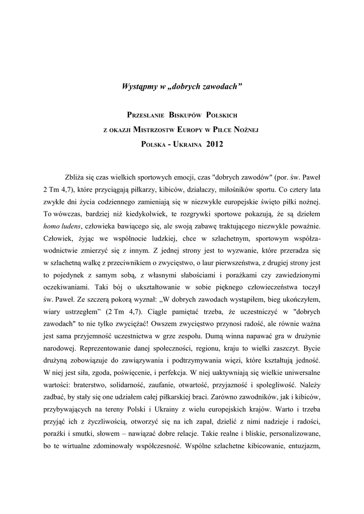 Wystąpmy w „dobrych zawodach” PRZESŁANIE BISKUPÓW POLSKICH Z OKAZJI MISTRZOSTW EUROPY W PIŁCE NOŻNEJ POLSKA - UKRAINA 2012 Zbliża się czas wielkich sportowych emocji, czas "dobrych zawodów" (por. św. Paweł 2 Tm 4,7), które przyciągają piłkarzy, kibiców, działaczy, miłośników sportu. Co cztery lata zwykłe dni życia codziennego zamieniają się w niezwykłe europejskie święto piłki nożnej. To wówczas, bardziej niż kiedykolwiek, te rozgrywki sportowe pokazują, że są dziełem homo ludens, człowieka bawiącego się, ale swoją zabawę traktującego niezwykle poważnie. Człowiek, żyjąc we wspólnocie ludzkiej, chce w szlachetnym, sportowym współzawodnictwie zmierzyć się z innym. Z jednej strony jest to wyzwanie, które przeradza się w szlachetną walkę z przeciwnikiem o zwycięstwo, o laur pierwszeństwa, z drugiej strony jest to pojedynek z samym sobą, z własnymi słabościami i porażkami czy zawiedzionymi oczekiwaniami. Taki bój o ukształtowanie w sobie pięknego człowieczeństwa toczył św. Paweł. Ze szczerą pokorą wyznał: „W dobrych zawodach wystąpiłem, bieg ukończyłem, wiary ustrzegłem” (2 Tm 4,7). Ciągle pamiętać trzeba, że uczestniczyć w "dobrych zawodach" to nie tylko zwyciężać! Owszem zwycięstwo przynosi radość, ale równie ważna jest sama przyjemność uczestnictwa w grze zespołu. Dumą winna napawać gra w drużynie narodowej. Reprezentowanie danej społeczności, regionu, kraju to wielki zaszczyt. Bycie drużyną zobowiązuje do zawiązywania i podtrzymywania więzi, które kształtują jedność. W niej jest siła, zgoda, poświęcenie, i perfekcja. W niej uaktywniają się wielkie uniwersalne wartości: braterstwo, solidarność, zaufanie, otwartość, przyjazność i spolegliwość. Należy zadbać, by stały się one udziałem całej piłkarskiej braci. Zarówno zawodników, jak i kibiców, przybywających na tereny Polski i Ukrainy z wielu europejskich krajów. Warto i trzeba przyjąć ich z życzliwością, otworzyć się na ich zapał, dzielić z nimi nadzieje i radości, porażki i smutki, słowem – nawiązać dobre relacje. Takie realne i bliskie, personalizowane, bo te wirtualne zdominowały współczesność. Wspólne szlachetne kibicowanie, entuzjazm, 2 emocje niech mają wymiar sportowy, niech będą wyrazem radości i wspierania własnej reprezentacji, ale także szacunku dla przeciwnika i jego godności. Niech idea jedności i braterstwa nie kończy się tylko na dialogu różnych religii, ale niech urzeczywistnia się w kibicowaniu, opartym na wzajemnej tolerancji. Niech zwolennicy drużyn narodowych szanują się, doceniają zdrową rywalizację, a w porażce widzą bodziec do jeszcze większego wysiłku. Okażmy naszą szlachetność serc podczas Euro 2012, bo ona jest równie ważna jak stadiony, drogi i hotele. Okażmy polską gościnność, kształtowaną przez Ewangelię. Nasza kultura narodowa po wielokroć dawała przykłady chrześcijańskiej otwartości na przybyszów. Gościnność stała się nawet swoistym wzorem kulturowym utrwalonym przez nakaz najwyższego szacunku dla wędrowców, wszak: „Gość w dom, Bóg w dom”. Okażmy zatem piękno naszej kultury, tej z idei solidarności i dumy z tego, co Polskę stanowi. Okażmy ducha wspólnej wiary i modlitwy, gdy w jednym kościele przyjdzie nam modlić się z przyjezdnymi kibicami. Dla nich otwieramy nasze świątynie i służymy pomocą duszpasterską. Ale oczekujemy też wzajemnego szacunku wobec każdego z nas, naszej kultury i wiary. Niech to będzie czas, nacechowany budowaniem pięknych więzi społecznych. Wszystkich zawodników i kibiców ogarniamy naszą modlitwą i prosimy Pana, by Jego błogosławieństwo wspierało tych, którzy chcą w tych „dobrych zawodach” uczestniczyć. Niech wszechmogący Bóg da nam siłę do podążania drogą Jego przykazań i nam błogosławi: Ojciec i Syn, i Duch Święty. Podpisali Kardynałowie, Arcybiskupi i Biskupi Polscy Warszawa, 10 maja 2012 r. __________________________________ KURIA METROPOLITALNA WROCŁAWSKA L.dz. 670/2012 Zarządzenie Powyższe Przesłanie Biskupów Polskich należy odczytać podczas wszystkich Mszy świętych w kościołach i kaplicach miasta Wrocławia w niedzielę 3 czerwca 2012 r. Wrocław, 30.05.2012 r. WIKARIUSZ GENERALNY
