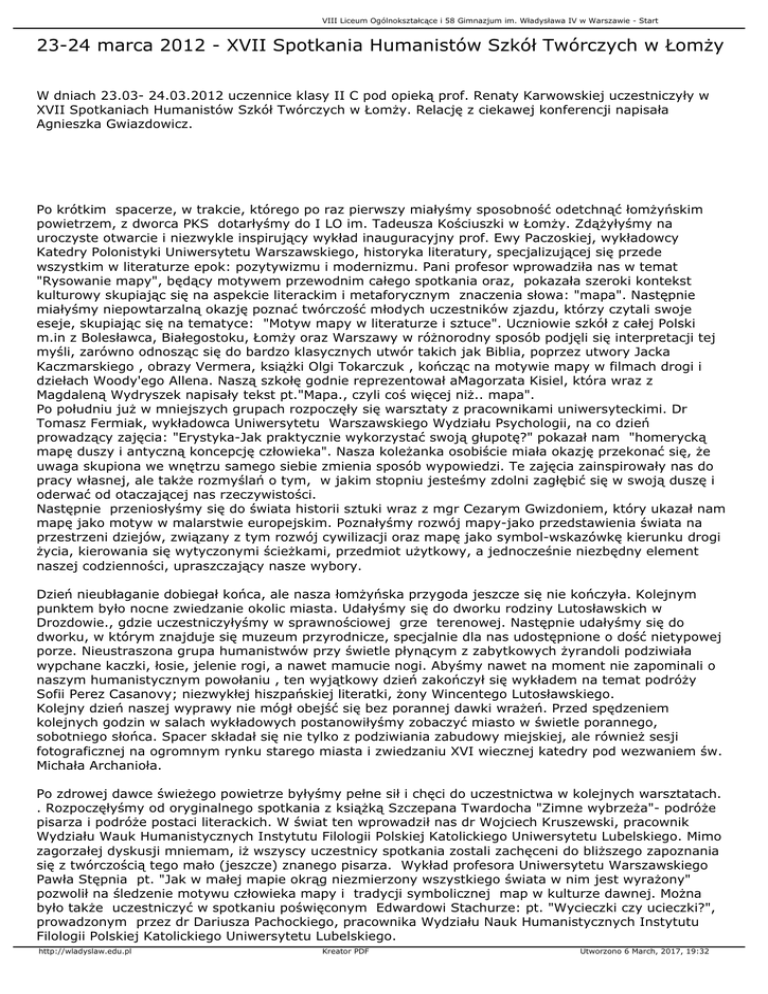VIII Liceum Ogólnokształcące i 58 Gimnazjum im. Władysława IV w Warszawie - Start 23-24 marca 2012 - XVII Spotkania Humanistów Szkół Twórczych w Łomży W dniach 23.03- 24.03.2012 uczennice klasy II C pod opieką prof. Renaty Karwowskiej uczestniczyły w XVII Spotkaniach Humanistów Szkół Twórczych w Łomży. Relację z ciekawej konferencji napisała Agnieszka Gwiazdowicz. Po krótkim spacerze, w trakcie, którego po raz pierwszy miałyśmy sposobność odetchnąć łomżyńskim powietrzem, z dworca PKS dotarłyśmy do I LO im. Tadeusza Kościuszki w Łomży. Zdążyłyśmy na uroczyste otwarcie i niezwykle inspirujący wykład inauguracyjny prof. Ewy Paczoskiej, wykładowcy Katedry Polonistyki Uniwersytetu Warszawskiego, historyka literatury, specjalizującej się przede wszystkim w literaturze epok: pozytywizmu i modernizmu. Pani profesor wprowadziła nas w temat "Rysowanie mapy", będący motywem przewodnim całego spotkania oraz, pokazała szeroki kontekst kulturowy skupiając się na aspekcie literackim i metaforycznym znaczenia słowa: "mapa". Następnie miałyśmy niepowtarzalną okazję poznać twórczość młodych uczestników zjazdu, którzy czytali swoje eseje, skupiając się na tematyce: "Motyw mapy w literaturze i sztuce". Uczniowie szkół z całej Polski m.in z Bolesławca, Białegostoku, Łomży oraz Warszawy w różnorodny sposób podjęli się interpretacji tej myśli, zarówno odnosząc się do bardzo klasycznych utwór takich jak Biblia, poprzez utwory Jacka Kaczmarskiego , obrazy Vermera, książki Olgi Tokarczuk , kończąc na motywie mapy w filmach drogi i dziełach Woody'ego Allena. Naszą szkołę godnie reprezentował aMagorzata Kisiel, która wraz z Magdaleną Wydryszek napisały tekst pt."Mapa., czyli coś więcej niż.. mapa". Po południu już w mniejszych grupach rozpoczęły się warsztaty z pracownikami uniwersyteckimi. Dr Tomasz Fermiak, wykładowca Uniwersytetu Warszawskiego Wydziału Psychologii, na co dzień prowadzący zajęcia: "Erystyka-Jak praktycznie wykorzystać swoją głupotę?" pokazał nam "homerycką mapę duszy i antyczną koncepcję człowieka". Nasza koleżanka osobiście miała okazję przekonać się, że uwaga skupiona we wnętrzu samego siebie zmienia sposób wypowiedzi. Te zajęcia zainspirowały nas do pracy własnej, ale także rozmyślań o tym, w jakim stopniu jesteśmy zdolni zagłębić się w swoją duszę i oderwać od otaczającej nas rzeczywistości. Następnie przeniosłyśmy się do świata historii sztuki wraz z mgr Cezarym Gwizdoniem, który ukazał nam mapę jako motyw w malarstwie europejskim. Poznałyśmy rozwój mapy-jako przedstawienia świata na przestrzeni dziejów, związany z tym rozwój cywilizacji oraz mapę jako symbol-wskazówkę kierunku drogi życia, kierowania się wytyczonymi ścieżkami, przedmiot użytkowy, a jednocześnie niezbędny element naszej codzienności, upraszczający nasze wybory. Dzień nieubłaganie dobiegał końca, ale nasza łomżyńska przygoda jeszcze się nie kończyła. Kolejnym punktem było nocne zwiedzanie okolic miasta. Udałyśmy się do dworku rodziny Lutosławskich w Drozdowie., gdzie uczestniczyłyśmy w sprawnościowej grze terenowej. Następnie udałyśmy się do dworku, w którym znajduje się muzeum przyrodnicze, specjalnie dla nas udostępnione o dość nietypowej porze. Nieustraszona grupa humanistwów przy świetle płynącym z zabytkowych żyrandoli podziwiała wypchane kaczki, łosie, jelenie rogi, a nawet mamucie nogi. Abyśmy nawet na moment nie zapominali o naszym humanistycznym powołaniu , ten wyjątkowy dzień zakończył się wykładem na temat podróży Sofii Perez Casanovy; niezwykłej hiszpańskiej literatki, żony Wincentego Lutosławskiego. Kolejny dzień naszej wyprawy nie mógł obejść się bez porannej dawki wrażeń. Przed spędzeniem kolejnych godzin w salach wykładowych postanowiłyśmy zobaczyć miasto w świetle porannego, sobotniego słońca. Spacer składał się nie tylko z podziwiania zabudowy miejskiej, ale również sesji fotograficznej na ogromnym rynku starego miasta i zwiedzaniu XVI wiecznej katedry pod wezwaniem św. Michała Archanioła. Po zdrowej dawce świeżego powietrze byłyśmy pełne sił i chęci do uczestnictwa w kolejnych warsztatach. . Rozpoczęłyśmy od oryginalnego spotkania z książką Szczepana Twardocha "Zimne wybrzeża"- podróże pisarza i podróże postaci literackich. W świat ten wprowadził nas dr Wojciech Kruszewski, pracownik Wydziału Wauk Humanistycznych Instytutu Filologii Polskiej Katolickiego Uniwersytetu Lubelskiego. Mimo zagorzałej dyskusji mniemam, iż wszyscy uczestnicy spotkania zostali zachęceni do bliższego zapoznania się z twórczością tego mało (jeszcze) znanego pisarza. Wykład profesora Uniwersytetu Warszawskiego Pawła Stępnia pt. "Jak w małej mapie okrąg niezmierzony wszystkiego świata w nim jest wyrażony" pozwolił na śledzenie motywu człowieka mapy i tradycji symbolicznej map w kulturze dawnej. Można było także uczestniczyć w spotkaniu poświęconym Edwardowi Stachurze: pt. "Wycieczki czy ucieczki?", prowadzonym przez dr Dariusza Pachockiego, pracownika Wydziału Nauk Humanistycznych Instytutu Filologii Polskiej Katolickiego Uniwersytetu Lubelskiego. http://wladyslaw.edu.pl Kreator PDF Utworzono 6 March, 2017, 19:32 VIII Liceum Ogólnokształcące i 58 Gimnazjum im. Władysława IV w Warszawie - Start Niestety czas naszego pobytu w Łomży dobiegł końca. Pełne wrażeń, inspiracji, refleksji i niedosytu opuściłyśmy to barwne i nieodkryte jeszcze przez nas gościnne miasto. http://wladyslaw.edu.pl Kreator PDF Utworzono 6 March, 2017, 19:32