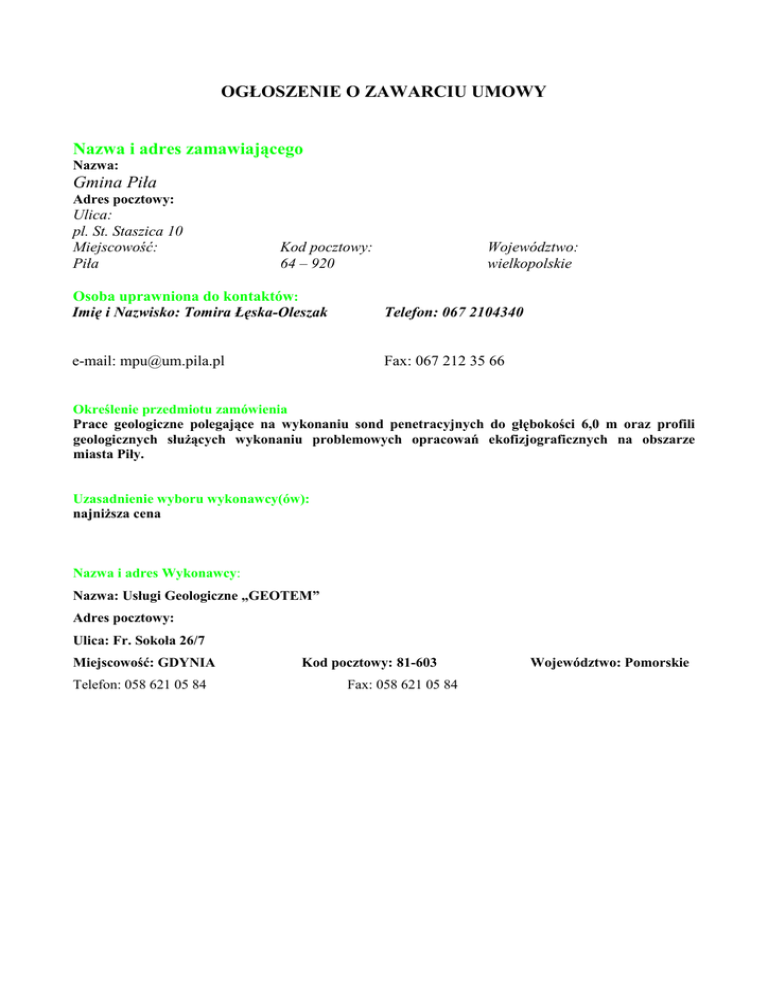 OGŁOSZENIE O ZAWARCIU UMOWY Nazwa i adres zamawiającego Nazwa: Gmina Piła Adres pocztowy: Ulica: pl. St. Staszica 10 Miejscowość: Piła Kod pocztowy: 64 – 920 Województwo: wielkopolskie Osoba uprawniona do kontaktów: Imię i Nazwisko: Tomira Łęska-Oleszak Telefon: 067 2104340 e-mail: [email protected] Fax: 067 212 35 66 Określenie przedmiotu zamówienia Prace geologiczne polegające na wykonaniu sond penetracyjnych do głębokości 6,0 m oraz profili geologicznych słuŜących wykonaniu problemowych opracowań ekofizjograficznych na obszarze miasta Piły. Uzasadnienie wyboru wykonawcy(ów): najniŜsza cena Nazwa i adres Wykonawcy: Nazwa: Usługi Geologiczne „GEOTEM” Adres pocztowy: Ulica: Fr. Sokoła 26/7 Miejscowość: GDYNIA Telefon: 058 621 05 84 Kod pocztowy: 81-603 Fax: 058 621 05 84 Województwo: Pomorskie