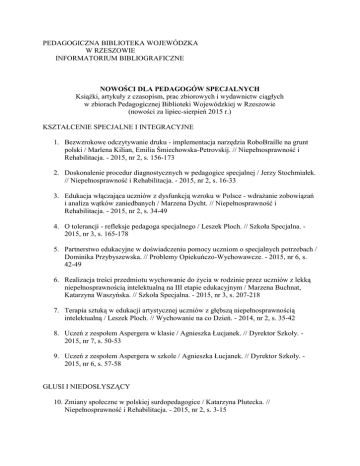 PEDAGOGICZNA BIBLIOTEKA WOJEWÓDZKA W RZESZOWIE INFORMATORIUM BIBLIOGRAFICZNE NOWOŚCI DLA PEDAGOGÓW SPECJALNYCH Książki, artykuły z czasopism, prac zbiorowych i wydawnictw ciągłych w zbiorach Pedagogicznej Biblioteki Wojewódzkiej w Rzeszowie (nowości za lipiec-sierpień 2015 r.) KSZTAŁCENIE SPECJALNE I INTEGRACYJNE 1. Bezwzrokowe odczytywanie druku - implementacja narzędzia RoboBraille na grunt polski / Marlena Kilian, Emilia Śmiechowska-Petrovskij. // Niepełnosprawność i Rehabilitacja. - 2015, nr 2, s. 156-173 2. Doskonalenie procedur diagnostycznych w pedagogice specjalnej / Jerzy Stochmiałek. // Niepełnosprawność i Rehabilitacja. - 2015, nr 2, s. 16-33 3. Edukacja włączająca uczniów z dysfunkcją wzroku w Polsce - wdrażanie zobowiązań i analiza wątków zaniedbanych / Marzena Dycht. // Niepełnosprawność i Rehabilitacja. - 2015, nr 2, s. 34-49 4. O tolerancji - refleksje pedagoga specjalnego / Leszek Ploch. // Szkoła Specjalna. 2015, nr 3, s. 165-178 5. Partnerstwo edukacyjne w doświadczeniu pomocy uczniom o specjalnych potrzebach / Dominika Przybyszewska. // Problemy Opiekuńczo-Wychowawcze. - 2015, nr 6, s. 42-49 6. Realizacja treści przedmiotu wychowanie do życia w rodzinie przez uczniów z lekką niepełnosprawnością intelektualną na III etapie edukacyjnym / Marzena Buchnat, Katarzyna Waszyńska. // Szkoła Specjalna. - 2015, nr 3, s. 207-218 7. Terapia sztuką w edukacji artystycznej uczniów z głębszą niepełnosprawnością intelektualną / Leszek Ploch. // Wychowanie na co Dzień. - 2014, nr 2, s. 35-42 8. Uczeń z zespołem Aspergera w klasie / Agnieszka Łucjanek. // Dyrektor Szkoły. 2015, nr 7, s. 50-53 9. Uczeń z zespołem Aspergera w szkole / Agnieszka Łucjanek. // Dyrektor Szkoły. 2015, nr 6, s. 57-58 GŁUSI I NIEDOSŁYSZĄCY 10. Zmiany społeczne w polskiej surdopedagogice / Katarzyna Plutecka. // Niepełnosprawność i Rehabilitacja. - 2015, nr 2, s. 3-15 11. Życie w ciszy / Anna Wiśniewska. // Charaktery. - 2015, nr 8, s. 54-57 NIEWIDOMI I NIEDOWIDZĄCY 12. Majoryzacja wyobrażeniowa figur poznawanych dotykowo przez osoby widzące i niewidome od urodzenia = Mental majorization of figures tactilely explored by sighted and congenitally blind individuals / Magdalena Szubielska. // Roczniki Psychologiczne. - T. 18, nr 1 (2015), s. 109-132 13. Polska myśl tyflopedagogiczna rozwijana za granicą / Jadwiga Kuczyńska-Kwapisz. // Szkoła Specjalna. - 2015, nr 3, s. 229-235 14. Udostępnianie kultury obrazu osobom niewidomym i słabowidzącym z zastosowaniem audiodeskrypcji / Marzena Dycht. // Szkoła Specjalna. - 2015, nr 3, s. 179-188 NIEPEŁNOSPRAWNOŚĆ RUCHOWA 15. Nadzieja i ton afektywny narracji a wzrost potraumatyczny osób, które utraciły sprawność ruchową = Hope and the affective tone of narratives as correlates of posttraumatic growth in people who have lost motor ability / Mariusz Zięba. // Roczniki Psychologiczne. - T. 18, nr 1 (2015), s. 41-59 16. Pozytywne kategorie w analizie przystosowania do życia z nabytą niepełnosprawnością ruchową / Stanisława Byra. // Niepełnosprawność i Rehabilitacja. - 2015, nr 2, s. 50-70 CHORZY PRZEWLEKLE 17. Radość wysłana w kopercie / Eliza Idczak. // Życie Szkoły. - 2015, nr 6, s. 10-12 NIEPEŁNOSPRAWNOŚĆ UMYSŁOWA 18. Prawa wyborcze osób z niepełnosprawnością intelektualną - sprzeczność Konstytucji RP z międzynarodowym standardem praw człowieka / Małgorzata Szeroczyńska. // Szkoła Specjalna. - 2015, nr 3, s. 223-228 19. Trudności rodziców w wychowaniu i opiece nad dorosłymi osobami z niepełnosprawnością intelektualną / Łukasz Koperski. // Niepełnosprawność i Rehabilitacja. - 2015, nr 2, s. 144-155 ZESPÓŁ DOWNA 20. Kształtowanie rozumienia języka u dziecka z zespołem Downa / Karolina Pernal. // Forum Logopedy. - 2015, nr 7, s. 41-45 AUTYZM 21. Terapeutyczne wykorzystanie klocków LEGO w pracy z dziećmi z autyzmem : (z badań nad inicjowaniem i podtrzymywaniem interakcji społecznych) / Agnieszka Łaba. // Niepełnosprawność i Rehabilitacja. - 2015, nr 2, s. 105-120 MÓZGOWE PORAŻENIE DZIECIĘCE 22. Jakość życia rodziców dzieci z mózgowym porażeniem dziecięcym / Magdalena Wędzińska. // Niepełnosprawność i Rehabilitacja. - 2015, nr 2, s. 121-143 23. Zastosowanie Makatonu w terapii dziecka niewerbalnego z mózgowym porażeniem dziecięcym / Aleksandra Scheller. // Forum Logopedy. - 2015, nr 7, s. 17-22 CHOROBY PSYCHICZNE 24. Między ciszą a słowem / Barbara Ołdakowska-Żyłka. // Forum Logopedy. - 2015, nr 7, s. 58-61 25. Psychologiczne uwarunkowania powrotu do zdrowia osób hospitalizowanych z diagnozą zaburzeń z kręgu schizofrenii / Bogumiła Witkowska. // Przegląd Psychologiczny. - T. 58, nr 1 (2015), s. 101-116 TERAPIA I REHABILITACJA 26. Dogoterapia jako metoda wspierająca terapię dziecka z głęboką niepełnosprawnością intelektualną / Agnieszka Cypress. // Szkoła Specjalna. - 2015, nr 3, s. 219-222 27. Dziecko z niesamoistnie opóźnionym rozwojem mowy na tle rzadkiej choroby genetycznej Pelizaeusa-Merzbachera / Aleksandra Listwoń. // Forum Logopedy. 2015, nr 7, s. 11-16 28. Innowacje społeczne w praktyce rehabilitacji osób z niepełnosprawnością intelektualną - przykład modelu / Ryszard Necel, Natalia Wasielewska. // Niepełnosprawność i Rehabilitacja. - 2015, nr 2, s. 91-104 29. Istota i szczególność zaburzeń mowy oraz terapii logopedycznej dzieci z niepełnosprawnością wzrokową / Marzenna Zaorska. // Forum Logopedy. - 2015, nr 7, s. 46-50 30. Propozycja programu dogoterapii na przykładzie dziecka z głęboką niepełnosprawnością intelektualną - opis przypadku / Aleksandra Jankiewicz, Damian Skrypnik, Katarzyna Skrypnik. // Niepełnosprawność i Rehabilitacja. - 2015, nr 2, s. 180-189 31. Przegląd rozwiązań technicznych wspomagających pionizację i chodzenie / Jacek S. Tutak. // Niepełnosprawność i Rehabilitacja. - 2015, nr 2, s. 174-180 NIEPEŁNOSPRAWNI W SPOŁECZEŃSTWIE 3