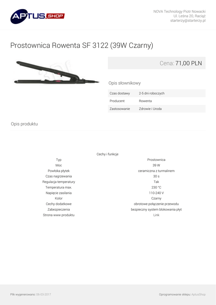 NOVA Technology Piotr Nowacki Ul. Leśna 20, Raciąż [email protected] Prostownica Rowenta SF 3122 (39W Czarny) Cena: 71,00 PLN Opis słownikowy Czas dostawy 2-5 dni roboczych Producent Rowenta Zastosowanie Zdrowie i Uroda Opis produktu Cechy i funkcje Typ Prostownica Moc 39 W Powłoka płytek ceramiczna z turmalinem Czas nagrzewania 30 s Regulacja temperatury Tak Temperatura max. 230 °C Napięcie zasilania 110-240 V Kolor Czarny Cechy dodatkowe obrotowe połączenie przewodu Zabezpieczenia bezpieczny system blokowania płyt Strona www produktu Link Plik wygenerowano: 06-03-2017 Powered by TCPDF (www.tcpdf.org) Oprogramowanie sklepu: AptusShop