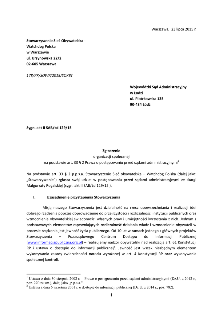 Warszawa, 23 lipca 2015 r. Stowarzyszenie Sied Obywatelska Watchdog Polska w Warszawie ul. Ursynowska 22/2 02-605 Warszawa 178/PK/SOWP/2015/SOKBT Wojewódzki Sąd Administracyjny w Łodzi ul. Piotrkowska 135 90-434 Łódź Sygn. akt II SAB/Łd 129/15 Zgłoszenie organizacji społecznej na podstawie art. 33 § 2 Prawa o postępowaniu przed sądami administracyjnymi1 Na podstawie art. 33 § 2 p.p.s.a. Stowarzyszenie Sied obywatelska – Watchdog Polska (dalej jako: „Stowarzyszenie”) zgłasza swój udział w postępowaniu przed sądami administracyjnymi ze skargi Małgorzaty Rogalskiej (sygn. akt II SAB/Łd 129/15 ). I. Uzasadnienie przystąpienia Stowarzyszenia Misją naszego Stowarzyszenia jest działalnośd na rzecz upowszechniania i realizacji idei dobrego rządzenia poprzez doprowadzenie do przejrzystości i rozliczalności instytucji publicznych oraz wzmocnienie obywatelskiej świadomości własnych praw i umiejętności korzystania z nich. Jednym z podstawowych elementów zapewniających rozliczalnośd działania władz i wzmocnienie obywateli w procesie rządzenia jest jawnośd życia publicznego. Od 10 lat w ramach jednego z głównych projektów Stowarzyszenia – Pozarządowego Centrum Dostępu do Informacji Publicznej (www.informacjapubliczna.org.pl) – realizujemy nadzór obywatelski nad realizacją art. 61 Konstytucji RP i ustawy o dostępie do informacji publicznej2. Jawnośd jest wszak niezbędnym elementem wykonywania zasady zwierzchności narodu wyrażonej w art. 4 Konstytucji RP oraz wykonywania społecznej kontroli. 1 Ustawa z dnia 30 sierpnia 2002 r. – Prawo o postępowaniu przed sądami administracyjnymi (Dz.U. z 2012 r., poz. 270 ze zm.), dalej jako „p.p.s.a.”. 2 Ustawa z dnia 6 września 2001 r. o dostępie do informacji publicznej (Dz.U. z 2014 r., poz. 782). 1 Stowarzyszenie prowadzi poradnictwo w zakresie spraw związanych z obywatelskim prawem do informacji publicznej. Jesteśmy wielokrotnie stroną postępowao administracyjnych i sądowoadmnistracyjnych, jak również uczestnikiem tych postępowao jako organizacja społeczna. Wskazane okoliczności, składając się na doświadczenie Stowarzyszenia w zakresie prawa do informacji publicznej, przemawiają, naszym zdaniem, za dopuszczeniem Stowarzyszenia do sprawy ze skargi Małgorzaty Rogalskiej w charakterze organizacji społecznej. II. Stan faktyczny sprawy Przedmiotem postępowania, toczącego się przed tutejszym sądem, jest skarga na bezczynnośd Zakładu Wodociągów i Kanalizacji Sp. z o.o z siedzibą w Pabianicach. Wnioskodawca – Małgorzata Rogalska - zwróciła się o udostępnienie informacji dotyczącej umów zawieranych z kontrahentami za lata 2014-2015, darowizn i zwolnieo z długu dokonanych przez Spółkę, dokapitalizowania Spółki przez gminę w latach 2013-2015, aktualnego zadłużenia spółki, rejestru umów darowizny i sponsoringowych za lata 2010-2014, umów zawieranych z członkami Zarządu i Rady Nadzorczej, listy pracowników zatrudnionych na podstawie umowy o pracę, umów cywilnoprawnych oraz kontraktów menedżerskich. W odpowiedzi na wniosek organ udostępnił informacje dotyczące dokonanych darowizn oraz umów sponsoringowych, zadłużenia Spółki oraz dokapitalizowania Spółki przez gminę. W pozostałej części wnioskodawca został poinformowany, iż członkowie Rady Nadzorczej nie są zatrudnieni w ramach umowy o pracę, a na podstawie powołania, natomiast umowy o pracę członków Zarządu nie stanowią informacji publicznej w rozumieniu u.d.i.p. Co do umów zawieranych z kontrahentami oraz pracownikami Spółki, organ powołał się na ograniczenia zawarte w art. 5 ust. 2 u.d.i.p. III. Problem prawny W przedmiotowej sprawie należy ocenid, czy organ, do którego wpływa wniosek o udostępnienie informacji publicznej, prawidłowo ocenił, iż prawo do informacji publicznej nie obejmuje wiedzy o osobach zatrudnionych, informacji o zawartych umowach oraz umowach z członkami Zarządu Spółki. Skarżąca szeroko odniosła się do tego zagadnienia wskazując, iż Zakład Wodociągów i Kanalizacji Sp. z o.o. jest spółką komunalną, powołaną na podstawie ustawy o gospodarce komunalnej. Skarżąca słusznie odwołała się do przepisów wskazanej ustawy, z których to wynika, iż podmiot, jakim jest spółka komunalna powoływany jest w celu wykonywania zadao gminy. Są to zatem zadania publiczne, związane z gospodarowaniem mieniem komunalnym, co powoduje poddanie ich konstytucyjnej zasadzie jawności. Prawidłowo skarżąca odwołała się do orzecznictwa Wojewódzkiego Sądu Administracyjnego, którego przedmiotem oceny były podobne zagadnienia. Jednoznacznie skład orzekający ocenił, iż spółka komunalna jest podmiotem zobowiązanym do udostępnienia informacji publicznej na gruncie art. 4 u.d.i.p. (por. wyrok o sygn. akt IV SAB/Gl 9/15). Dodatkowo, należy pozytywnie ocenid przywołane przez Skarżącą orzeczenia Naczelnego Sądu Administracyjnego, które nie pozostawia wątpliwości, iż umowy o pracę stanowią informację publiczną. Takie stanowisko wynika również wprost z przepisów u.d.i.p – tj. art. 6 ust. 1 pkt. 5 lit. d 2 u.d.i.p. - wnioskowane dokumenty rodzą po stronie spółki zobowiązania finansowe. Jeżeli natomiast Spółka uznaje, iż takie umowy zawierają dane chronione ze względu na prywatnośd osoby fizycznej, winna wydad decyzję administracyjną odmawiającą udostępnienia informacji publicznej w zakresie treści, które winna chronid (por. wyrok o sygn. akt II SAB/Sz 61/15, II SAB/Wa 503/12). Ponadto, należy negatywnie odnieśd się do twierdzenia organu, iż mnogośd pytao skierowanych przez Skarżącą do Spółki powoduje dezorganizację jej pracy i uniemożliwia zajmowanie się wykonywaniem zadao zleconych przez gminę. Poprzez utrudnianie udostępnienia wnioskowanych informacji zgodnie z przepisami ustawy, organ sam uniemożliwia sobie pracę. Błędne działanie Zakładu Wodociągów i Kanalizacji Sp. z o.o. nie