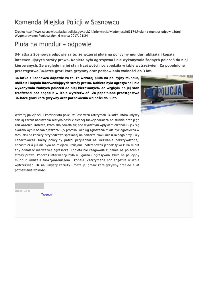Komenda Miejska Policji w Sosnowcu Źródło: http://www.sosnowiec.slaska.policja.gov.pl/k24/informacje/wiadomosci/61174,Plula-na-mundur-odpowie.html Wygenerowano: Poniedziałek, 6 marca 2017, 21:24 Pluła na mundur – odpowie 34-latka z Sosnowca odpowie za to, że wczoraj pluła na policyjny mundur, ubliżała i kopała interweniujących stróży prawa. Kobieta była agresywna i nie wykonywała żadnych poleceń do niej kierowanych. Ze względu na jej stan trzeźwości noc spędziła w izbie wytrzeźwień. Za popełnione przestępstwo 34-latce grozi kara grzywny oraz pozbawienia wolności do 3 lat. 34-latka z Sosnowca odpowie za to, że wczoraj pluła na policyjny mundur, ubliżała i kopała interweniujących stróży prawa. Kobieta była agresywna i nie wykonywała żadnych poleceń do niej kierowanych. Ze względu na jej stan trzeźwości noc spędziła w izbie wytrzeźwień. Za popełnione przestępstwo 34-latce grozi kara grzywny oraz pozbawienia wolności do 3 lat. Wczoraj policjanci III komisariatu policji w Sosnowcu zatrzymali 34-latkę, która usłyszy dzisiaj zarzut naruszenia nietykalności cielesnej funkcjonariusza na służbie oraz jego znieważenia. Kobieta, która znajdowała się pod wyraźnym wpływem alkoholu – jak się okazało wynik badania wskazał 2,5 promila, według zgłoszenia miała być agresywna w stosunku do kobiety przypadkowo spotkanej na parterze bloku mieszkalnego przy ulicy Lenartowicza. Kiedy policyjny patrol przyjechał na wezwanie pokrzywdzonej, napastniczki już nie było na miejscu. Policjanci potrzebowali jednak tylko kilka minut aby odnaleźć nietrzeźwą agresorkę. Kobieta nie reagowała zupełnie na polecenia stróży prawa. Podczas interwencji była wulgarna i agresywna. Pluła na policyjny mundur, ubliżała funkcjonariuszom i kopała. Zatrzymana noc spędziła w izbie wytrzeźwień. Dzisiaj usłyszy zarzuty i może jej grozić kara grzywny oraz do 3 lat pozbawienia wolności. Ocena: 0/5 (0) Tweetnij