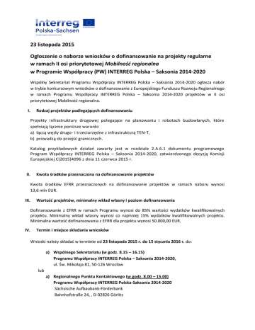 23 listopada 2015 Ogłoszenie o naborze wniosków o dofinansowanie na projekty regularne w ramach II osi priorytetowej Mobilność regionalna w Programie Współpracy (PW) INTERREG Polska – Saksonia 2014-2020 Wspólny Sekretariat Programu Współpracy INTERREG Polska – Saksonia 2014-2020 ogłasza nabór w trybie konkursowym wniosków o dofinansowanie z Europejskiego Funduszu Rozwoju Regionalnego w ramach Programu Współpracy INTERREG Polska – Saksonia 2014-2020 projektów w II osi priorytetowej Mobilność regionalna. I. Rodzaj projektów podlegających dofinansowaniu Projekty infrastruktury drogowej polegające na planowaniu i robotach budowlanych, które spełniają łącznie poniższe warunki: a) łączą węzły drugo- i trzeciorzędne z infrastrukturą TEN-T, b) prowadzą do przejść granicznych. Katalog przykładowych działań zawarty jest w rozdziale 2.A.6.1 dokumentu programowego Program Współpracy INTERREG Polska – Saksonia 2014-2020, zatwierdzonego decyzją Komisji Europejskiej C(2015)4096 z dnia 11 czerwca 2015 r. II. Kwota środków przeznaczona na dofinansowanie projektów Kwota środków EFRR przeznaczonych na dofinansowanie projektów w ramach naboru wynosi 13,6 mln EUR. III. Wartość projektów, minimalny wkład własny i poziom dofinansowania Dofinansowanie z EFRR w ramach Programu wynosi do 85% wartości wydatków kwalifikowalnych projektu. Minimalny wkład własny wynosi co najmniej 15% wydatków kwalifikowalnych projektu. Minimalna wartość dofinansowania z EFRR dla projektu wynosi 50.000,00 EUR. IV. Termin i miejsce składania wniosków Wnioski należy składać w terminie od 23 listopada 2015 r. do 15 stycznia 2016 r. do: a) Wspólnego Sekretariatu (w godz. 8.15 – 16.15) Programu Współpracy INTERREG Polska – Saksonia 2014-2020, ul. Św. Mikołaja 81, 50-126 Wrocław lub a) Regionalnego Punktu Kontaktowego (w godz. 8.00 – 15.00) Programu Współpracy INTERREG Polska-Saksonia 2014-2020 Sächsische Aufbaubank-Förderbank Bahnhofstraße 24, , D-02826 Görlitz Ostateczny termin składania wniosków o dofinansowanie upływa 15 stycznia 2016 r. o godz. 16.15. Wnioski, które wpłyną po tym terminie nie będą rozpatrywane. Wniosek o dofinansowanie projektu wraz z załącznikami może być złożony osobiście przez przedstawiciela wnioskodawcy, lub za pośrednictwem podmiotu świadczącego usługi pocztowe, kurierskie lub innego doręczyciela. Decyduje data wpływu do Wspólnego Sekretariatu lub Regionalnego Punktu Kontaktowego w Görlitz. V. Rodzaj podmiotów, które mogą ubiegać się o dofinansowanie. Uprawnione do składania wniosków są podmioty wymienione niżej, przy czym każdy projekt musi być projektem partnerskim. W skład partnerstwa powinien wchodzić przynajmniej jeden partner z Polski i przynajmniej jeden z Saksonii. Wyłącznie partner z Polski lub Saksonii może być beneficjentem wiodącym. Wniosek w imieniu partnerstwa składa beneficjent wiodący. W ramach naboru o dofinansowanie projektów mogą się ubiegać: a) jednostki administracji państwowej, regionalnej i lokalnej, stowarzyszenia tych jednostek i instytucje im podległe, b) podmioty ustanowione zgodnie z prawem publicznym lub prywatnym dla konkretnego celu zaspokajania potrzeb w interesie ogólnym (nieposiadające charakteru przemysłowego lub handlowego), c) organizacje pozarządowe non-profit, stowarzyszenia oraz organizacje partnerstwa społecznego i gospodarczego. Szczegółowe zapisy dot. kwalifikowalności podmiotów znajdują się w rozdziale II. Beneficjenci Podręcznika Programu. VI. Obszar wsparcia Programu Współpracy INTERREG Polska – Saksonia 2014-2020 Obszar wsparcia Programu Współpracy INTERREG Polska-Saksonia obejmuje: po polskiej stronie: podregion jeleniogórski (powiaty: bolesławiecki, jaworski, jeleniogórski, kamiennogórski, lubański, lwówecki, zgorzelecki, złotoryjski i m. Jelenia Góra) w województwie dolnośląskim oraz powiat żarski w województwie lubuskim, po niemieckiej stronie: powiaty Görlitz i Bautzen w Saksonii. Szczegółowe zasady dotyczące realizowania w ramach projektów działań na obszarze wsparcia i poza tym obszarem oraz udziału w projektach partnerów spoza obszaru wsparcia zawarte są w Podręczniku Programu. Szczególne terytoria docelowe dla projektów realizowanych w ramach osi II to obszary gmin/powiatów w pasie przygranicznym, tj. bezpośrednio przylegające do granicy polsko-saksońskiej. VII. Forma złożenia wniosku Wniosek należy złożyć w formie wydruku w dwóch jednobrzmiących wersjach językowych: w języku polskim i języku niemieckim. Wniosek powinien zostać złożony w jednym egzemplarzu w każdej wersji językowej, parafowanym na dole każdej strony i podpisanym w wyznaczonych miejscach (czytelny podpis bądź podpis ze stemplem imiennym) przez osobę/osoby upoważnione do reprezentowania wnioskodawcy (partnera wiodącego). Poszczególne części wniosku powinny zostać – po wypełnieniu i wydrukowaniu – spięte / zszyte / połączone w inny sposób zapewniający zachowanie układu kolejnych części wniosku o dofinansowanie. Oświadczenia i załączniki składane są w jednej wersji językowej – w języku partnera, którego dotyczą (odpowiednio j. polski lub j. niemiecki). Oświadczenia powinny zostać przedstawione w oryginale; pozostałe załączniki – w oryginale lub kopii poświadczonej za zgodność z oryginałem (z czytelnym podpisem lub podpisem wraz ze stemplem imiennym osoby potwierdzającej zgodność z oryginałem). Do wniosku w wersji papierowej należy dołączyć jego wersję elektroniczną. Elektroniczna wersja wniosku powinna zostać przekazana na wybranym nośniku (płyta CD, pendrive). Należy zapisać na nim edytowalną wersję wniosku, a także wersję PDF. VIII. Kryteria oceny i wyboru projektów Zasady oceny wniosków o dofinansowanie oraz wyboru projektów do dofinansowania zawarte są w Podręczniku Programu w rozdziałach IV.1.8.4 oraz IV.1.8.5. IX. Rozst