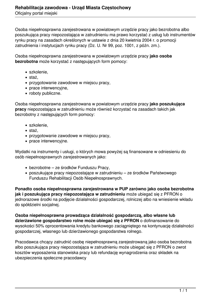 Rehabilitacja zawodowa - Urząd Miasta Częstochowy Oficjalny portal miejski Osoba niepełnosprawna zarejestrowana w powiatowym urzędzie pracy jako bezrobotna albo poszukująca pracy niepozostająca w zatrudnieniu ma prawo korzystać z usług lub instrumentów rynku pracy na zasadach określonych w ustawie z dnia 20 kwietnia 2004 r. o promocji zatrudnienia i instytucjach rynku pracy (Dz. U. Nr 99, poz. 1001, z późn. zm.). Osoba niepełnosprawna zarejestrowana w powiatowym urzędzie pracy jako osoba bezrobotna może korzystać z następujących form pomocy: szkolenie, staż, przygotowanie zawodowe w miejscu pracy, prace interwencyjne, roboty publiczne. Osoba niepełnosprawna zarejestrowana w powiatowym urzędzie pracy jako poszukująca pracy niepozostająca w zatrudnieniu może również korzystać na zasadach takich jak bezrobotny z następujących form pomocy: szkolenie, staż, przygotowanie zawodowe w miejscu pracy, prace interwencyjne. Wydatki na instrumenty i usługi, o których mowa powyżej są finansowane w odniesieniu do osób niepełnosprawnych zarejestrowanych jako: bezrobotne – ze środków Funduszu Pracy, poszukujące pracy niepozostające w zatrudnieniu – ze środków Państwowego Funduszu Rehabilitacji Osób Niepełnosprawnych. Ponadto osoba niepełnosprawna zarejestrowana w PUP zarówno jako osoba bezrobotna jak i poszukująca pracy niepozostająca w zatrudnieniu może ubiegać się z PFRON o jednorazowe środki na podjęcie działalności gospodarczej, rolniczej albo na wniesienie wkładu do spółdzielni socjalnej. Osoba niepełnosprawna prowadząca działalność gospodarczą, albo własne lub dzierżawione gospodarstwo rolne może ubiegać się z PFRON o dofinansowanie do wysokości 50% oprocentowania kredytu bankowego zaciągniętego na kontynuację działalności gospodarczej, własnego lub dzierżawionego gospodarstwa rolnego. Pracodawca chcący zatrudnić osobę niepełnosprawną zarejestrowaną jako osoba bezrobotna albo poszukująca pracy niepozostająca w zatrudnieniu może ubiegać się z PFRON o zwrot kosztów wyposażenia stanowiska pracy lub refundację wynagrodzenia oraz składek na ubezpieczenia społeczne pracodawcy 1/1 Powered by TCPDF (www.tcpdf.org)