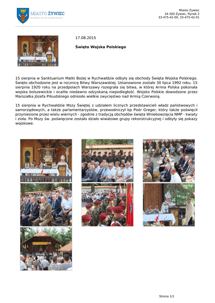 Miasto Żywiec 34-300 Żywiec, Rynek 2 33-475-42-00, 33-475-42-01 17.08.2015 Święto Wojska Polskiego 15 sierpnia w Sanktuarium Matki Bożej w Rychwałdzie odbyły się obchody Święta Wojska Polskiego. Święto obchodzone jest w rocznicę Bitwy Warszawskiej. Ustanowione zostało 30 lipca 1992 roku. 15 sierpnia 1920 roku na przedpolach Warszawy rozegrała się bitwa, w której Armia Polska pokonała wojska bolszewickie i ocaliła niedawno odzyskaną niepodległość. Wojsko Polskie dowodzone przez Marszałka Józefa Piłsudskiego odniosło wielkie zwycięstwo nad Armią Czerwoną. 15 sierpnia w Rychwałdzie Mszy Świętej z udziałem licznych przedstawicieli władz państwowych i samorządowych, a także parlamentarzystów, przewodniczył bp Piotr Greger, który także poświęcił przyniesione przez wielu wiernych - zgodnie z tradycją obchodów święta Wniebowzięcia NMP - kwiaty i zioła. Po Mszy św. poświęcone zostało działo wiwatowe grupy rekonstrukcyjnej i odbyły się pokazy wojskowe. Strona 1/1 Powered by TCPDF (www.tcpdf.org)