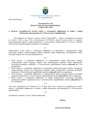 DO-0130/58/2012 Zarządzenie nr 58 Rektora Uniwersytetu Jagiellońskiego z 5 lipca 2012 roku w sprawie: szczegółowych wzorów umów o warunkach odpłatności za studia i usługi edukacyjne obowiązujących w Uniwersytecie Jagiellońskim Na podstawie art. 160 ust. 3 ustawy z dnia 27 lipca 2005 r. – Prawo o szkolnictwie wyższym (j. t. Dz.U. z 2012 r., poz. 572), § 10 uchwały nr 75/VI/2012 z dnia 27 czerwca 2012 r. w sprawie zasad pobierania opłat za usługi edukacyjne w Uniwersytecie Jagiellońskim, § 130 ust. 2 Statutu Uniwersytetu Jagiellońskiego zarządzam, co następuje: §1 Wprowadzam wzory umów o warunkach odpłatności za stacjonarne i niestacjonarne studia pierwszego stopnia, studia drugiego stopnia, jednolite studia magisterskie, niestacjonarne studia trzeciego stopnia oraz za studia podyplomowe. §2 1. Wzór umowy o warunkach odpłatności za niestacjonarne studia pierwszego stopnia, niestacjonarne studia drugiego stopnia oraz niestacjonarne jednolite studia magisterskie zawieranej pomiędzy studentem, a Uniwersytetem Jagiellońskim określa załącznik nr 1 do zarządzenia. 2. Wzór umowy o warunkach odpłatności za stacjonarne studia pierwszego stopnia, stacjonarne studia drugiego stopnia oraz stacjonarne jednolite studia magisterskie zawieranej pomiędzy studentem, a Uniwersytetem Jagiellońskim określa załącznik nr 2 do zarządzenia. 3. Wzór umowy o warunkach odpłatności za niestacjonarne studia trzeciego stopnia zawieranej pomiędzy doktorantem, a Uniwersytetem Jagiellońskim określa załącznik nr 3 do zarządzenia. 4. Wzór umowy o warunkach odpłatności za studia podyplomowe zawieranej pomiędzy słuchaczem studiów podyplomowych, a Uniwersytetem Jagiellońskim określa załącznik nr 4 do zarządzenia. §3 Traci moc zarządzenie nr 57 Rektora UJ z 18 lipca 2011 roku w sprawie szczegółowych wzorów umów o warunkach odpłatności za studia i usługi edukacyjne obowiązujących w Uniwersytecie Jagiellońskim. §4 Zarządzenie wchodzi w życie z dniem podpisania. Rektor Prof. Karol Musioł Załącznik nr 1 do zarządzenia nr 58 Rektora UJ z 5 lipca 2012 r. UNIWERSYTET JAGIELLOŃSKI Umowa nr ..... o warunkach odpłatności za niestacjonarne studia wyższe w Uniwersytecie Jagiellońskim (wzór) Umowa zawarta w Krakowie, w dniu ................................................................................................... pomiędzy Panią/Panem ......................................................................................................................... na stale zamieszkałą/-ym ....................................................................................................................... (stały adres zameldowania) podająca/y adres do korespondencji ...................................................................................................... legitymującym się dowodem osobistym: seria i numer: ........................................ albo innym dowodem tożsamości ......................................................................................................... ................................................................................................................................................................ PESEL ................................................................................................................................................... Przyjętą/-ym w poczet studentów studiów ......................................................................................., na Wydziale ........................................................................................................................................ w Instytucie .........................................................................................................................................., na kierunek ......................................................., specjalność ..............................................................., od roku akademickiego .......................................................................................................................... zwanym dalej „Studentem”, a Uniwersytetem Jagiellońskim, z siedzibą w Krakowie, ul. Gołębia 24, reprezentowanym przez Dziekana Wydziału .......................................................................................................................... UJ działającego z upoważnienia Rektora Uniwersytetu Jagiellońskiego, zwanym dalej ”Uczelnią”. Indywidualny numer rachunku bankowego, na który należy wnosić opłaty z usługi edukacyjne: ……………………………………………………………………………………. §1 Definicje umowne Użyte w umowie określenia oznaczają: a) Ustawa – ustawa z dnia 27 lipca 2005 r. Prawo o szkolnictwie wyższym (j. t. Dz. U. z 2012 r., poz. 572), b) Regulamin studiów – Regulamin studiów pierwszego stopnia, drugiego stopnia oraz jednolitych studiów magisterskich w Uniwersytecie Jagiellońskim – uchwała nr 41/VI/2010 Senatu UJ z 30 czerwca 2010 r. w sprawie ogłoszenia tekstu jednolitego Regulaminu studiów pierwszego stopnia, drugiego stopnia oraz jednolitych studiów magisterskich w Uniwersytecie Jagiellońskim ze zm., c) Statut UJ – Statut Uniwersytetu Jagiellońskiego przyjęty przez Senat UJ uchwałą nr 16/VI/2006 z dnia 7 czerwca 2006 r. ze zm., d) kierownik podstawowej jednostki organizacyjnej – dziekan wydziału, e) czesne – opłata pobierana przez Uczelnię za świadczone usługi edukacyjne związane z kształceniem studentów na studiach niestacjonarnych na podstawie art. 99 ust. 1 pkt 1 Ustawy. §2 Przedmiot umowy Przedmiotem niniejszej umowy jest określenie warunków odpłatności za niestacjonarne jednolite studia magisterskie/studia pierwszego stopnia/studia drugiego stopnia (niepotrzebne skreślić) na kierunku ………………………........................................................................................