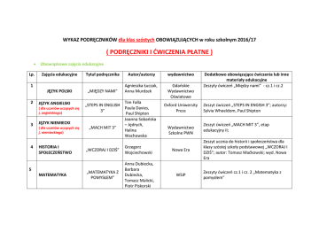 WYKAZ PODRĘCZNIKÓW dla klas szóstych OBOWIĄZUJĄCYCH w roku szkolnym 2016/17 ( PODRĘCZNIKI I ĆWICZENIA PŁATNE ) Lp. Obowiązkowe zajęcia edukacyjne Zajęcia edukacyjne Tytuł podręcznika Autor/autorzy wydawnictwo „MIĘDZY NAMI” Agnieszka Łuczak, Anna Murdzek Gdańskie Wydawnictwo Oświatowe 1 JĘZYK POLSKI 2 JĘZYK ANGIELSKI ( dla uczniów uczących się j. angielskiego) 3 4 „STEPS IN ENGLISH 3” JĘZYK NIEMIECKI ( dla uczniów uczących się j. niemieckiego) HISTORIA I SPOŁECZEŃSTWO 5 MATEMATYKA „MACH MIT 3” Tim Falla Paula Davies, Paul Shipton Joanna Sobańska – Jędrych, Halina Wachowska Oxford Uniwersity Press Wydawnictwo Szkolne PWN „WCZORAJ I DZIŚ” Grzegorz Wojciechowski Nowa Era „MATEMATYKA Z POMYSŁEM” Anna Dubiecka, Barbara Dubiecka, Tomasz Malicki, Piotr Piskorski WSiP Dodatkowo obowiązujące ćwiczenia lub inne materiały edukacyjne Zeszyty ćwiczeń „Między nami” - cz.1 i cz.2 Zeszyt ćwiczeń „STEPS IN ENGISH 3”; autorzy: Sylvia Wheeldom, Paul Shipton Zeszyt ćwiczeń „MACH MIT 3”, etap edukacyjny II; Zeszyt ucznia do historii i społeczeństwa dla klasy szóstej szkoły podstawowej „WCZORAJ I DZIŚ”; autor: Tomasz Maćkowski; wyd. Nowa Era Zeszyty ćwiczeń cz.1 i cz. 2 „Matematyka z pomysłem” 6 7 8 PRZYRODA „TAJEMNICE PRZYRODY” Joanna Stawarz, Feliks Szlajfer, Hanna Kowalczyk MUZYKA „MUZYCZNY ŚWIAT” Teresa Wójcik Mac Edukacja PLASTYKA „LUBIĘ TWORZYĆ” Agnieszka MisiorWaś, Wojciech Sygut Mac Edukacja 9 ZAJĘCIA KOMPUTEROWE 10 ZAJĘCIA TECHNICZNE Lp. „LUBIĘ TO” Michał Kęska Nowa Era Pen-drive dołączony do podręcznika „JAK TO DZIAŁA?” Lech Łabecki Nowa Era - Nieobowiązkowe zajęcia edukacyjne Zajęcia edukacyjne RELIGIA 1 Nowa Era Zeszyty ćwiczeń „tajemnice przyrody” – część I i II; Atlas „Przyroda wokół nas” Zeszyt ćwiczeń „MUZYCZNY ŚWIAT” klasa 6; autor: Teresa Wójcik UWAGA! Nie ma obowiązku kupowania podręcznika, ponieważ w szkole znajdują się podręczniki do plastyki dla każdego ucznia. Tytuł podręcznika Autor/autorzy wydawnictwo „PRZEMIENIENI PRZEZ BOGA” Ks. Zbigniew Marek SJ WAM – Księża Jezuici - Kraków Dodatkowo obowiązujące ćwiczenia lub inne materiały edukacyjne Zeszyt ćwiczeń „PRZEMIENIENI PRZEZ BOGA” Ks. Zbigniew Marek SJ WAM – Księża Jezuici WYKAZ PODRĘCZNIKÓW dla klas piątych OBOWIĄZUJĄCYCH w roku szkolnym 2016/17 PODRĘCZNIKI I ĆWICZENIA BEZPŁATNE ( !!!) – uczniowie otrzymają w szkole Lp. Obowiązkowe zajęcia edukacyjne Zajęcia edukacyjne Tytuł podręcznika 1 JĘZYK POLSKI 2 „MIĘDZY NAMI” „NEW HOT SPOT 2” JĘZYK NIEMIECKI ( dla uczniów uczących się j. niemieckiego) 4 HISTORIA I SPOŁECZEŃSTWO 5 MATEMATYKA 6 wydawnictwo Agnieszka Łuczak, Anna Murdzek Gdańskie Wydawnictwo Oświatowe JĘZYK ANGIELSKI ( dla uczniów uczących się j. angielskiego) 3 Autor/autorzy PRZYRODA „MACH MIT 2” „WCZORAJ I DZIŚ” „MATEMATYKA Z KLUCZEM” ( cz.1 i cz.2) „TAJEMNICE PRZYRODY” Colin Granger Halina Wachowska Mieczysława Materniak -Behrens Grzegorz Wojciechowski Dodatkowo obowiązujące ćwiczenia lub inne materiały edukacyjne Zeszyt ćwiczeń „Między nami” MACMILLAN „NEW HOT SPOT 2” ( economy version) Wydawnictwo Szkolne PWN „MACH MIT 2” ( nowa edycja) Nowa Era - Marcin Braun Agnieszka Mańkowska Małgorzata Paszyńska Nowa Era „Matematyka z kluczem” – zeszyt ćwiczeń do matematyki dla klasy 5 Janina Slósarczyk Ryszard Kozik Feliks Szlajfer Nowa Era - PODRĘCZNIKI I ĆWICZENIA PŁATNE ( !!!)- ( do nieobowiązkowych zajęć edukacyjnych) Nieobowiązkowe zajęcia edukacyjne Lp. 1 Zajęcia edukacyjne RELIGIA Tytuł podręcznika Autor/autorzy wydawnictwo „OBDAROWANI PRZEZ BOGA” ks. Zbigniew Marek Wyd. WAM. Księża Jezuici Dodatkowo obowiązujące ćwiczenia lub inne materiały edukacyjne - WYKAZ PODRĘCZNIKÓW dla klas czwartych OBOWIĄZUJĄCYCH w roku szkolnym 2016/17 PODRĘCZNIKI I ĆWICZENIA BEZPŁATNE ( !!!) – uczniowie otrzymają w szkole Lp. Obowiązkowe zajęcia edukacyjne Zajęcia edukacyjne Tytuł podręcznika 1 JĘZYK POLSKI 2 „MIĘDZY NAMI” wydawnictwo Agnieszka Łuczak, Anna Murdzek Gdańskie Wydawnictwo Oświatowe JĘZYK ANGIELSKI ( dla uczniów uczących się j. angielskiego) „NEW HOT SPOT 1” JĘZYK NIEMIECKI 3 Autor/autorzy ( dla uczniów uczących się j. niemieckiego) 4 HISTORIA I SPOŁECZEŃSTWO 5 MATEMATYKA „MACH MIT 1” „WCZORAJ I DZIŚ” „MATEMATYKA Z KLUCZEM” ( cz.1 i cz.2) Colin Granger Halina Wachowska Mieczysława Materniak Grzegorz Wojciechowski Marcin Braun Agnieszka Mańkowska Małgorzata Paszyńska Dodatkowo obowiązujące ćwiczenia lub inne materiały edukacyjne Zeszyt ćwiczeń „Między nami” MACMILLAN „NEW HOT SPOT 1” ( economy version) Wydawnictwo Szkolne PWN „MACH MIT 1” ( nowa edycja) Nowa Era - Nowa Era „Matematyka z kluczem” – zeszyt ćwiczeń do matematyki dla klasy 4 Nowa Era - Nowa Era - Nowa Era - M.Marko-Worłowska 6 7 8 PRZYRODA „TAJEMNICE PRZYRODY” MUZYKA „LEKCJA MUZYKI” PLASTYKA „DO DZIEŁA” Feliks Szlajfer Monika Gromek Grażyna Kilbach Jadwiga Lukas Krystyna Onak 9 10 ZAJ.KOMPUTEROWE „LUBIĘ TO” ZAJ.TECHNICZNE „JAK TO DZIAŁA?” Lech Łabecki Marta Łabecka Michał Kęska PODRĘCZNIKI I ĆWICZENIA PŁATNE ( !!!)- Nowa Era - Nowa Era - ( do nieobowiązkowych zajęć edukacyjnych) Nieobowiązkowe zajęcia edukacyjne Lp. 1 Zajęcia edukacyjne RELIGIA Tytuł podręcznika Autor/autorzy wydawnictwo „ZAPROSZENI PRZEZ BOGA” ks. Zbigniew Marek SJ Wyd. WAM. Księża Jezuici Dodatkowo obowiązujące ćwiczenia lub inne materiały edukacyjne -
