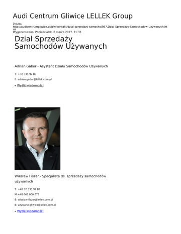 Audi Centrum Gliwice LELLEK Group Źródło: http://audicentrumgliwice.pl/glw/kontakt/dzial-sprzedazy-samocho/987,Dzial-Sprzedazy-Samochodow-Uzywanych.ht ml Wygenerowano: Poniedziałek, 6 marca 2017, 21:33 Dział Sprzedaży Samochodów Używanych Adrian Gabor - Asystent Działu Samochodów Używanych T: +32 335 92 83 E: [email protected] ● Wyślij wiadomość! Wiesław Fiszer - Specjalista ds. sprzedaży samochodów używanych T: +48 32 335 92 82 M:+48 663 000 673 E: [email protected] E: [email protected] ● Wyślij wiadomość! Mariusz Budziński - Kierownik Sprzedaży Samochodów Używanych T: +48 32 335 92 81 M:+48 663 000 670 E: [email protected] E: [email protected] ● Wyślij wiadomość!