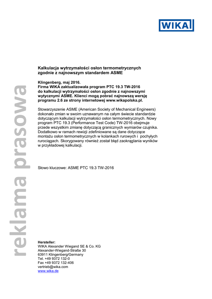 reklama prasowa Kalkulacja wytrzymałości osłon termometrycznych zgodnie z najnowszym standardem ASME Klingenberg, maj 2016. Firma WIKA zaktualizowała program PTC 19.3 TW-2016 do kalkulacji wytrzymałości osłon zgodnie z najnowszymi wytycznymi ASME. Klienci mogą pobrać najnowszą wersję programu 2.6 ze strony internetowej www.wikapolska.pl. Stowarzyszenie ASME (American Society of Mechanical Engineers) dokonało zmian w swoim uznawanym na całym świecie standardzie dotyczącym kalkulacji wytrzymałości osłon termometrycznych. Nowy program PTC 19.3 (Performance Test Code) TW-2016 obejmuje przede wszystkim zmianę dotyczącą granicznych wymiarów czujnika. Dodatkowo w ramach rewizji zdefiniowane są dane dotyczące montażu osłon termometrycznych w kolankach rurowych i pochyłych rurociągach. Skorygowany również został błąd zaokrąglania wyników w przykładowej kalkulacji. Słowo kluczowe: ASME PTC 19.3 TW-2016 Hersteller: WIKA Alexander Wiegand SE & Co. KG Alexander-Wiegand-Straße 30 63911 Klingenberg/Germany Tel. +49 9372 132-0 Fax +49 9372 132-406 [email protected] www.wika.de reklama prasowa Zdjęcie WIKA: Zdjęcie prezentujące kalkulację wytrzymałości w punkcie pomiarowym Edycja przez: WIKA Polska spółka z ograniczoną odpowiedzialnością sp. k. ul. Łęgska 26/35 87-800 Włocławek tel. (+48) 54 23 01 100 fax: (+48) 54 23 01 101 [email protected] www.wikapolska.pl Reklama prasowa WIKA 10/2016