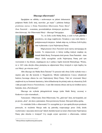 Dlaczego ofiarowanie? Spoglądam na odbitkę z zachowanym na jakimś dokumencie podpisem Matki Zofii: imię, nazwisko „po mężu” i pełniona funkcja: przełożona starsza w Domu Panieńskiem Ofiarowania Panny Maryi1. Dom Panieński – rozumiem, powiedziałabym dzisiejszym językiem dom dziewcząt. Ale Ofiarowania Maryi – dlaczego? Intrygujące. To, że Zofia czciła Matkę Bożą, a cześć ta była głęboka i prawdziwa, nie ulega wątpliwości. Świadczy o tym wiele faktów i podejmowanych inicjatyw. Jednak zdaje się, że bliższe Zofii byłyby inne wydarzenia z życia Najświętszej Panny. Mógł przecież Dom Panieński nosić nazwę nawiązującą do Loretto. To miejscowość, w której według tradycji znajduje się domek Matki Bożej. Powiązanie dość proste: Dom Panieński – dom Maryi. Zofia szczególnie czciła Najświętszą Pannę pod tym wezwaniem w Jej obrazie, znajdującym się w jednej z kaplic kościoła Mariackiego. Wiemy, że w 1621 roku złożyła ofiarę pieniężną na odprawianie Mszy świętych w tejże kaplicy ku czci Maryi „po wieczne czasy”. Albo dlaczego nie Matka Boża Śnieżna? To przecież taki obraz Zofia wybrała wraz z mężem jako dar dla kościoła w Niegardowie. Młodzi małżonkowie Czescy ufundowali budowę bocznego ołtarza ku czci Najświętszej Maryi Panny. Taki też wizerunek Maryi znajdował się na frontonie kamienicy, która kilkadziesiąt lat później stała się własnością Zofii i dała początek Domowi Panieńskiemu. A sam fakt istnienia obrazu stał się też źródłem nazwy budynku: dom „Pod obrazem”. Dlaczego nie wybrała jakiegokolwiek innego tytułu Matki Bożej, czczonej w Krakowie w tylu wizerunkach… Tymczasem - Ofiarowanie. Dom Ofiarowania. Nie „jakiś tam” dom, nie bezpański, ani po prostu „dom”, ale dom z patronatem. Dom powierzony Komuś. Dom pod dobrą opieką. Co wiedziała Zofia o ofiarowaniu? Co szczególnie ją w tym apokryficznym przekazie poruszyło, że trzyletnia Maryja stała się patronką rozpoczętego przez Zofię dzieła wychowania i nauczania dziewcząt? Jakich słuchała kazań na temat ofiarowania Najświętszej Panny jako dziecka w świątyni? Czy mogła czytać opowieści o ofiarowaniu, widzieć 1 Wersja bliższa współczesnej polszczyźnie. 1 wyobrażenia tej sceny? W kościołach krakowskich starego miasta próżno dziś szukać ofiarowania Maryi. Wiele ze świątyń, w których mogła modlić się Zofia dziś już nie istnieje. Może w którejś z nich był jakiś szczególny obraz małej Maryi, wchodzącej do świątyni w Jerozolimie. Możemy mieć pewność, że Zofia widziała ofiarowanie, umieszczone przez Wita Stwosza w głównym ołtarzu kościoła Mariackiego. Spoglądała pewnie również i na to, które znajduje się w stallach tegoż kościoła. Gdzie jeszcze? Dziś trudno dociec. Dlaczego Maryja – dziecko stała się patronką domu dla dziewcząt osieroconych i ubogich? Może trzeba przyjrzeć się duchowemu znaczeniu ofiarowania. To, jakie i my dziś znamy, też może nas przywieść do odkrycia zamiarów Zofii. Jako pierwsze nasuwa się rozwiązanie najzwyklejsze: Zofia zajęła się dziewczynkami – bo takie przecież przychodziły i mieszkały w jej domu – najmłodsze siedmioletnie, najstarsze czternastolatki. I oto odpowiedź - Maryja ma być wzorem. Dla dzieci – dziecko. Najbliższe. Najprostsze. To również ideał wskazany przez Jezusa – postawa konieczna do zdobycia Królestwa Niebieskiego; nie nieba – ale królestwa, które pośród nas jest i trwa. Bądź ufny, szczery, otwarty jak dziecko. A Bóg zadba o Ciebie. Apokryf Protoewangelia Jakuba podaje, że ofiarowanie Maryi do świątyni w Jerozolimie było wypełnieniem ślubu złożonego przez długo oczekujących na potomstwo rodziców. Maryja jest więc posłuszna Joachimowi i Annie, co prowadziło Ją również do posłuszeństwa Bogu. W świątyni spędziła kilka lat życia. Maryja - mała dziewczynka. Ta, która się bawi z rówieśniczkami, która pracuje, wykonuje swoje obowiązki, pomaga innym, uczy się życia, trwa na modlitwie i przez to wszystko – dorasta, odkrywa i kształtuje siebie, rozwija się jako kobieta, ale też jako osoba oddana Bogu. Może tak właśnie myślała Zofia. Przecież zależało jej, jak notuje w Przedmowie do Konstytucji na dobrym wychowaniu dziewcząt, na tym, aby ćwiczone były nie tylko w bojaźni Bożej, w uczciwych i chrześcijańskich obyczajach, ale i w robotach powierzchownych stanowi panieńskiemu przynależących. Czas przebywania pod opieką Maryi miał być czasem, gdy dziewczęta w dobrych obyczajach podrósłszy i według stanu swego pobożnie i przystojnie żyć się nauczywszy, stan sobie po tym każda obrała, abo zakonny, abo małżeński, abo też jaki inszy świecki. Na odkrycie swego powołania trzeba mieć czas. I przewodnika. Za takiego Zofia wybrała dla dziewcząt niekwestionowany autorytet. Maryja – dziewczę, które na różnych obrazach rzadko ma podawane przez apokryf trzy lata, i wydaje się być świadome siebie samej. Nie wie co ją czeka, ale żyje z Bogiem. Nie wie, że będzie kiedyś Matką Jezusa – Syna Bożego, ale chce żyć z Bogiem, według Jego woli, która… była niepojęta! 2 Według tradycji, do świątyni prowadziło 15 schodów. Wejście na górę to nie lada wyzwanie, jak na małe dziecko. Może i to Zofia brała pod uwagę – kształtowanie siebie to trud. Praca nad sobą, to praca najtrudniejsza ze wszystkich. Ale przynosząca najwspanialsze efekty. Wybierając Maryję za opiekunkę Domu Panieńskiego, Zofia uczyniła ją również patronką życia sióstr, zajmujących się dziewczętami. Myślała o zgromadzeniu panien abo sióstr, które oddadzą się dziełu całym sercem i duszą; z wielką pilnością, miłością i szczerością, ale i z wytrwaniem aż do śmierci. wychowawczynie też mają wpatrywać się w Maryję – dziecko. To ją mają pytać, jak wychowywać, jak doprowadzić do