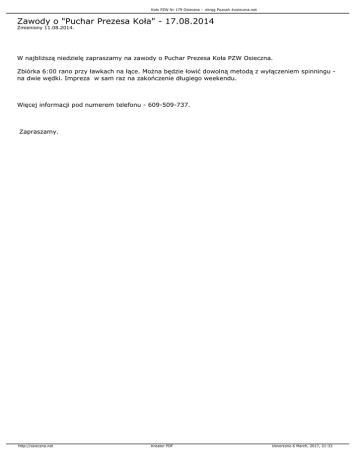Koło PZW Nr 179 Osieczna - okręg Poznań #osieczna.net Zawody o "Puchar Prezesa Koła" - 17.08.2014 Zmieniony 11.08.2014. W najbliższą niedzielę zapraszamy na zawody o Puchar Prezesa Koła PZW Osieczna. Zbiórka 6:00 rano przy ławkach na łące. Można będzie łowić dowolną metodą z wyłączeniem spinningu na dwie wędki. Impreza w sam raz na zakończenie długiego weekendu. Więcej informacji pod numerem telefonu - 609-509-737. Zapraszamy. http://osieczna.net Kreator PDF Utworzono 6 March, 2017, 21:33