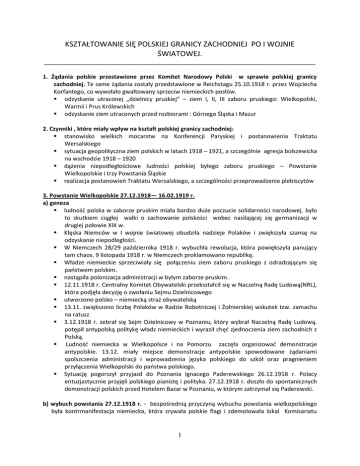 KSZTAŁTOWANIE SIĘ POLSKIEJ GRANICY ZACHODNIEJ PO I WOJNIE ŚWIATOWEJ. __________________________________________________________________________________ 1. Żądania polskie przestawione przez Komitet Narodowy Polski w sprawie polskiej granicy zachodniej. Te same żądania zostały przedstawione w Reichstagu 25.10.1918 r. przez Wojciecha Korfantego, co wywołało gwałtowany sprzeciw niemieckich posłów. odzyskanie utraconej „dzielnicy pruskiej” – ziem I, II, III zaboru pruskiego: Wielkopolski, Warmii i Prus Królewskich odzyskanie ziem utraconych przed rozbiorami : Górnego Śląska i Mazur 2. Czynniki , które miały wpływ na kształt polskiej granicy zachodniej: stanowisko wielkich mocarstw na Konferencji Paryskiej i postanowienia Traktatu Wersalskiego sytuacja geopolityczna ziem polskich w latach 1918 – 1921, a szczególnie agresja bolszewicka na wschodzie 1918 – 1920 dążenia niepodległościowe ludności polskiej byłego zaboru pruskiego – Powstanie Wielkopolskie i trzy Powstania Śląskie realizacja postanowieo Traktatu Wersalskiego, a szczególności przeprowadzenie plebiscytów 3. Powstanie Wielkopolskie 27.12.1918— 16.02.1919 r. a) geneza ludnośd polska w zaborze pruskim miała bardzo duże poczucie solidarności narodowej. było to skutkiem ciągłej walki o zachowanie polskości wobec nasilającej się germanizacji w drugiej połowie XIX w. Klęska Niemców w I wojnie światowej obudziła nadzieje Polaków i zwiększyła szansę na odzyskanie niepodległości. W Niemczech 28/29 października 1918 r. wybuchła rewolucja, która powiększyła panujący tam chaos. 9 listopada 1918 r. w Niemczech proklamowano republikę. Władze niemieckie sprzeciwiały się połączeniu ziem zaboru pruskiego z odradzającym się paostwem polskim. nastąpiła polonizacja administracji w byłym zaborze pruskim. 12.11.1918 r. Centralny Komitet Obywatelski przekształcił się w Naczelną Radę Ludową(NRL), która podjęła decyzję o zwołaniu Sejmu Dzielnicowego utworzono polsko – niemiecką straż obywatelską 13.11. zwiększono liczbę Polaków w Radzie Robotniczej i Żołnierskiej wskutek tzw. zamachu na ratusz 3.12.1918 r. zebrał się Sejm Dzielnicowy w Poznaniu, który wybrał Naczelną Radę Ludową. potępił antypolską politykę władz niemieckich i wyraził chęd zjednoczenia ziem zachodnich z Polską. Ludnośd niemiecka w Wielkopolsce i na Pomorzu zaczęła organizowad demonstracje antypolskie. 13.12. miały miejsce demonstracje antypolskie spowodowane żądaniami spolszczenia administracji i wprowadzenia języka polskiego do szkół oraz pragnieniem przyłączenia Wielkopolski do paostwa polskiego. Sytuację pogorszył przyjazd do Poznania Ignacego Paderewskiego 26.12.1918 r. Polacy entuzjastycznie przyjęli polskiego pianistę i polityka. 27.12.1918 r. doszło do spontanicznych demonstracji polskich przed Hotelem Bazar w Poznaniu, w którym zatrzymał się Paderewski. b) wybuch powstania 27.12.1918 r. - bezpośrednią przyczyną wybuchu powstania wielkopolskiego była kontrmanifestacja niemiecka, która zrywała polskie flagi i zdemolowała lokal Komisariatu 1 Naczelnej Rady Ludowej. Doszło do spontanicznego wybuchu powstania. Początkowo nikt nie miał kontroli nad wydarzeniami. c) przebieg powstania: powstanie możemy podzielid na trzy etapy: pierwszy okres walk 27.12.1918 r. – 7.01.1919 r. 28.11.1918 r. NRL powołała kapitana Stanisława Taczaka na dowódcę Komendy Głównej Wojsk Powstaoczych ( nieoficjalnie). Do 6 stycznia udało się Polakom opanowad Poznao i lotnisko na Ławicy. Powstanie rozszerzyło się m.in. na Gniezno, Jarocin, Kórnik, Śrem, Środę Wielkopolską, Wrześnię, Wągrowiec, oborniki, Szamotuły, Nowy Tomyśl, Grodzisk, Kościan, Gostyo, Krotoszyn, Pleszew. Okres ten charakteryzował się łatwością rozbrajania oddziałów niemieckich na skutek zaskoczenia, osłabienia i zmęczenia żołnierzy. Innym powodem były trudności wewnątrz Niemiec – wybuch powstania Spartakusa w Berlinie. W tym okresie najcięższe walki toczyły się o lotnisko na Ławicy, o Inowrocław i pod Zdziechową. drugi okres walk 8.01. – 15.01.1919 r. NRL objęła władzę na zdobytych terenach. Okres ten ma charakter ofensywny – toczyły się ciężkie walki o Chodzież, Zbąszyo, Szubin, Żnin. Ostatecznie powstaocom udało się wyzwolid znaczną częśd Wielkopolski. Na północy front rozciągał się od Inowrocławia do Czarnkowa, a na południu tereny wyzwolone sięgnęły Wieruszowa. Na zachodzie front oparł się o Czarnków, Wolsztyn i Kopanicę. trzeci okres walk 16.01. – 16.02.1919 r. w połowie stycznia 1919 r. dowódcą powstania został gen. Józef Dowbór-Muśnicki, który zreorganizował siły powstaocze tworząc regularną armię (75 tys.). Niemcy podjęli kontrofensywę, a powstaocy przeszli do obrony zdobytych obszarów. Najcięższe walki toczyły się o tereny nadnoteckie oraz o Zbąszyo i Rawicz. d) rozejm w Trewirze 16.02.1919 r. kooczy Powstanie Wielkopolskie. Na skutek działalności dyplomatycznej KNP w Paryżu powstaocy wielkopolscy zostali uznani za żołnierzy ENTENTY. Dzięki temu objęły ich postanowienia rozejmu w Trewirze, który był przedłużeniem rozejmu kooczącego I wojnę światową. Ustalono linię demarkacyjną, która rozgraniczała ziemie zajęte przez powstaoców od terenów kontrolowanych przez Niemców. O przynależności paostwowej Wielkopolski miała zadecydowad Konferencja Paryska e) znaczenie powstania: Było to pierwsze polskie powstanie narodowe, które zakooczyło się sukcesem; zwycięstwo powstaoców miało wpływ na postanowienia konferencji pokojowej w Paryżu w kwestii granic polskich; podjęcie samodzielnej walki o przyłączenie Wielkopolski do paostwa polskiego odciążyło Józefa Piłsudskiego, który mógł poświęcid się walkom o granicę wschodnią. Ostatecznie duża częśd Wielkopolski bez Wschowy. Babimostu, Międzyrzecza i Skwierzyny została przyznana Polsce na mocy traktatu