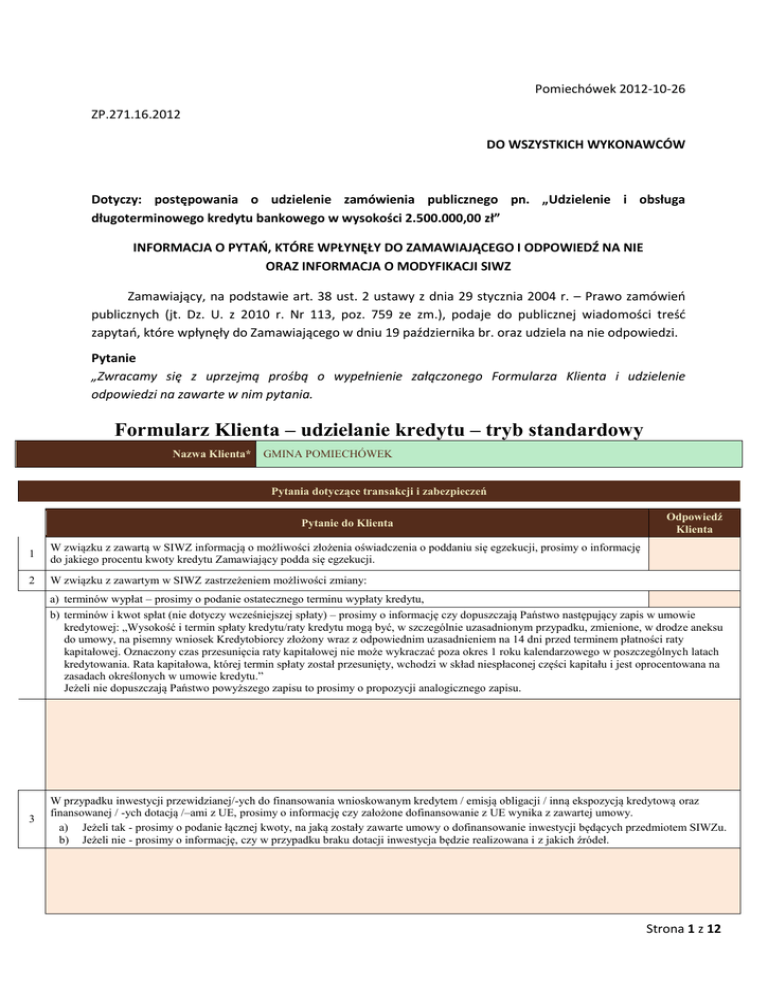 Pomiechówek 2012-10-26 ZP.271.16.2012 DO WSZYSTKICH WYKONAWCÓW Dotyczy: postępowania o udzielenie zamówienia publicznego pn. „Udzielenie i obsługa długoterminowego kredytu bankowego w wysokości 2.500.000,00 zł” INFORMACJA O PYTAŃ, KTÓRE WPŁYNĘŁY DO ZAMAWIAJĄCEGO I ODPOWIEDŹ NA NIE ORAZ INFORMACJA O MODYFIKACJI SIWZ Zamawiający, na podstawie art. 38 ust. 2 ustawy z dnia 29 stycznia 2004 r. – Prawo zamówień publicznych (jt. Dz. U. z 2010 r. Nr 113, poz. 759 ze zm.), podaje do publicznej wiadomości treść zapytań, które wpłynęły do Zamawiającego w dniu 19 października br. oraz udziela na nie odpowiedzi. Pytanie „Zwracamy się z uprzejmą prośbą o wypełnienie załączonego Formularza Klienta i udzielenie odpowiedzi na zawarte w nim pytania. Formularz Klienta – udzielanie kredytu – tryb standardowy Nazwa Klienta* GMINA POMIECHÓWEK Pytania dotyczące transakcji i zabezpieczeń Pytanie do Klienta 1 W związku z zawartą w SIWZ informacją o możliwości złożenia oświadczenia o poddaniu się egzekucji, prosimy o informację do jakiego procentu kwoty kredytu Zamawiający podda się egzekucji. 2 W związku z zawartym w SIWZ zastrzeżeniem możliwości zmiany: Odpowiedź Klienta a) terminów wypłat – prosimy o podanie ostatecznego terminu wypłaty kredytu, b) terminów i kwot spłat (nie dotyczy wcześniejszej spłaty) – prosimy o informację czy dopuszczają Państwo następujący zapis w umowie kredytowej: „Wysokość i termin spłaty kredytu/raty kredytu mogą być, w szczególnie uzasadnionym przypadku, zmienione, w drodze aneksu do umowy, na pisemny wniosek Kredytobiorcy złożony wraz z odpowiednim uzasadnieniem na 14 dni przed terminem płatności raty kapitałowej. Oznaczony czas przesunięcia raty kapitałowej nie może wykraczać poza okres 1 roku kalendarzowego w poszczególnych latach kredytowania. Rata kapitałowa, której termin spłaty został przesunięty, wchodzi w skład niespłaconej części kapitału i jest oprocentowana na zasadach określonych w umowie kredytu.” Jeżeli nie dopuszczają Państwo powyższego zapisu to prosimy o propozycji analogicznego zapisu. 3 W przypadku inwestycji przewidzianej/-ych do finansowania wnioskowanym kredytem / emisją obligacji / inną ekspozycją kredytową oraz finansowanej / -ych dotacją /–ami z UE, prosimy o informację czy założone dofinansowanie z UE wynika z zawartej umowy. a) Jeżeli tak - prosimy o podanie łącznej kwoty, na jaką zostały zawarte umowy o dofinansowanie inwestycji będących przedmiotem SIWZu. b) Jeżeli nie - prosimy o informację, czy w przypadku braku dotacji inwestycja będzie realizowana i z jakich źródeł. Strona 1 z 12 Pytania dotyczące sytuacji ekonomiczno-finansowej Klienta (prosimy o informacje zgodnie ze stanem na dzień sporządzania odpowiedzi) Odpowiedź Klienta Pytanie do Klienta 1 Prosimy o informację czy na Państwa rachunkach w bankach ciążą zajęcia egzekucyjne. Jeżeli tak to prosimy o podanie kwoty zajęć egzekucyjnych (w tys. PLN): 2 Prosimy o informację czy posiadają Państwo zaległe zobowiązania w bankach. Jeżeli tak to prosimy o podanie kwoty zaległych zobowiązań w bankach (w tys. PLN): 3 Prosimy o informację czy w ciągu ostatnich 18 miesięcy w JST prowadzony był program naprawczy w rozumieniu ustawy z dnia 27 sierpnia 2009 r. o finansach publicznych. 4 Prosimy o informację czy w ciągu ostatnich 36 miesięcy były prowadzone wobec Państwa za pośrednictwem komornika sądowego działania windykacyjne zadłużenia w bankach. 5 Prosimy o informację czy w ciągu ostatnich dwóch lat została podjęta uchwała o nieudzieleniu absolutorium organowi wykonawczemu reprezentującemu Państwa jednostkę (wójt / burmistrz / prezydent, zarząd powiatu, zarząd województwa). 6 Prosimy o informację dotyczącą następujących pozycji długu JST wg stanu planowanego na koniec bieżącego roku budżetowego: wartość zobowiązania ogółem, wg tytułów dłużnych (w tys. PLN): wartość nominalna wymagalnych zobowiązań z tyt. poręczeń i gwarancji (w tys. PLN): wartość nominalna niewymagalnych zobowiązań z tyt. poręczeń i gwarancji (w tys. PLN): wartość kredytów i pożyczek związanych z realizacją programów i projektów finansowanych z udziałem środków, o których mowa w art. 5 ist.1 pkt.2 UoFP z budżetu państwa (w tys. PLN): wartość kredytów i pożyczek związanych z realizacją programów i projektów finansowanych z udziałem środków, o których mowa w art. 5 ist.1 pkt.2 UoFP z innych źródeł (w tys. PLN): Pytania dotyczące dofinansowania z UE oraz przedsięwzięć inwestycyjnych w ramach budżetu roku bieżącego oraz lat poprzednich (prosimy o informacje zgodnie ze stanem na dzień sporządzania odpowiedzi) Pytanie do Klienta 1 Odpowiedź Klienta Prosimy o przedstawienie informacji o dofinansowaniach ze środków UE zadań realizowanych przez Państwa (wydatki majątkowe) w ramach budżetu roku bieżącego z podziałem na: wartość zawartych umów (w tys. PLN): w tym, wartość środków przewidzianych zgodnie z tymi umowami do wypłaty w bieżącym roku budżetowym (w tys. PLN): wartość złożonych wniosków, dla których nie uzyskano jeszcze decyzji (w tys. PLN): w tym, wartość środków przewidzianych zgodnie z tymi wnioskami do wypłaty w bieżącym roku budżetowym (w tys. PLN): 2 Prosimy o informację, czy w ciągu ostatnich 2 lat budżetowych zdarzyło się, że JST musiała zwrócić środki uzyskane z UE z powodu nie wywiązania się z zapisów umowy dofinansowania. Jeżeli tak to prosimy o podanie kwoty środków zwróconych w ciągu pełnych ostatnich dwóch lat budżetowych (w tys. PLN): Pytania dotyczące podmiotów powiązanych z Klientem Pytanie do Klienta 1 Prosimy o podanie informacji o podmiotach powiązanych (nazwa, adres, regon): 2 Prosimy o informację, czy w przeszłości wystąpiły lub planowane są przejęcia z mocy prawa przez JST zadłużenia: - po podmiocie, 