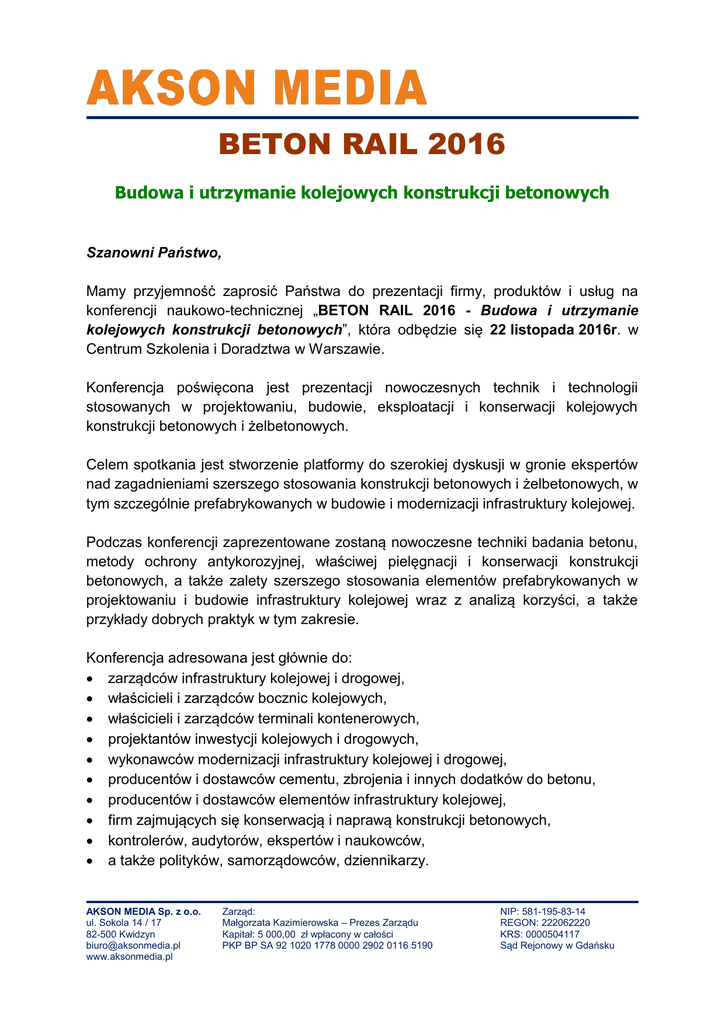 BETON RAIL 2016 Budowa i utrzymanie kolejowych konstrukcji betonowych Szanowni Państwo, Mamy przyjemność zaprosić Państwa do prezentacji firmy, produktów i usług na konferencji naukowo-technicznej „BETON RAIL 2016 - Budowa i utrzymanie kolejowych konstrukcji betonowych”, która odbędzie się 22 listopada 2016r. w Centrum Szkolenia i Doradztwa w Warszawie. Konferencja poświęcona jest prezentacji nowoczesnych technik i technologii stosowanych w projektowaniu, budowie, eksploatacji i konserwacji kolejowych konstrukcji betonowych i żelbetonowych. Celem spotkania jest stworzenie platformy do szerokiej dyskusji w gronie ekspertów nad zagadnieniami szerszego stosowania konstrukcji betonowych i żelbetonowych, w tym szczególnie prefabrykowanych w budowie i modernizacji infrastruktury kolejowej. Podczas konferencji zaprezentowane zostaną nowoczesne techniki badania betonu, metody ochrony antykorozyjnej, właściwej pielęgnacji i konserwacji konstrukcji betonowych, a także zalety szerszego stosowania elementów prefabrykowanych w projektowaniu i budowie infrastruktury kolejowej wraz z analizą korzyści, a także przykłady dobrych praktyk w tym zakresie. Konferencja adresowana jest głównie do: zarządców infrastruktury kolejowej i drogowej, właścicieli i zarządców bocznic kolejowych, właścicieli i zarządców terminali kontenerowych, projektantów inwestycji kolejowych i drogowych, wykonawców modernizacji infrastruktury kolejowej i drogowej, producentów i dostawców cementu, zbrojenia i innych dodatków do betonu, producentów i dostawców elementów infrastruktury kolejowej, firm zajmujących się konserwacją i naprawą konstrukcji betonowych, kontrolerów, audytorów, ekspertów i naukowców, a także polityków, samorządowców, dziennikarzy. AKSON MEDIA Sp. z o.o. ul. Sokola 14 / 17 82-500 Kwidzyn [email protected] www.aksonmedia.pl Zarząd: Małgorzata Kazimierowska – Prezes Zarządu Kapitał: 5 000,00 zł wpłacony w całości PKP BP SA 92 1020 1778 0000 2902 0116 5190 NIP: 581-195-83-14 REGON: 222062220 KRS: 0000504117 Sąd Rejonowy w Gdańsku Konferencja „BETON RAIL 2016 - Budowa i utrzymanie kolejowych konstrukcji betonowych”, to doskonała okazja do zaprezentowania Państwa firmy, produktów i usług wśród potencjalnych klientów. Czytelna formuła, szerokie grono firm i podmiotów będących potencjalnymi klientami, którzy są bezpłatnie zapraszanymi przez organizatorów do udziału w niniejszym spotkaniu, gwarantuje skuteczność prowadzonych działań marketingowych. Możliwość udziału przedstawiciela Państwa firmy jako sponsora w panelu dyskusyjnym, umożliwia dodatkowo promocję sylwetki przedstawicieli Zarządu firmy lub innego przedstawiciela firmy jako kompetentnego menadżera, zwiększając dodatkowo rozpoznawalność firmy i jej produktów na konkurencyjnym rynku. Udział i prezentacja firmy w organizowanych przez nas konferencjach to niepowtarzalna możliwość spotkania się wyłącznie z uznanymi profesjonalistami w danej dziedzinie, gwarantująca niepowtarzalną okazję do poznania najnowszych trendów w branży, zdobycie nowej wiedzy, wymianę doświadczeń oraz nawiązanie interesujących kontaktów biznesowo-handlowych. Szczegółowych informacji na temat udziału i możliwości promocji podczas konferencji udziela Piotr Kazimierowski tel. (55) 618 20 80, tel. kom. 785 080 000, e-mail: [email protected] Z wyrazami szacunku Małgorzata Kazimierowska Prezes Zarządu AKSON MEDIA Sp. z o.o. ul. Sokola 14 / 17 82-500 Kwidzyn [email protected] www.aksonmedia.pl Zarząd: Małgorzata Kazimierowska – Prezes Zarządu Kapitał: 5 000,00 zł wpłacony w całości PKP BP SA 92 1020 1778 0000 2902 0116 5190 NIP: 581-195-83-14 REGON: 222062220 KRS: 0000504117 Sąd Rejonowy w Gdańsku