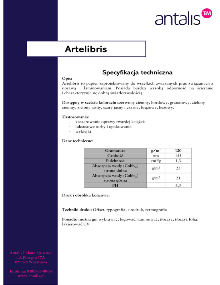 Artelibris Specyfikacja techniczna Opis: Artelibris to papier zaprojektowany do wszelkich związanych prac związanych z oprawą i laminowaniem. Posiada bardzo wysoką odporność na ścieranie i charakteryzuje się dobrą światłotrwałością. Dostępny w sześciu kolorach: czerwony ciemny, bordowy, granatowy, zielony ciemny, zielony jasny, szary jasny i czarny, brązowy, beŜowy. Zastosowania: - kaszerowanie oprawy twardej ksiąŜek - luksusowe torby i opakowania - wyklejki Dane techniczne: Gramatura Grubość Pulchność Absorpcja wody (Cobb60) strona dolna Absorpcja wody (Cobb60) strona górna PH g/m2 µm cm3/g 120 155 1,3 g/m2 23 g/m2 21 6,5 Druk i obróbka końcowa: Techniki druku: Offset, typografia, sitodruk, termografia Ponadto moŜna go: wykrawać, bigować, laminować, tłoczyć, tłoczyć folią, lakierować UV Antalis Poland Sp. z o.o. ul. Postępu 17A 02- 676 Warszawa Infolinia: 0 801-35-80-36 www.antalis.pl