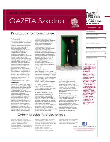NUMER 1 2012/2013 MAGAZYN P U B L I C Z NE J KATOLICKIEJ SZKOŁY P O D S T AW O W E J W ZĄBKACH V O LU M E 1, I S S U E 1 GAZETA Szkolna W N UM E R Z E : Ksiądz Jan od biedronek Poeta przyrody O księdzu Twardowskim mówi się: „Jan od biedronek”, bo w jego poezji aż roi się od rozmaitych stworzeń. Jego rozmiłowanie w botanice rozpoczęło się od rozmów z profesorami z waszawskiego gimnazjum im. T. Czackiego. Ale ksiądz Jan Twardowski nie był tylko pogodnym staruszkiem o dobrotliwym uśmiechu, piszącym wiersze o przyrodzie. Jego wiersze są niezwykle filozoficzne, dotykają głębi, choć sam ksiądz Twardowski jakby temu nie dowierzał, mówiąc: „Zdarzało się, że recenzenci omawiając moje wiersze pisali o dialektyce, antynomiach, Pascalu, Heraklicie, Heglu. Przeraziłem się. Otworzyłem tom moich wierszy i przeczytałem : „Polna myszka siedzi sobie, konfesjonał ząbkiem skrobie”, „kto bibułę buchnie, temu łapa spuchnie”, „siostra Konsolata, bo kąsa i lata” – i uspokoiłem się”. („Rzeczpospolita” 20 IV 2000). Pierwsze lata Urodził się 1 czerwca 1915 roku w Warszawie. W latach 1933-1935 współredagował międzyszkolne pismo młodzieży gimnazjalnej „Kuźnia Młodych”, gdzie zajmował się działem literackim. Na łamach tej gazetki zadebiutował. Maturę zdał w 1936, a w roku 1937 ukazał się pierwszy tomik jego wierszy pt. „Powrót Andersena”. W tym samym roku rozpoczął studia polonistyczne na Uniwersytecie Warszawskim, które ukończył dopiero po wojnie w 1947 pracą magisterską „Godzina myśli. Juliusza Słowackiego”. Napisał ją po raz drugi, bowiem pierwszy rękopis zaginął. Był żołnierzem Armii Krajowej, uczestniczył w Powstaniu Warszawskim. Podczas wojny w roku 1945 rozpoczął naukę w tajnym Seminarium Duchownym w Warszawie. 4 lipca przyjął święcenia kapłańskie i zajął się nauczaniem religii w szkole specjalnej w Żbikowie. Przez wiele lat był rektorem kościoła sióstr Wizytek w Warszawie, gdzie głosił kazania dla dzieci. Wcześniej, bo już pod koniec 1945 roku, powrócił do publikowania wierszy. Jego twórczość trafiła wówczas m.in. na łamy „Tygodnika Powszechnego”, z którym to pismem ksiądz Jan był związany przez 50 lat. Twórczość Po wojnie wydał m.in. tomy: „Wiersze” (1959), „Znak ufności” (1970) - tom, który przyniósł poecie dużą popularność, „Zeszyt w kratkę. Rozmowy z dziećmi i nie tylko z dziećmi” (1973), „Niebieskie okulary” (1980), „Który stwarzasz jagody” (1983), „Na osiołku” (1986), „Nie przyszedłem pana nawracać. Wiersze 193985” (1986),”Sumienie ruszyło” (1989), „Niecodziennik” (1991) - to głównie zbiór anegdot okraszony kilkoma krótkimi wierszami, „Nie martw się” (1992), „Wiersze” (1993). W 1980 roku uhonorowano ks. Twardowskiego nagrodą PEN Clubu im. Roberta Gravesa za całokształt twórczości, w 1996 roku Orderem Uśmiechu, w 2000 roku nagrodą IKAR, a rok później TOTUS, która zwana jest również „katolickim Noblem”. W 1999 roku Katolicki Uniwersytet Lubelski przyznał księdzu tytuł doktora honoris causa. Zmarł wieczorem 18 stycznia 2006 w Warszawie. fot. Czesław Czapliński, arch. red. Pochowany został w krypcie dla zasłużonych Świątyni Opatrzności Bożej, zgodnie z życzeniem prymasa Polski kardynała Józefa Glempa, lecz niezgodnie z wolą księdza Jana, który pragnął zostać pochowany na warszawskich Powązkach. Warto przeczytać! Zachęcamy do przeczytania najnowszej biografii księdza Jana „Ksiądz Paradoks” Magdaleny Grzebałkowskiej, w której poza rewelacjami na temat noszenia przez niego tupecika na głowie, znajdziemy wiele innych niezwykle ciekawych i zaskakujących informacji na temat patrona naszej szkoły! (Redakcja) Temat tygodnia 1 Tajemniczy nauczyciel 2 Co w trawie piszczy? 2 Tematy lekkie I przyjemne 2 Zakochaj się w Panu Bogu 3 Świeże i nieświeże 3 Wpadki nauczycieli I uczniów 4 O D RE DAK CJ I OT O P RZE D W AM I P IE RWS ZY NUME R N AS ZE GO N OWE GO C Z AS OP IS M A— G AZE T Y S ZK OLNE J . W D OD AT K U J E S T T O N UME R N IE ZWY K ŁY , B OW IE M W DU ŻE J M IE RZE P OŚ W IĘ C O NY NAS ZE MU P AT R ON OW I— K S IĘ DZ U JA NOW I T W AR DOWS K IE M U , K T Ó RE GO P O ZW AL AMY S O B IE N AZY W A Ć J ANE M O D B IE D R ONE K . T RZ Y M A JC IE K CI UK I ! MAMY N AD ZIE JĘ , ŻE P OJ AW I MY S IĘ W W AS ZY CH D Ł ON I AC H JE S Z CZE N IE RA Z ! Cytaty księdza Twardowskiego „Zamiast telefonu, powiedz: Panie, oto jestem! Chcę pomówić z Tobą, usłyszeć Twój głos. I usłyszysz Jego głos albo w sumieniu, albo w Ewangelii, albo z ust kogoś, kto niespodziewanie do ciebie przyjdzie…” „Czasem na drzwiach czytamy: „Nie wchodzić bez pukania”. Różaniec zaś jest stałą potrzebą pukania do drzwi Matki Bożej, aby się dostać pod Jej opiekę.” „Każdy dobry musi być jednocześnie odważny, bo inaczej będzie dobrą ciapą.” „Człapię po świecie jak ciężki słoń – tak duży, że nic nie rozumiem. Myślę jak uklęknąć i nie zadrzeć nosa do góry.” Znajdź księdza Jana na facebook’u www.facebook.com/pages/Ks-JanTwardowski-kapłan-i-poeta N U M ER 1 S T RON A 2 ST RO N A 2 Tajemniczy nauczyciel... Na pytania Oliwii Winogrodzkiej i Julki Bierzejewskiej z klasy VI a odpowiada… zgadnij kto? Co jest dla pana ideałem szczęścia? Świętość w codzienności. Czego boi się pan najbardziej? Najbardziej boję się o moich bliskich, że może im się coś stać złego. Co uważa pan za swoje największe osiągnięcie? To, że mam rodzinę. Której cechy charakteru najbardziej pan w sobie nie lubi? Lenistwa. Jakiej cechy charakteru nie lubi pan u innych? Nieszczerości, dwulicowości. Co jest najbardziej przecenianą zaletą? Inteligencja lub bycie towarzyskim. Czy pan czasem kłamie? Czasem tak, ale jest mi z tym źle. Jakich słów lub zwrotów pan nadużywa? A bohater literacki? ,,I wiesz 
