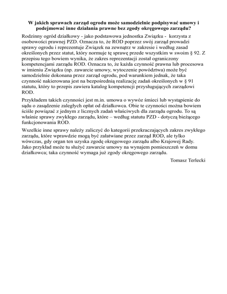 W jakich sprawach zarząd ogrodu może samodzielnie podpisywać umowy i podejmować inne działania prawne bez zgody okręgowego zarządu? Rodzinny ogród działkowy - jako podstawowa jednostka Związku - korzysta z osobowości prawnej PZD. Oznacza to, że ROD poprzez swój zarząd prowadzi sprawy ogrodu i reprezentuje Związek na zewnątrz w zakresie i według zasad określonych przez statut, który normuje tę sprawę przede wszystkim w swoim § 92. Z przepisu tego bowiem wynika, że zakres reprezentacji został ograniczony kompetencjami zarządu ROD. Oznacza to, że każda czynność prawna lub procesowa w imieniu Związku (np. zawarcie umowy, wytoczenie powództwa) może być samodzielnie dokonana przez zarząd ogrodu, pod warunkiem jednak, że taka czynność nakierowana jest na bezpośrednią realizację zadań określonych w § 91 statutu, który to przepis zawiera katalog kompetencji przysługujących zarządowi ROD. Przykładem takich czynności jest m.in. umowa o wywóz śmieci lub wystąpienie do sądu o zasądzenie zaległych opłat od działkowca. Obie te czynności można bowiem ściśle powiązać z jednym z licznych zadań właściwych dla zarządu ogrodu. To są właśnie sprawy zwykłego zarządu, które – według statutu PZD - dotyczą bieżącego funkcjonowania ROD. Wszelkie inne sprawy należy zaliczyć do kategorii przekraczających zakres zwykłego zarządu, które wprawdzie mogą być załatwiane przez zarząd ROD, ale tylko wówczas, gdy organ ten uzyska zgodę okręgowego zarządu albo Krajowej Rady. Jako przykład może tu służyć zawarcie umowy na wynajem pomieszczeń w domu działkowca; taka czynność wymaga już zgody okręgowego zarządu. Tomasz Terlecki