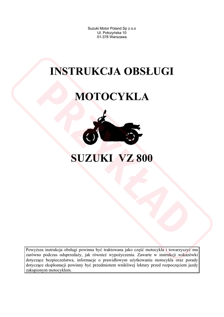 Suzuki Motor Poland Sp z o.o Ul. Połczyńska 10 01-378 Warszawa INSTRUKCJA OBSŁUGI MOTOCYKLA SUZUKI VZ 800 Powyższa instrukcja obsługi powinna być traktowana jako część motocykla i towarzyszyć mu zarówno podczas odsprzedaży, jak również wypożyczenia. Zawarte w instrukcji wskazówki dotyczące bezpieczeństwa, informacje o prawidłowym użytkowaniu motocykla oraz porady dotyczące eksploatacji powinny być przedmiotem wnikliwej lektury przed rozpoczęciem jazdy zakupionym motocyklem. Instrukcja obsługi Suzuki VZ800L0 UWAGA Informacje o docieraniu motocykla. Pierwsze 1.600km jest najważniejsze dla trwałości Twojego motocykla. Pojazdy Suzuki produkowane są w oparciu o wysoko rozwiniętą technologię i przy wykorzystaniu materiałów najwyższej jakości. Prawidłowe dotarcie zapewnia optymalne wzajemne dopasowanie się współpracujących elementów, a co za tym idzie powoduje wydłużenie żywotności i bezawaryjności jednośladu. Przy zachowaniu szczególnej ostrożności w okresie docierania motocykla, jego niezawodność i zdolności użytkowe pozostają nienaruszone. Szczególnie ważnym jest, aby silnik, podczas pracy w tym okresie, nie był zbyt przeciążany. Szczegółowe informacje o docieraniu pojazdu znajdziesz w rozdziale: Docieranie. OSTRZEŻENIE, UWAGA, WAŻNE. Prosimy o dokładne przeczytanie tej instrukcji i ścisłe przestrzeganie zawartych w niej zaleceń. Dla podkreślenia szczególnie ważnych informacji, słowom OSTRZEŻENIE, UWAGA, WAŻNE nadano specjalne znaczenia. Informacje oznaczone tymi nagłówkami wymagają szczególnej uwagi. OSTRZEŻENIE Sygnalizuje potencjalne ryzyko odniesienia obrażeń lub śmierci. UWAGA Należy bezwzględnie przestrzegać podanych zasad w celu ochrony pojazdu. WAŻNE Zawiera specjalne informacje ułatwiające obsługę i pielęgnację maszyny. 2 Instrukcja obsługi Suzuki VZ800L0 PRZEDMOWA Motocyklizm jest jednym z najaktywniejszych sportów. Abyś mógł bezpiecznie korzystać z motocykla należy przed pierwszą jazdą zapoznać się dokładnie z tekstem niniejszej instrukcji. Motocykl wymaga dbałości i odpowiedniej opieki serwisowej. Zasady prawidłowej eksploatacji i serwisowania opisane są w instrukcji. Postępując zgodnie z nimi zapewnisz sobie komfort jazdy, a motocyklowi długi okres bezawaryjnej eksploatacji. Autoryzowane serwisy Suzuki dysponują wyszkolonymi i doświadczonymi mechanikami, którzy przy użyciu odpowiednich narzędzi zagwarantują najlepszy serwis. Wszystkie informacje, szkice, zdjęcia i dane, zamieszczone w tej książeczce, opierają się na informacjach dotyczących produktu, które były aktualne w momencie jej druku. Ulepszenia i inne zmiany mogą jednakże szybko doprowadzić do tego, że zawartość tego podręcznika nie będzie dokładnie odpowiadała produktowi. Suzuki zastrzega sobie w każdej chwili prawo do zmian. Proszę zauważyć, że podręcznik ten opisuje wszystkie wersje wyposażeniowe rozprowadzane we wszystkich regionach sprzedaży. Model, który nabyłeś może być seryjnie inaczej przygotowany i odbiegać od opisanego w niniejszym podręczniku. SUZUKI MOTOR CORPORATION 3 Instrukcja obsługi Suzuki VZ800L0 Spis Treści Informacje dla użytkownika Rozmieszczenie wskaźników, elementów sterowania i wyposażenia Zalecane rodzaje paliwa, oleju i płynu chłodzącego Docieranie i kontrola przed jazdą Reguły bezpiecznej jazdy Przeglądy okresowe Usterki i ich usuwanie Czyszczenie i przechowywanie motocykla Dane Techniczne Indeks 4 5 10 33 38 42 47 86 89 94 96 Instrukcja obsługi Suzuki VZ800L0 Informacje dla użytkownika Korzystanie z akcesoriów i wskazówki do montażu akcesoriów Zasady bezpiecznej jazdy dla motocyklistów Położenie numeru seryjnego 5 6 7 9 Instrukcja obsługi Suzuki VZ800L0 Informacje dla użytkownika Korzystanie z akcesoriów i załadunek motocykla Montaż nieodpowiednich akcesoriów prowadzić może do pogorszenia bezpieczeństwa użytkowania motocykl. Niemożliwe jest, by Suzuki przetestowało wszystkie dostępne na rynku akcesoria, bądź ich kombinacje. Jednakże Twój autoryzowany przedstawiciel Suzuki dopomoże w wyborze odpowiednich akcesoriów i właściwie je zamontuje. Zachowaj szczególną ostrożność przy wyborze i montowaniu akcesoriów w motocyklu. Spytaj o poradę Suzuki jeśli nie jesteś pewien wyboru dodatkowego wyposażenia. OSTRZEŻENIE Używanie nieodpowiednich akcesoriów oraz dokonywanie jakichkolwiek modyfikacji może stać się przyczyną obniżenia bezpieczeństwa osób używających motocykla lub też doprowadzić do wypadku. Zaleca się używanie wyłącznie oryginalnych akcesoriów Suzuki lub ich odpowiedników przetestowanych, zaprojektowanych do odpowiedniego typu motocykla. Postępuj zgodnie z zaleceniami tego rozdziału. Wskazówki do montażu akcesoriów • Montuj akcesoria wpływające na aerodynamikę, takie jak osłony, szyby, oparcia, sakwy i bagażniki tak nisko jak to tylko możliwe. Konstrukcja powinna być zwarta i zamontowana możliwie blisko środka ciężkości motocykla. Upewnij się, że uchwyty i stelaże są sztywno umocowane. • Upewnij się, czy przy pokonywaniu zakrętów będzie istniał bezpieczny odstęp między bagażem, a ziemią. Sprawdź, czy zamontowane wyposażenie nie zakłóca pracy zawieszeń, układu kierowniczego lub innych urządzeń motocykla. • Akcesoria, które mocuje się na kierownicy lub widelcu koła przedniego również oznaczają dodatkową masę, która powoduje problemy ze stabilnością. Dodatkowy ciężar powodować będzie pogorszone prowadzenie się motocykla. Może doprowadzić on również do oscylacji przedniego koła i do problemów z opanowaniem motocykla. Akcesoria montowane do kierownicy i przednim zawieszeniu należy ograniczyć do minimum. • Niektóre akcesoria wypierają prowadzącego z jego normalnej pozycji siedzącej i tym samym ograniczają swobodę ruchów i zdolność kontrolowania pojazdu. • Akcesoria elektryczne oznaczają dodatkowe o
