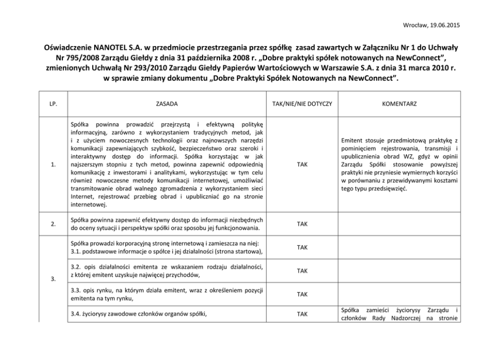 Wrocław, 19.06.2015 Oświadczenie NANOTEL S.A. w przedmiocie przestrzegania przez spółkę zasad zawartych w Załączniku Nr 1 do Uchwały Nr 795/2008 Zarządu Giełdy z dnia 31 października 2008 r. „Dobre praktyki spółek notowanych na NewConnect”, zmienionych Uchwałą Nr 293/2010 Zarządu Giełdy Papierów Wartościowych w Warszawie S.A. z dnia 31 marca 2010 r. w sprawie zmiany dokumentu „Dobre Praktyki Spółek Notowanych na NewConnect”. LP. ZASADA TAK/NIE/NIE DOTYCZY KOMENTARZ 1. Spółka powinna prowadzić przejrzystą i efektywną politykę informacyjną, zarówno z wykorzystaniem tradycyjnych metod, jak i z użyciem nowoczesnych technologii oraz najnowszych narzędzi komunikacji zapewniających szybkość, bezpieczeństwo oraz szeroki i interaktywny dostęp do informacji. Spółka korzystając w jak najszerszym stopniu z tych metod, powinna zapewnić odpowiednią komunikację z inwestorami i analitykami, wykorzystując w tym celu również nowoczesne metody komunikacji internetowej, umożliwiać transmitowanie obrad walnego zgromadzenia z wykorzystaniem sieci Internet, rejestrować przebieg obrad i upubliczniać go na stronie internetowej. TAK Emitent stosuje przedmiotową praktykę z pominięciem rejestrowania, transmisji i upublicznienia obrad WZ, gdyż w opinii Zarządu Spółki stosowanie powyższej praktyki nie przyniesie wymiernych korzyści w porównaniu z przewidywanymi kosztami tego typu przedsięwzięć. 2. Spółka powinna zapewnić efektywny dostęp do informacji niezbędnych do oceny sytuacji i perspektyw spółki oraz sposobu jej funkcjonowania. TAK Spółka prowadzi korporacyjną stronę internetową i zamieszcza na niej: 3.1. podstawowe informacje o spółce i jej działalności (strona startowa), TAK 3.2. opis działalności emitenta ze wskazaniem rodzaju działalności, z której emitent uzyskuje najwięcej przychodów, TAK 3.3. opis rynku, na którym działa emitent, wraz z określeniem pozycji emitenta na tym rynku, TAK 3.4. życiorysy zawodowe członków organów spółki, TAK 3. Spółka zamieści życiorysy Zarządu i członków Rady Nadzorczej na stronie Wrocław, 19.06.2015 3.5. powzięte przez zarząd, na podstawie oświadczenia członka rady nadzorczej, informacje o powiązaniach członka rady nadzorczej z akcjonariuszem dysponującym akcjami reprezentującymi nie mniej niż 5% ogólnej liczby głosów na walnym zgromadzeniu spółki, TAK 3.6. dokumenty korporacyjne spółki, NIE 3.7. zarys planów strategicznych spółki, TAK 3.8. opublikowane prognozy wyników finansowych na bieżący rok obrotowy, wraz z założeniami do tych prognoz oraz korektami do tych prognoz (w przypadku gdy emitent publikuje prognozy), TAK 3.9. strukturę akcjonariatu emitenta, ze wskazaniem głównych akcjonariuszy oraz akcji znajdujących się w wolnym obrocie, 3.10. dane oraz kontakt do osoby, która jest odpowiedzialna w spółce za relacje inwestorskie oraz kontakty z mediami, TAK TAK 3.11. (skreślony) 3.12. opublikowane raporty bieżące i okresowe, TAK 3.13. kalendarz zaplanowanych dat publikacji finansowych raportów okresowych, dat walnych zgromadzeń, a także spotkań z inwestorami i analitykami oraz konferencji prasowych, TAK www.nanotel.pl w zakładce „Relacje Inwestorskie” Informacje zawarte są w Dokumencie Informacyjnym, który zostanie umieszczony w zakładce „Relacje Inwestorskie” na stronie www.nanotel.pl Spółka zamieści na swojej stronie internetowej treść tekstu jednolitego statutu Spółki, natomiast na razie nie zostały sporządzone Regulamin WZ, Regulamin RN i Regulamin Zarządu i w najbliższym czasie spółka nie zamierza tworzyć tych dokumentów. Spółka opublikuje prognozy na swojej stronie internetowej www.nanotel.pl w zakładce „Relacje Inwestorskie”. Na stronie www.nanotel.pl w zakładce „Relacje Inwestorskie” – Spółka na bieżąco będzie aktualizować strukturę akcjonariatu po każdej istotnej zmianie w tej strukturze. Spółka umieści taką informację na stronie www.nanotel.pl w zakładce „Relacje Inwestorskie”. Wrocław, 19.06.2015 3.14. informacje na temat zdarzeń korporacyjnych, takich jak wypłata dywidendy, oraz innych zdarzeń skutkujących nabyciem lub ograniczeniem praw po stronie akcjonariusza, z uwzględnieniem terminów oraz zasad przeprowadzania tych operacji. Informacje te powinny być zamieszczane w terminie umożliwiającym podjęcie przez inwestorów decyzji inwestycyjnych, TAK Jeżeli wystąpią takie zdarzenia korporacyjne to informacje będą umieszczone na stronie www.nanotel.pl w zakładce „Relacje Inwestorskie”. 3.15. (skreślony) 3.16. pytania akcjonariuszy dotyczące spraw objętych porządkiem obrad, zadawane przed i w trakcie walnego zgromadzenia, wraz z odpowiedziami na zadawane pytania, NIE 3.17. informację na temat powodów odwołania walnego zgromadzenia, zmiany terminu lub porządku obrad wraz z uzasadnieniem, TAK 3.18. informację o przerwie w obradach walnego zgromadzenia i powodach zarządzenia przerwy, TAK 3.19. informacje na temat podmiotu, z którym spółka podpisała umowę o świadczenie usług Autoryzowanego Doradcy ze wskazaniem nazwy, adresu strony internetowej, numerów telefonicznych oraz adresu poczty elektronicznej Doradcy, TAK 3.20. Informację na temat podmiotu, który pełni funkcję animatora akcji emitenta, TAK W związku z małą ilością zapytań akcjonariuszy, koniecznością ich dodatkowego protokołowania oraz faktu iż najczęściej dotyczą one spraw porządkowych walnego zgromadzenia, Spółka nie decyduje się na stosowanie przedmiotowej praktyki. Informacja taka zostanie umieszczona na stronie www.nanotel.pl w zakładce „Relacje Inwestorskie”. Informacja taka zostanie umieszczona na stronie www.nanotel.pl w zakładce „Relacje Inwestorskie”. Wrocław, 19.06.2015 3.21. dokument informacyjny (prospekt emisyjny) spółki, opublikowany w ciągu ostatnich 12 miesięcy, Informacja taka zostanie umieszczona na stronie www.nanote