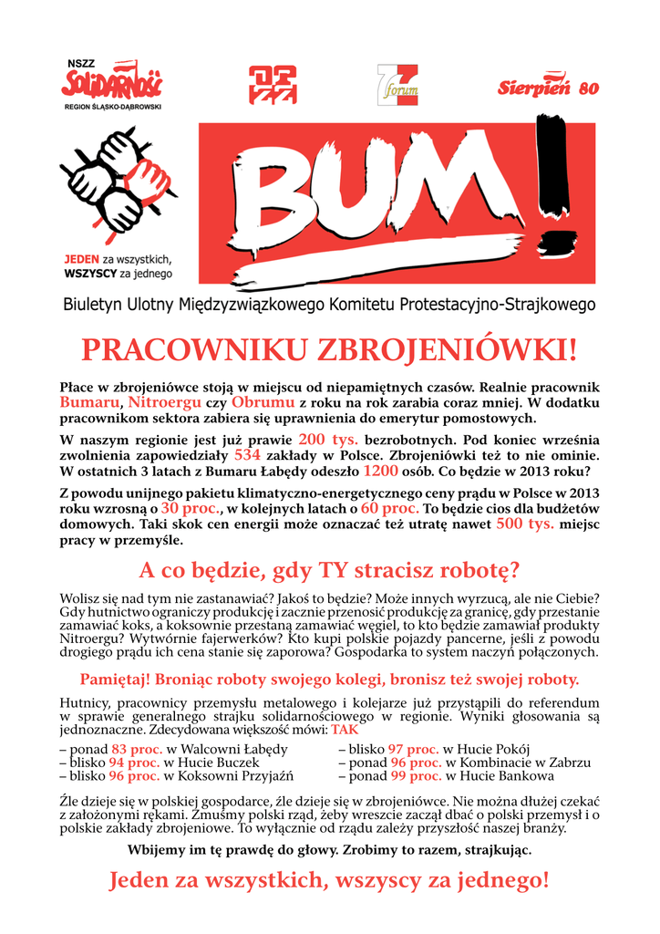 PRACOWNIKU ZBROJENIÓWKI! Płace w zbrojeniówce stoją w miejscu od niepamiętnych czasów. Realnie pracownik Bumaru, Nitroergu czy Obrumu z roku na rok zarabia coraz mniej. W dodatku pracownikom sektora zabiera się uprawnienia do emerytur pomostowych. W naszym regionie jest już prawie 200 tys. bezrobotnych. Pod koniec września zwolnienia zapowiedziały 534 zakłady w Polsce. Zbrojeniówki też to nie ominie. W ostatnich 3 latach z Bumaru Łabędy odeszło 1200 osób. Co będzie w 2013 roku? Z powodu unijnego pakietu klimatyczno-energetycznego ceny prądu w Polsce w 2013 roku wzrosną o 30 proc., w kolejnych latach o 60 proc. To będzie cios dla budżetów domowych. Taki skok cen energii może oznaczać też utratę nawet 500 tys. miejsc pracy w przemyśle. A co będzie, gdy TY stracisz robotę? Wolisz się nad tym nie zastanawiać? Jakoś to będzie? Może innych wyrzucą, ale nie Ciebie? Gdy hutnictwo ograniczy produkcję i zacznie przenosić produkcję za granicę, gdy przestanie zamawiać koks, a koksownie przestaną zamawiać węgiel, to kto będzie zamawiał produkty Nitroergu? Wytwórnie fajerwerków? Kto kupi polskie pojazdy pancerne, jeśli z powodu drogiego prądu ich cena stanie się zaporowa? Gospodarka to system naczyń połączonych. Pamiętaj! Broniąc roboty swojego kolegi, bronisz też swojej roboty. Hutnicy, pracownicy przemysłu metalowego i kolejarze już przystąpili do referendum w sprawie generalnego strajku solidarnościowego w regionie. Wyniki głosowania są jednoznaczne. Zdecydowana większość mówi: TAK – ponad 83 proc. w Walcowni Łabędy – blisko 97 proc. w Hucie Pokój – blisko 94 proc. w Hucie Buczek – ponad 96 proc. w Kombinacie w Zabrzu – blisko 96 proc. w Koksowni Przyjaźń – ponad 99 proc. w Hucie Bankowa Źle dzieje się w polskiej gospodarce, źle dzieje się w zbrojeniówce. Nie można dłużej czekać z założonymi rękami. Zmuśmy polski rząd, żeby wreszcie zaczął dbać o polski przemysł i o polskie zakłady zbrojeniowe. To wyłącznie od rządu zależy przyszłość naszej branży. Wbijemy im tę prawdę do głowy. Zrobimy to razem, strajkując. Jeden za wszystkich, wszyscy za jednego! W październiku przewodniczący największych central związkowych w regionie: NSZZ Solidarność, OPZZ, Forum Związków Zawodowych i WZZ Sierpień 80 powołali Międzyzwiązkowy Komitet Protestacyjno-Strajkowy. Żyjemy w kraju, w którym formalnie nie można ogłosić strajku generalnego przeciwko rządowi. Takie prawo nam stworzono. Na szczęście nie zakazano generalnego strajku solidarnościowego, czyli takiego, w którym pracownicy jednego zakładu strajkują w obronie pracowników innego zakładu, którzy nie mają prawa do strajku. I z tej możliwości Międzyzwiązkowy Komitet Protestacyjno-Strajkowy chce skorzystać. Przygotowujemy się do strajku w obronie pracowników sądownictwa, ale najważniejsze są postulaty strajkowe zgłoszone przez MKPS. Te postulaty dotyczą każdego z nas, każdej branży, każdego zakładu. NASZE POSTULATY: MKPS domaga się: 1. Stworzenia osłonowego systemu regulacji finansowych oraz ulg podatkowych dla przedsiębiorstw utrzymujących zatrudnienie w okresie niezawinionego przestoju produkcyjnego. (Chodzi o to, aby przedsiębiorstwa nie zwalniały ludzi i nie likwidowały miejsc pracy w czasie kryzysu, tylko razem z rządem płaciły postojowe) 2. Wprowadzenia systemu rekompensat dla przedsiębiorstw objętych skutkami pakietu klimatyczno-energetycznego. (Chodzi o to, aby rząd wspierał przedsiębiorstwa, która wykańcza zbyt drogi prąd, bo inaczej te zakłady i miejsca pracy zostaną przeniesione za wschodnią granicę) 3. Ograniczenia stosowania umów śmieciowych. (Chodzi o to, aby ludzie mieli stałą i stabilną pracę, aby mogli odkładać na emerytury) 4. Likwidacja NFZ. (Chodzi o to, aby nasze składki trafiały na leczenie pacjentów w naszym regionie, a nie były przejadane przez urzędników w Warszawie) 5. Utrzymania rozwiązań emerytalnych, przysługujących pracownikom zatrudnionym w warunkach szczególnych i szczególnym charakterze. (Chodzi o utrzymanie emerytur pomostowych na wcześniejszych, sprawiedliwych zasadach, aby ludzie przed emeryturą nie trafiali na bruk bez środków do życia). 10 grudnia rusza referendum w Twoim zakładzie. W następnych tygodniach w kolejnych branżach. Wystarczy, że powiesz TAK Rząd oderwał się od rzeczywistości i wydaje mu się, że problemy pracowników i pracodawców nie są ich problemami. Trzeba nim wstrząsnąć, albo zmienić. Zanim będzie za późno. Naszą najmocniejszą i najskuteczniejszą bronią jest strajk. Oni strajku się boją. Kiedy wspólnie razem zaprotestują hutnicy, kolejarze, górnicy, zbrojeniówka, służba zdrowia, oświata, zakłady motoryzacyjne i przemysłowe, kiedy staną autobusy i tramwaje, to rząd nie będzie mógł już dalej wciskać kitu, że jesteśmy na zielonej wyspie, że tylko nielicznym gorzej się powodzi, a reszta ma się świetnie. Prawda jest taka, że wszystkim coraz gorzej się powodzi poza rządzącymi i ludźmi, którymi poobsadzali stołki. Możemy ich od tych stołków oderwać i zmusić do uczciwej roboty. Warunek jest jeden. Musimy to zrobić razem! Jeden za wszystkich, wszyscy za jednego!