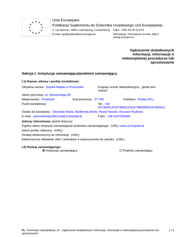 Unia Europejska Publikacja Suplementu do Dziennika Urzędowego Unii Europejskiej 2, rue Mercier, 2985 Luxembourg, Luksemburg Faks: +352 29 29 42 670 E-mail: [email protected] Informacje i formularze on-line: http:// simap.europa.eu Ogłoszenie dodatkowych informacji, informacje o niekompletnej procedurze lub sprostowanie Sekcja I: Instytucja zamawiająca/podmiot zamawiający I.1) Nazwa, adresy i punkty kontaktowe: Oficjalna nazwa: Szpital Miejski w Przemyślu Krajowy numer identyfikacyjny: (jeżeli jest znany) _____ Adres pocztowy: ul. Słowackiego 85 Miejscowość: Przemyśl Kod pocztowy: 37-700 Punkt kontaktowy: _____ Państwo: Polska (PL) Tel.: +48 167360513/167360511/0167360509/0167360512 Osoba do kontaktów: Głowniak Maria, Bartłomiej Mirek, Paweł Nowak, Ryszard Rudnicki E-mail: [email protected] Faks: +48 0167360585 Adresy internetowe: (jeżeli dotyczy) Ogólny adres instytucji zamawiającej/ podmiotu zamawiającego: (URL) www.114szpital.pl Adres profilu nabywcy: (URL) _____ Dostęp elektroniczny do informacji: (URL) _____ Elektroniczne składanie ofert i wniosków o dopuszczenie do udziału: (URL) _____ I.2) Rodzaj zamawiającego: Instytucja zamawiająca Podmiot zamawiający PL Formularz standardowy 14 - Ogłoszenie dodatkowych informacji, informacje o niekompletnej procedurze lub sprostowanie 1/6 Sekcja II: Przedmiot zamówienia II.1.1) Nazwa nadana zamówieniu: Dostawy leków II.1.2) Krótki opis zamówienia lub zakupu: (podano w pierwotnym ogłoszeniu) Przedmiotem zamówienia są dostawy leków. Szczegółowy opis przedmiotu zamówienia: Nr i nazwa pakietu 1 Leki znieczulające I, 2 Leki znieczulające II , 3 Leki przeciwkrzepliwe I, 4 Leki ogólnie znieczulające I, 5 Leki ogólnie znieczulające II, 6 Leki różne I, 7 Leki różne II, 8 Leki różne III, 9 Leki różne IV, 10 Jodowy, niejonowy środek kontrastowy I, 11 Leki różne V, 12 Jodowy, niejonowy środek kontrastowy II, 13 Żywienie dojelitowe, 14 Leki różne VI, 15 Leki różne VII, 16 Leki różne VIII, 17 Leki różne IX, 18 Leki różne X, 19 Paski do gleukometrów, 20 Leki różne XI, 21 Leki różne XII, 22 Leki różne XIII, 23 Leki różne XIV, 24 Leki różne XV, 25 Leki różne XVI , 26 Leki różne XVII, 27 Leki różne XVIII, 28 Leki różne XIX, 29 Leki różne XX, 30 Leki różne XXI, 31 Leki różne XXII , 32 Leki różne XXIII, 33 Leki różne XXIV, 34 Leki różne XXV, 35 Leki różne XXVI, PL Formularz standardowy 14 - Ogłoszenie dodatkowych informacji, informacje o niekompletnej procedurze lub sprostowanie 2/6 36 Leki różne XXVII, 37 Leki różne XXVIII, 38 Leki różne - płyny infuzyjne I, 39 Leki różne - płyny infuzyjne II, 40 Leki różne - płyny infuzyjne III , 41 Leki różne - płyny infuzyjne IV, 42 Leki różne XXIX, 43 Leki różne XXX, 44 Leki różne XXXI, 45 Leki różne - antybiotyki I, 46 Leki różne - antybiotyki II, 47 Leki różne - antybiotyki III, 48 Leki różne XXXII, 49 Leki przeciwkrzepliwe II, 50 Żywienie pozajelitowe, 51 Witaminy i pierwiastki śladowe, 52 Substancje recepturowe, 53 Płyn dializacyjny, 54 Leki różne XXXIII, 55 Leki różne XXXIV, 56 Leki różne XXXV, 57 Leki różne XXXVI, 58 Leki odurzające, 59 Leki różne XXXVII, Warunki dodatkowe: - dla Pakietu Nr 4: wraz z pierwszą dostawą Wykonawca zobowiązany jest dostarczyć i wydzierżawić na czas obowiązywania umowy 5 parowników kompatybilnych do preparatu, będącego przedmiotem oferty Wykonawcy. - dla Pakietu Nr 5: wraz z pierwszą dostawą Wykonawca zobowiązany jest dostarczyć i wydzierżawić na czas obowiązywania umowy 2 parowniki kompatybilne do preparatu, będącego przedmiotem oferty Wykonawcy. - dla Pakietu Nr 10: w zakresie Pakietu 10 Zamawiający dopuszcza możliwość zaoferowania preparatów równoważnych o tym samym stężeniu jodu, a dla preparatu o stężeniu 370mg/J/ml-preparatu o stężeniu równoważnym diagnostycznie 350-370mgJ/ml. Preparaty z możliwością podawania doustnego. - dla Pakietu Nr 12: w zakresie Pakietu 12 Zamawiający dopuszcza możliwość zaoferowania preparatów równoważnych o tym samym stężeniu jodu. - dla Pakietu Nr 13: w zakresie Pakietu 13 Wykonawca użyczy Zamawiającemu na czas trwania umowy pompy do podaży żywienia dojelitowego w ilości 4 szt. Zestawienie asortymentowo-ilościowe dla poszczególnych pakietów przedstawia załącznik nr 3 (odpowiednio 3.1 – 3.59) do Specyfikacji, będący jednocześnie Formularzami cenowymi. Wielkość przedmiotu zamówienia może ulec wahaniom w wyniku zmniejszenia się zapotrzebowania. Zmiana, o której mowa powyżej nie może przekroczyć 30% całkowitej wielkości zamówienia. Zamawiający zastrzega sobie prawo do dokonania przesunięć ilościowych pomiędzy poszczególnymi pozycjami asortymentowymi będącymi przedmiotem umowy zawartej na podstawie niniejszego postępowania. Przesunięcia nie mogą przekroczyć 30% ilości danej pozycji asortymentowej oraz w ramach ogólnej wartości zamówienia i będą dokonywane w oparciu o ceny jednostkowe, w ramach poszczególnych pakietów. W przypadku zaprzestania lub zawieszenia produkcji danej pozycji asortymentowej na dłuższy okres przez producenta, Wykonawca - winien dostarczyć Zamawiającemu, na jego żądanie, lek zastępczy o tej samej nazwie chemicznej, po cenie jednostkowej nie wyższej niż cena umowna leku, którego produkcji zaprzestano, po uprzednim udokumentowaniu faktu zaprzestania lub zawieszenia produkcji leku przez producenta. PL Formularz standardowy 14 - Ogłoszenie dodatkowych informacji, informacje o niekompletnej procedurze lub sprostowanie 3/6 W przypadku leków wstrzymanych lub wycofanych w oparciu o rozporządzenie MZiOS w sprawie określenia szczegółowych zasad i trybu wstrzymywania i wycofywania z obrotu produktów leczniczych i wyrobów medycznych z dnia 12 marca 2008 r. (Dz.U. z dnia 4.04.2008, Nr 57, poz. 347), Wykonawca zobowiązany jest przesłać Zamawiającemu stosowną informację w formie faxu: - w godzinach 7.3