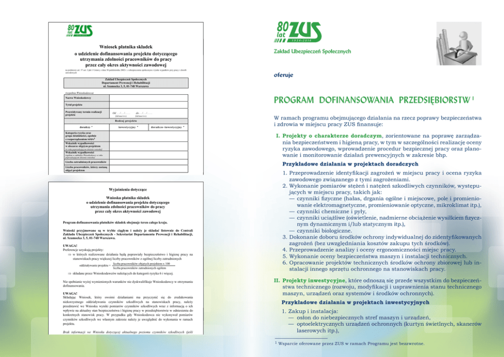 Wniosek płatnika składek o udzielenie dofinansowania projektu dotyczącego utrzymania zdolności pracowników do pracy przez cały okres aktywności zawodowej Zakład Ubezpieczeń Społecznych na podstawie art. 37 ust. 2 pkt 1 Ustawy z dnia 30 października 2002 r. o ubezpieczeniu społecznym z tytułu wypadków przy pracy i chorób zawodowych Zakład Ubezpieczeń Społecznych Departament Prewencji i Rehabilitacji ul. Szamocka 3, 5, 01-748 Warszawa (wypełnia Wnioskodawca) oferuje PROGRAM DOFINANSOWANIA PRZEDSIĘBIORSTW 1 Nazwa Wnioskodawcy Tytuł projektu Przewidywany termin realizacji projektu Od . . / . . / . . . . (dd/mm/rrrr) do . . / . . / . . . . (dd/mm/rrrr) Rodzaj projektu doradczy inwestycyjny doradczo–inwestycyjny Kategoria ryzyka oraz grupa działalności, zgodnie z rozporządzeniem MPiPS1 Wskaźnik wypadkowości w obszarze objętym projektem W ramach programu obejmującego działania na rzecz poprawy bezpieczeństwa i zdrowia w miejscu pracy ZUS finansuje: I.Projekty o charakterze doradczym, zorientowane na poprawę zarządzania bezpieczeństwem i higieną pracy, w tym w szczególności realizację oceny ryzyka zawodowego, wprowadzenie procedur bezpiecznej pracy oraz planowanie i monitorowanie działań prewencyjnych w zakresie bhp. (w roku poprzedzającym złożenie wniosku) Wskaźnik wypadkowości (ogółem w zakładzie Wnioskodawcy w roku poprzedzającym złożenie wniosku) Liczba zatrudnionych pracowników Przykładowe działania w projektach doradczych Liczba pracowników, którzy zostaną objęci projektem (wypełnia ZUS) Numer wniosku (numer sprawy) Data wpływu kompletnego wniosku Wyjaśnienia dotyczące Wniosku płatnika składek o udzielenie dofinansowania projektu dotyczącego utrzymania zdolności pracowników do pracy przez cały okres aktywności zawodowej 1 Rozporządzenie Ministra Pracy i Polityki Społecznej z dnia 14 marca 2012 r. zmieniające rozporządzenie w sprawie różnicowania stopy procentowej składki na ubezpieczenie społeczne z tytułu wypadków przy pracy i chorób zawodowych w zależności od zagrożeń zawodowych i ich skutków (Dz. U. z 2012 r., poz. 285) Wniosek płatnika składek o udzielenie dofinansowania projektu dotyczącego utrzymania zdolności pracowników do pracy przez cały okres aktywności zawodowej Program dofinansowania płatników składek obejmuje teren całego kraju. 1 Wnioski przyjmowane są w trybie ciągłym i należy je składać listownie do Centrali Zakładu Ubezpieczeń Społecznych - Sekretariat Departamentu Prewencji i Rehabilitacji, ul. Szamocka 3, 5, 01-748 Warszawa. UWAGA! Preferencje uzyskują projekty: w których realizowane działania będą poprawiały bezpieczeństwo i higienę pracy na stanowiskach pracy większej liczby pracowników z ogólnej liczby zatrudnionych oddziaływanie projektu = liczba pracowników objętych projektem x 100 liczba pracowników zatrudnionych ogółem składane przez Wnioskodawców należących do kategorii ryzyka 6 i więcej. Nie spełnianie wyżej wymienionych warunków nie dyskwalifikuje Wnioskodawcy w otrzymaniu dofinansowania. UWAGA! Składając Wniosek, który swoimi działaniami ma przyczynić się do zredukowania niekorzystnego oddziaływania czynników szkodliwych na stanowiskach pracy, należy przedstawić we Wniosku wyniki pomiarów czynników szkodliwych wraz z informacją o ich wpływie na aktualny stan bezpieczeństwa i higienę pracy w przedsiębiorstwie w odniesieniu do konkretnych stanowisk pracy. W przypadku gdy Wnioskodawca nie wykonywał pomiarów czynników szkodliwych we własnym zakresie należy je uwzględnić do wykonania w ramach projektu. Brak informacji we Wniosku dotyczącej aktualnego poziomu czynników szkodliwych (jeśli występują) może skutkować wezwaniem Wnioskodawcy do uzupełnienia dokumentacji o te informacje a tym samym przedłuży czas oczekiwania na końcową ocenę Wniosku. Wykonanie pomiarów wraz z przygotowaniem dokumentacji interpretującej uzyskane wyniki pomiarów w odniesieniu do stanowisk pracy, których projekt dotyczy, należy wymienić tylko w części doradczej Wniosku. 1.P rzeprowadzenie identyfikacji zagrożeń w miejscu pracy i ocena ryzyka zawodowego związanego z tymi zagrożeniami. 2.Wykonanie pomiarów stężeń i natężeń szkodliwych czynników, występujących w miejscu pracy, takich jak: — czynniki fizyczne (hałas, drgania ogólne i miejscowe, pole i promieniowanie elektromagnetyczne, promieniowanie optyczne, mikroklimat itp.), — czynniki chemiczne i pyły, — czynniki uciążliwe (oświetlenie, nadmierne obciążenie wysiłkiem fizycznym dynamicznym i/lub statycznym itp.), — czynniki biologiczne. 3.Dokonanie doboru środków ochrony indywidualnej do zidentyfikowanych zagrożeń (bez uwzględniania kosztów zakupu tych środków). 4.P rzeprowadzenie analizy i oceny ergonomiczności miejsc pracy. 5.Wykonanie oceny bezpieczeństwa maszyn i instalacji technicznych. 6.Opracowanie projektów technicznych środków ochrony zbiorowej lub instalacji innego sprzętu ochronnego na stanowiskach pracy. II.Projekty inwestycyjne, które odnoszą się przede wszystkim do bezpieczeństwa technicznego (rozwoju, modyfikacji i usprawnienia stanu technicznego maszyn, urządzeń oraz systemów i środków ochronnych). Przykładowe działania w projektach inwestycyjnych 1.Zakup i instalacja: — osłon do niebezpiecznych stref maszyn i urządzeń, —optoelektrycznych urządzeń ochronnych (kurtyn świetlnych, skanerów laserowych itp.), 1 Wsparcie oferowane przez ZUS w ramach Programu jest bezzwrotne. — urządzeń ochronnych czułych na nacisk (mat, podłóg, obrzeży, krawędzi itp.), —elementów systemów sterowania realizujących funkcje bezpieczeństwa (oburęcznych urządzeń sterujących, urządzeń blokujących zezwalających, wyłączników krańcowych itp.), —kabin i obudów dźwiękoizolacyjnych lub dźwiękochłonnoizolacyjnych, —obudów, osłon i ekranów chroniących przed promieniowaniem optycznym,