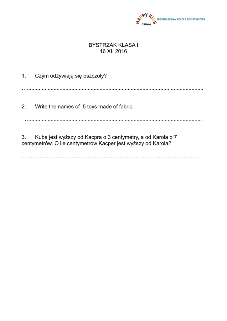BYSTRZAK KLASA I 16 XII 2016 1. Czym odżywiają się pszczoły? …....................................................................................................................... 2. Write the names of 5 toys made of fabric. ….................................................................................................................... 3. Kuba jest wyższy od Kacpra o 3 centymetry, a od Karola o 7 centymetrów. O ile centymetrów Kacper jest wyższy od Karola? ……………………………………………………………………………………….. Bystrzak klasa III 16 XII 2016 1. To nie jest młotek, a ciągle stuka. A kto chce to znaleźć, niech w sobie szuka. …………………………………………………………………………. 2. What are the names of the only two mammals that can lay eggs? …..…………………………………………………………………....... 3. W każdym z dwóch koszyków było po 14 jabłek. Kasia zabrała z pierwszego koszyka pewną ich ilość, a następnie Zosia zabrała z drugiego koszyka tyle jabłek, ile pozostało w koszyku pierwszym. Ile łącznie jabłek pozostało w końcu w obu koszykach? …………………………………………………………………………… BYSTRZAK KL II 1. Tata Kacpra jest starszy od jego mamy o 3 lata. Obecnie tata ma 42 lat. Ile lat miała mama 12 lat temu? ………………………………………………………………………………… 2. Które drzewo iglaste traci igły na zimę? a) sosna b) jodła c) modrzew 3. I live on the farm. I have horns. I moo. I give milk. Who am I? …………………………………………………………………