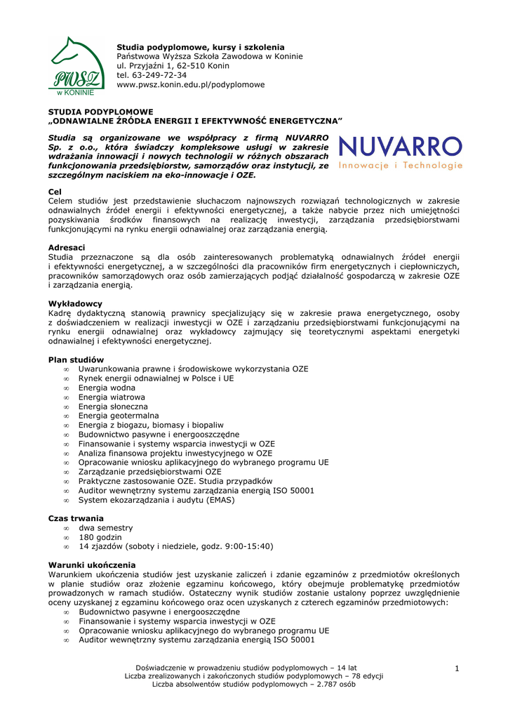 Studia podyplomowe, kursy i szkolenia Państwowa Wyższa Szkoła Zawodowa w Koninie ul. Przyjaźni 1, 62-510 Konin tel. 63-249-72-34 www.pwsz.konin.edu.pl/podyplomowe STUDIA PODYPLOMOWE „ODNAWIALNE ŹRÓDŁA ENERGII I EFEKTYWNOŚĆ ENERGETYCZNA” Studia są organizowane we współpracy z firmą NUVARRO Sp. z o.o., która świadczy kompleksowe usługi w zakresie wdrażania innowacji i nowych technologii w różnych obszarach funkcjonowania przedsiębiorstw, samorządów oraz instytucji, ze szczególnym naciskiem na eko-innowacje i OZE. Cel Celem studiów jest przedstawienie słuchaczom najnowszych rozwiązań technologicznych w zakresie odnawialnych źródeł energii i efektywności energetycznej, a także nabycie przez nich umiejętności pozyskiwania środków finansowych na realizację inwestycji, zarządzania przedsiębiorstwami funkcjonującymi na rynku energii odnawialnej oraz zarządzania energią. Adresaci Studia przeznaczone są dla osób zainteresowanych problematyką odnawialnych źródeł energii i efektywności energetycznej, a w szczególności dla pracowników firm energetycznych i ciepłowniczych, pracowników samorządowych oraz osób zamierzających podjąć działalność gospodarczą w zakresie OZE i zarządzania energią. Wykładowcy Kadrę dydaktyczną stanowią prawnicy specjalizujący się w zakresie prawa energetycznego, osoby z doświadczeniem w realizacji inwestycji w OZE i zarządzaniu przedsiębiorstwami funkcjonującymi na rynku energii odnawialnej oraz wykładowcy zajmujący się teoretycznymi aspektami energetyki odnawialnej i efektywności energetycznej. Plan studiów • Uwarunkowania prawne i środowiskowe wykorzystania OZE • Rynek energii odnawialnej w Polsce i UE • Energia wodna • Energia wiatrowa • Energia słoneczna • Energia geotermalna • Energia z biogazu, biomasy i biopaliw • Budownictwo pasywne i energooszczędne • Finansowanie i systemy wsparcia inwestycji w OZE • Analiza finansowa projektu inwestycyjnego w OZE • Opracowanie wniosku aplikacyjnego do wybranego programu UE • Zarządzanie przedsiębiorstwami OZE • Praktyczne zastosowanie OZE. Studia przypadków • Auditor wewnętrzny systemu zarządzania energią ISO 50001 • System ekozarządzania i audytu (EMAS) Czas trwania • dwa semestry • 180 godzin • 14 zjazdów (soboty i niedziele, godz. 9:00-15:40) Warunki ukończenia Warunkiem ukończenia studiów jest uzyskanie zaliczeń i zdanie egzaminów z przedmiotów określonych w planie studiów oraz złożenie egzaminu końcowego, który obejmuje problematykę przedmiotów prowadzonych w ramach studiów. Ostateczny wynik studiów zostanie ustalony poprzez uwzględnienie oceny uzyskanej z egzaminu końcowego oraz ocen uzyskanych z czterech egzaminów przedmiotowych: • Budownictwo pasywne i energooszczędne • Finansowanie i systemy wsparcia inwestycji w OZE • Opracowanie wniosku aplikacyjnego do wybranego programu UE • Auditor wewnętrzny systemu zarządzania energią ISO 50001 Doświadczenie w prowadzeniu studiów podyplomowych – 14 lat Liczba zrealizowanych i zakończonych studiów podyplomowych – 78 edycji Liczba absolwentów studiów podyplomowych – 2.787 osób 1 Studia podyplomowe, kursy i szkolenia Państwowa Wyższa Szkoła Zawodowa w Koninie ul. Przyjaźni 1, 62-510 Konin tel. 63-249-72-34 www.pwsz.konin.edu.pl/podyplomowe Absolwenci studiów otrzymają: • świadectwo ukończenia studiów podyplomowych • certyfikat auditora wewnętrznego systemu zarządzania energią ISO 50001 wystawiany przez TÜV Akademia Polska Sp. z o.o., • dyplom wystawiany wspólnie przez PWSZ w Koninie i NUVARRO Sp. z o.o. Koszt uczestnictwa około 1600 zł/semestr Doświadczenie w prowadzeniu studiów podyplomowych – 14 lat Liczba zrealizowanych i zakończonych studiów podyplomowych – 78 edycji Liczba absolwentów studiów podyplomowych – 2.787 osób 2