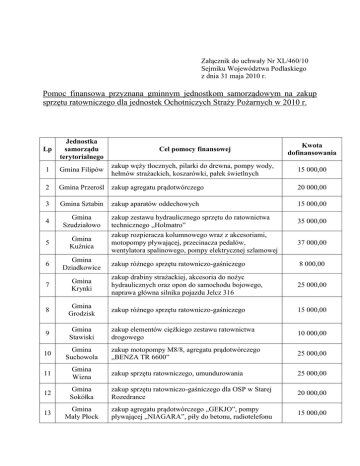 Załącznik do uchwały Nr XL/460/10 Sejmiku Województwa Podlaskiego z dnia 31 maja 2010 r. Pomoc finansowa przyznana gminnym jednostkom samorządowym na zakup sprzętu ratowniczego dla jednostek Ochotniczych Straży Pożarnych w 2010 r. Lp Jednostka samorządu terytorialnego 1 Gmina Filipów 2 Gmina Przerośl zakup agregatu prądotwórczego 3 Gmina Sztabin 4 Gmina Szudziałowo 5 Gmina Kuźnica 6 Gmina Dziadkowice 7 Gmina Krynki 8 Cel pomocy finansowej zakup węży tłocznych, pilarki do drewna, pompy wody, hełmów strażackich, koszarówki, pałek świetlnych zakup aparatów oddechowych zakup zestawu hydraulicznego sprzętu do ratownictwa technicznego „Holmatro” zakup rozpieracza kolumnowego wraz z akcesoriami, motopompy pływającej, przecinacza pedałów, wentylatora spalinowego, pompy elektrycznej szlamowej Kwota dofinansowania 15 000,00 20 000,00 15 000,00 35 000,00 37 000,00 zakup różnego sprzętu ratowniczo-gaśniczego 8 000,00 zakup drabiny strażackiej, akcesoria do nożyc hydraulicznych oraz opon do samochodu bojowego, naprawa główna silnika pojazdu Jelcz 316 25 000,00 Gmina Grodzisk zakup różnego sprzętu ratowniczo-gaśniczego 15 000,00 9 Gmina Stawiski zakup elementów ciężkiego zestawu ratownictwa drogowego 10 000,00 10 Gmina Suchowola zakup motopompy M8/8, agregatu prądotwórczego „BENZA TR 6600” 25 000,00 11 Gmina Wizna zakup sprzętu ratowniczego, umundurowania 25 000,00 12 Gmina Sokółka zakup sprzętu ratowniczo-gaśniczego dla OSP w Starej Rozedrance 20 000,00 13 Gmina Mały Płock zakup agregatu prądotwórczego „GEKJO”, pompy pływającej „NIAGARA”, piły do betonu, radiotelefonu 15 000,00 14 Gmina Łomża 15 Gmina Wasilków 16 17 Gmina Augustów Gmina Nowy Dwór 18 Gmina Lipsk 19 Gmina Czyże 20 21 22 23 Gmina Dubicze Cerkiewne Gmina Rutki Gmina Hajnówka Gmina Klukowo zakup poduszek wysokociśnieniowych dla OSP w Kanarzycach zakup ubrań bojowych NOMEX, hełmów strażackich PH-5, rękawic strażackich, torby ratownictwa przedmedycznego, deski ortopedycznej, agregatu prądotwórczego 4-5 kVA, motopompy poszlakowej oraz masztu oświetleniowego dla OSP w Dąbrówkach i Studzienkach zakup sprzętu ratownictwa wodnego dla OSP AugustówLipowiec zakup m.in. drabiny dwuprzęsłowej, syreny ręcznej, piły spalinowej STIHL MS 361 zakup narzędzi hydraulicznych, oznakowania oraz oświetlenia terenu akcji zakup agregatu prądotwórczego zakup sprzętu ratowniczo-gaśniczego dla OSP w Dubiczach Cerkiewnych zakup pompy spalinowej doposażenie jednostek OSP w sprzęt ratowniczogaśniczy zakup sprzętu ratowniczo-gaśniczego dla OSP w Wyszonkach Kościelnych Łącznie : 10 000,00 25 000,00 15 000,00 10 000,00 10 000,00 20 000,00 15 000,00 10 000,00 10 000,00 10 000,00 400 000,00