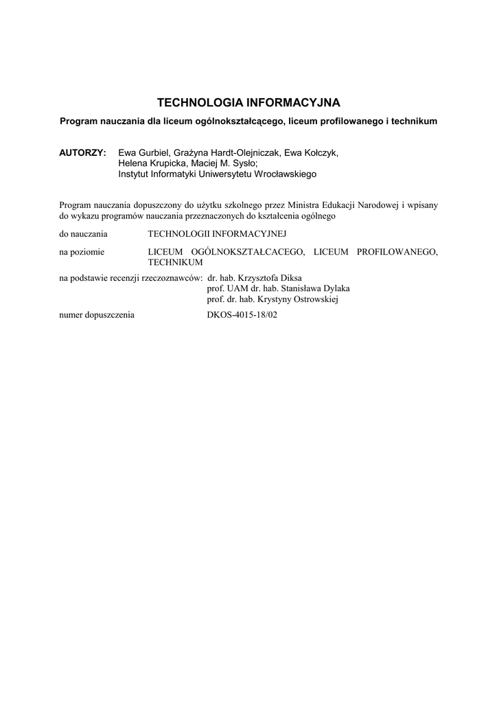 TECHNOLOGIA INFORMACYJNA Program nauczania dla liceum ogólnokształcącego, liceum profilowanego i technikum AUTORZY: Ewa Gurbiel, Grażyna Hardt-Olejniczak, Ewa Kołczyk, Helena Krupicka, Maciej M. Sysło; Instytut Informatyki Uniwersytetu Wrocławskiego Program nauczania dopuszczony do użytku szkolnego przez Ministra Edukacji Narodowej i wpisany do wykazu programów nauczania przeznaczonych do kształcenia ogólnego do nauczania TECHNOLOGII INFORMACYJNEJ na poziomie LICEUM OGÓLNOKSZTAŁCACEGO, LICEUM PROFILOWANEGO, TECHNIKUM na podstawie recenzji rzeczoznawców: dr. hab. Krzysztofa Diksa prof. UAM dr. hab. Stanisława Dylaka prof. dr. hab. Krystyny Ostrowskiej numer dopuszczenia DKOS-4015-18/02 Program technologii informacyjnej dla szkół ponadgimnazjalnych 2 Spis treści Streszczenie 1. Zadania ogólne szkoły i osiągnięcia uczniów 2. Program technologii informacyjnej 3. Technologia informacyjna w innych przedmiotach nauczania w różnych typach szkół ponagimnazjalnych (ta część publikowana będzie w terminie późniejszym) STRESZCZENIE Opracowanie zawiera program nauczania technologii informacyjnej – przedmiotu wchodzącego w skład kształcenia w zakresie podstawowym w liceum ogólnokształcącym, liceum profilowanym i technikum1. Postać tego programu wynika z roli edukacji informatycznej, a w szczególności – technologii informacyjnej, w nauczaniu, zapisanej w Podstawie programowej kształcenia ogólnego2. Program składa się z dwóch części: • programu technologii informacyjnej (rozdz. 2); • wykazu powiązań programu technologii informacyjnej z podstawami programowymi kształcenia ogólnego innych przedmiotów nauczania (ta część publikowana będzie w terminie późniejszym). Rozdział pierwszy zawiera krótkie omówienie ogólnych zadań szkoły i osiągnięć uczniów z punktu widzenia wkładu, jaki może wnieść posługiwanie się technologią informacyjną w ich realizację i osiąganie. Przedstawiony program jest częścią pakietu edukacyjnego dla uczniów i dla nauczycieli szkół ponadgimnazjalnych. Podczas nauki w szkole pakiet ma ułatwić uczniom poruszanie się w świecie globalnej informacji i komunikacji, a jednocześnie wspomagać ich w przygotowywaniu się do dorosłego życia jako obywateli tworzącego się społeczeństwa informacyjnego. Pakiet stanowi pełną realizację zapisów w Podstawie programowej, dotyczących komputerów, technologii informacyjnej i informatyki. Pakiet dla szkół ponadgimnazjalnych jest kontynuacją projektu Spotkania i nauka z komputerem, adresowanego do szkół podstawowych i gimnazjów. 1 2 W dalszej części te trzy typy szkół będziemy nazywać ogólnie szkołami ponadgimnazjalnymi. Załącznik nr 4 do rozporządzenia Ministra Edukacji Narodowej z dnia 26 lutego 2002 r w sprawie podstawy programowej wychowania przedszkolnego oraz kształcenia ogólnego w poszczególnych typach szkół. Program technologii informacyjnej dla szkół ponadgimnazjalnych 3 1. Zadania ogólne szkoły i osiągnięcia uczniów Edukacja, jak każdy obszar działalności człowieka w społeczeństwie, we wszystkich swoich sferach powinna uwzględniać warunki, w których się odbywa, w tym również techniczne warunki życia społeczeństwa. Współczesna technologia informacyjna, która ukształtowała się zastosowaniach komputerów, ma obecnie olbrzymi wpływ na życie człowieka i całych społeczeństw. Powinno to znaleźć odbicie w procesie wychowania i nauczania, by właściwie przygotować przyszłe pokolenia świadomych odbiorców i użytkowników tej technologii, przyszłych obywateli społeczeństwa informacyjnego. Konieczność tę uwzględniono w Podstawie programowej dla kolejnych etapów edukacyjnych, w tym również dla szkół ponadgimnazjalnych – na tym etapie wprowadzono do kształcenia w zakresie podstawowym przedmiot technologia informacyjna. Technologia informacyjna (TI) służy wszechstronnemu posługiwaniu się informacją i komunikowaniu się. Ta wszechstronność dotyczy zarówno zakresu, z którego pochodzi informacja, celów korzystania, jak i sposobów posługiwania się nią. Informacja w nauczaniu może pochodzić z dowolnej dziedziny kształcenia, być wykorzystywana w celach poznawczych i wychowawczych, a dzięki możliwościom współczesnej technologii informacyjnej – znajdować się w dowolnym miejscu na Ziemi. Z technologią informacyjną jest związana jedna z głównych umiejętności, kształconych u uczniów w szkole: Poszukiwania, porządkowania i wykorzystywania informacji z różnych źródeł oraz efektywnego posługiwania się technologią informacyjną. Technologia informacyjna może wspomagać i wzbogacać wszechstronny rozwój uczniów, poprzez udział w realizacji większości zadań stawianych przed szkołą przez Podstawę programową, i zwiększać możliwości rozwijania umiejętności uczniów. W zakresie ogólnych zadań szkoły, technologia ta wspomaga zdobywanie wykształcenia oraz głębsze poznawanie i rozumienie świata przez umożliwienie i ułatwienie docierania do rzeczywistych zasobów informacji. Wzmaga tym samym twórczą aktywność uczniów, pomaga w ujawnianiu i rozwijaniu zainteresowań oraz kierowaniu własnym rozwojem. Wzbogaca również sposoby i umiejętności porozumiewania się. Jej możliwości komunikacyjne mogą być wykorzystane do pogłębiania u uczniów poczucia przynależności do różnych grup społecznych, jak również sprzyjają samoidentyfikacji narodowej i kulturowej. Kształtowanie właściwego korzystania z tej technologii to również wyrabianie świadomości bezpiecznego posługiwania się techniką. Widoczny jest także aspekt wychowawczy: przygotowanie do respektowania norm etycznych i prawnych, poszanowania własności osobistej i intelektualnej oraz wyrabianie otwartości na świat i tolerancji. Stopniowe, metodą spiralną, wprowadzanie uczniów w arkana posługiwania się technologią informacyjną, umożliwia realizację